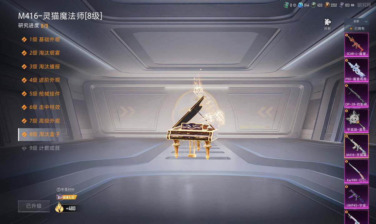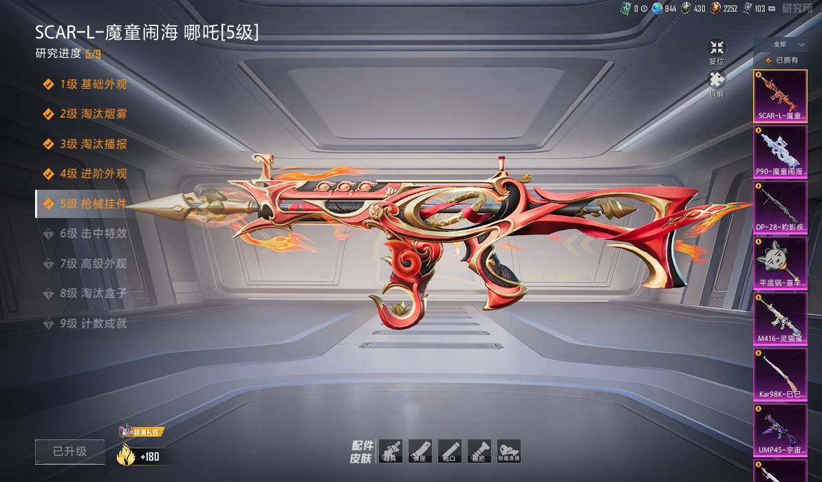 【粉色枪皮等级】:SCAR-L-锦绣绵绵(五级),SCAR-L-魔童闹海 哪吒(五级),M416-心之恋语(一级),M416-电玩时刻(五级),M416-灵猫魔法师(八级),UMP45-宇宙意志(三级),P90-魔童闹海 敖丙(三级),Kar98K-巳巳如意(五级),Mk14-精灵梦叶罗丽(四级),DP-28-豹影疾电(四级),MG3-洛神天依(四级),平底锅-喜羊羊与灰太狼(一级)