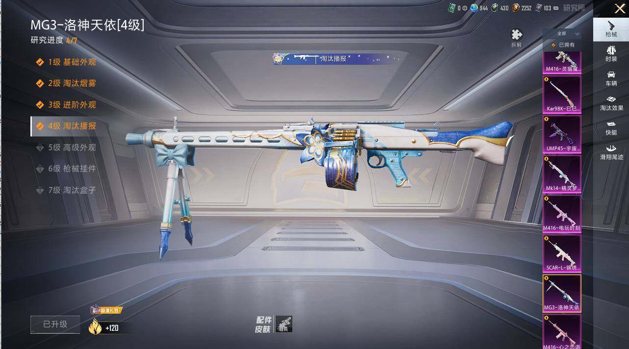 SCAR-L-锦绣绵绵,M416-心之恋语,M416-电玩时刻,UMP45-宇宙意志,Kar98K-巳巳如意,Mk14-精灵梦叶罗丽,MG3-洛神天依