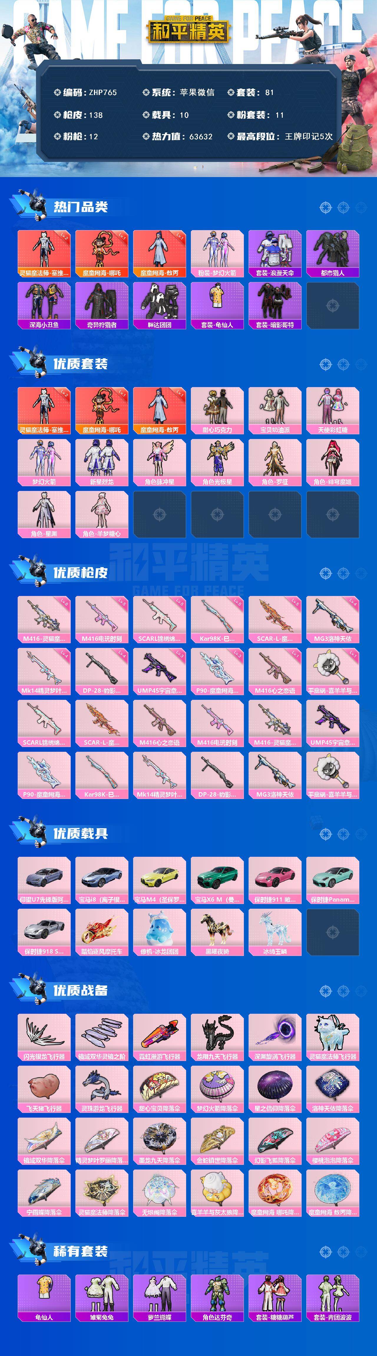 - [15236342]可二次【店主推荐捡漏号!可直接换绑】 苹果 手Q-9粉装-2特效枪-1载具-3粉色飞行器-2.1w热力值-5王牌印记-41套装-61枪皮【热门品类】:粉装-雪国幻梦,套装-深海小丑鱼,套装-暗影哥特【粉色载具】:兰博基尼Aventador SVJ(翡翠绿)【粉色套装】:粉装-雪国幻梦,粉装-天禅智恒,粉装-新星烈龙,粉装-甜心娃娃,粉装-酣梦娃娃,粉装-天之羽翼,粉装-焦糖拿铁,粉装-海盐物语,角色-白兰星【粉色枪皮等级】:M762-甜心娃娃(五级),DP-28-豹影疾电(一级)【粉色飞行器】:梦幻火箭飞行器,绮梦青鸾飞行器,天之羽翼飞行器