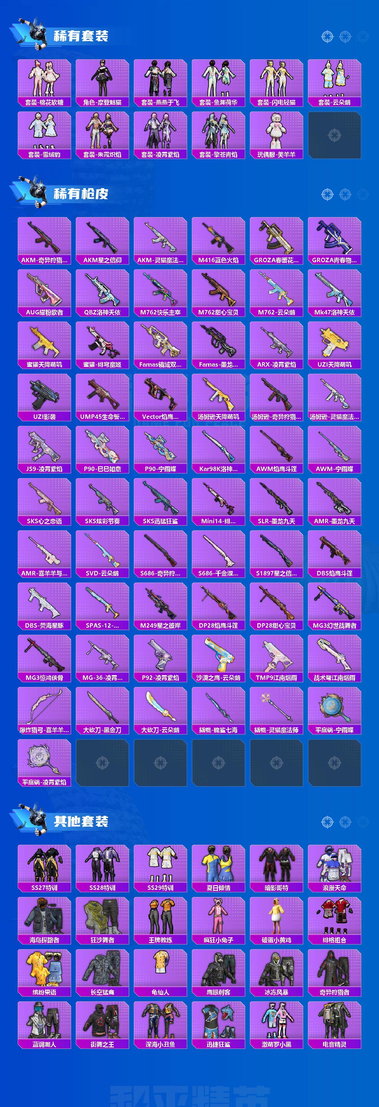 [15636286]【身法素材号/特价急出】都市-暗影哥特-奇异狩猎-8级枪灵猫魔法师-苹果 微信-3神装-11粉装-12特效枪-10载具-8粉色飞行器-63632热力值-5王牌印记-81套装-138枪皮 【红色神装等级】:魔童闹海-敖丙(一级),魔童闹海-哪吒(一级),灵猫魔法师-塞维尔(二级) 【红色角色神装】:魔童闹海-敖丙,魔童闹海-哪吒,灵猫魔法师-塞维尔 【热门品类】:粉装-梦幻火箭,套装-浪漫天命,套装-都市猎人,套装-深海小丑鱼,套装-奇异狩猎者,套装-胖达团团,套装-龟仙人,套装-暗影哥特 【粉色套装】:粉装-甜心巧克力,粉装-宝贝奶油派,粉装-天使彩虹糖,粉装-梦幻火箭,粉装-新星烈龙,角色-脉冲星,角色-光极星,角色-罗征,角色-绯穹魔姬,角色-星渊,角色-羊梦糖心 【粉色枪皮等级】:SCAR-L-锦绣绵绵(五级),SCAR-L-魔童闹海 哪吒(五级),M416-心之恋语(一级),M416-电玩时刻(五级),M416-灵猫魔法师(八级),UMP45-宇宙意志(三级),P90-魔童闹海 敖丙(三级),Kar98K-巳巳如意(五级),Mk14-精灵梦叶罗丽(四级),DP-28-豹影疾电(四级),MG3-洛神天依(四级),平底锅-喜羊羊与灰太狼(一级) 【粉色载具】:仰望U7(阿盖尔紫),宝马i8(离子银),宝马M4(圣保罗黄),宝马X6 M(曼岛绿),保时捷911 敞篷版(星珀红),保时捷Panamera(梦幻青),保时捷918 Spyder(液态银),踏焰逐风摩托车,僚机-冰龙团团,黑曜夜骑,冰绡玉鳞 【粉色枪皮】:SCAR-L-锦绣绵绵,SCAR-L-魔童闹海 哪吒,M416-心之恋语,M416-电玩时刻,M416-灵猫魔法师,UMP45-宇宙意志,P90-魔童闹海 敖丙,Kar98K-巳巳如意,Mk14-精灵梦叶罗丽,DP-28-豹影疾电,MG3-洛神天依,平底锅-喜羊羊与灰太狼 【粉色飞行器】:闪光银龙飞行器,镜域双华-灵镜之阶,霓虹漫游飞行器,龙翔九天飞行器,深渊漩涡飞行器,灵猫魔法师飞行器,飞天猪飞行器,灵珠游龙飞行器 【粉色降落伞】:甜心宝贝降落伞,梦幻火箭降落伞,星之信仰降落伞,洛神天依降落伞,镜域双华降落伞,精灵梦叶罗丽降落伞,墨龙九天降落伞,金蛇镇世降落伞,幻影飞狐降落伞,樱桃泡泡降落伞,宁雨蝶降落伞,灵猫魔法师降落伞,无垠阁降落伞,喜羊羊与灰太