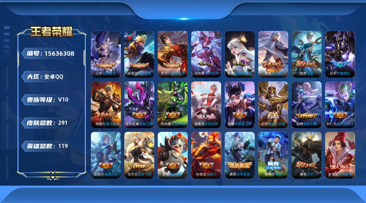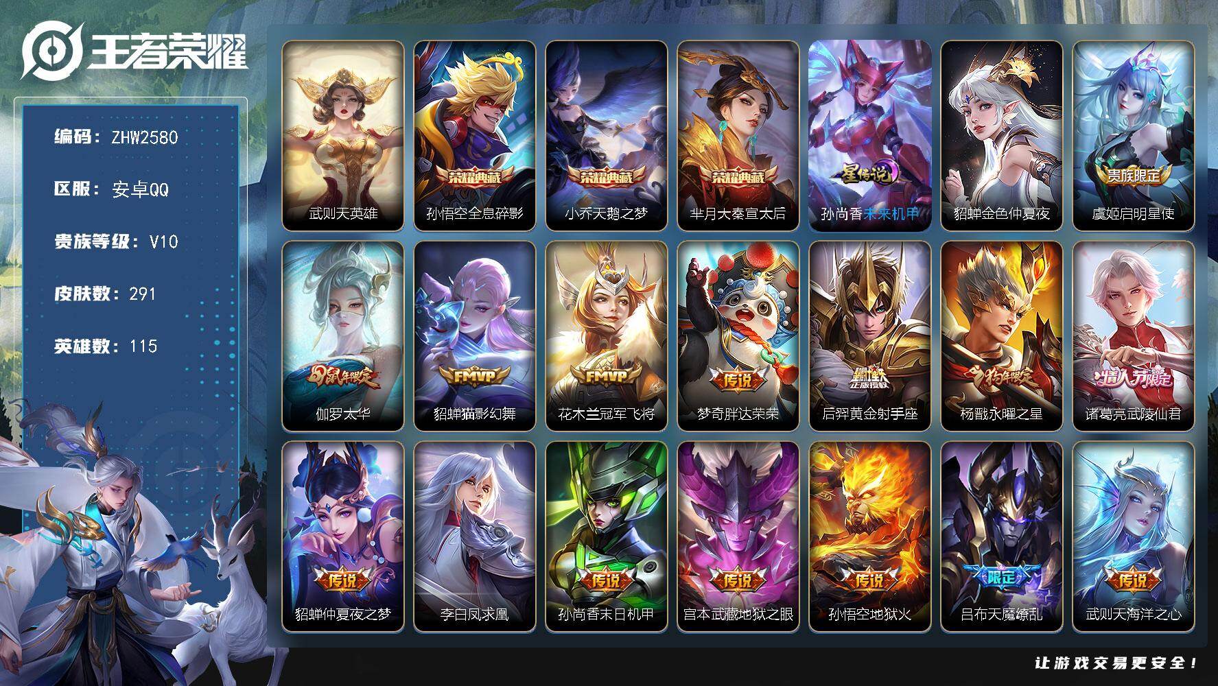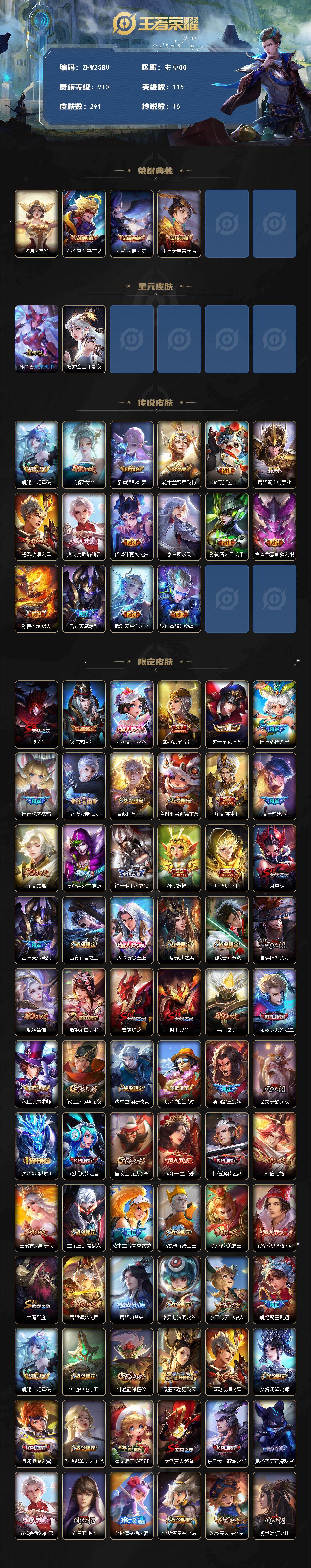 [15636308]安卓Q-V10-永恒钻石III段位-115英雄-291皮肤-3典藏皮肤-1典藏英雄-16传说-86史诗 【荣耀典藏】:武则天英雄,孙悟空全息碎影,小乔天鹅之梦,芈月大秦宣太后 【传说皮肤】:虞姬启明星使,伽罗太华,貂蝉猫影幻舞,花木兰冠军飞将,梦奇胖达荣荣,后羿黄金射手座,杨戬永曜之星,诸葛亮武陵仙君,貂蝉仲夏夜之梦,李白凤求凰,孙尚香末日机甲,宫本武藏地狱之眼,孙悟空地狱火,吕布天魔缭乱,武则天海洋之心,狄仁杰超时空战士 【限定皮肤】:白起狰,狄仁杰阴阳师,小乔纯白花嫁,虞姬凯尔特女王,赵云皇家上将,妲己热情桑巴,妲己时之彼端,嬴政优雅恋人,嬴政白昼王子,鲁班七号狮舞东方,庄周蜃楼王,庄周云端筑梦师,庄周玄嵩,高渐离死亡摇滚,钟无艳王者之锤,孙膑妖精王,扁鹊炼金王,芈月重明,吕布天魔缭乱,吕布猎兽之王,周瑜真爱至上,周瑜赤莲之焰,元歌云间偶戏,夏侯惇朔风刀,甄姬幽恒,甄姬游园惊梦,曹操烛龙,典韦穷奇,典韦岱宗,马可波罗逐梦之星,狄仁杰魔术师,狄仁杰万华元夜,达摩星际陆战队,项羽海滩派对,项羽霸王别姬,老夫子醍醐杖,关羽冰锋战神,貂蝉逐梦之音,程咬金演武夺筹,露娜一生所爱,韩信逐梦之影,韩信飞衡,王昭君凤凰于飞,兰陵王驯魔猎人,花木兰青春决赛季,亚瑟潮玩骑士王,孙悟空美猴王,孙悟空大圣娶亲,牛魔御旌,后羿辉光之辰,后羿如梦令,李元芳银河之约,李元芳云中旅人,虞姬霸王别姬,虞姬启明星使,钟馗神迹守卫,钟馗驱傩正仪,杨玉环遇见飞天,杨戬永曜之星,女娲朔望之晖,哪吒逐梦之翼,雅典娜单词大作战,蔡文姬奇迹圣诞,太乙真人饕餮,东皇太一逐梦之光,鬼谷子原初探秘者,诸葛亮武陵仙君,弈星混沌棋,公孙离蜜橘之夏,沈梦溪星空之诺,沈梦溪大漠名商,明世隐疑决卦,裴擒虎天狼狩猎者,裴擒虎李小龙,裴擒虎擒涛扼浪,狂铁御狮,米莱狄御霄,米莱狄胡桃异想国,伽罗太华,盾山御銮,嫦娥如梦令,蒙犽狂想玩偶喵,鲁班大师探海日志,桑启海盐诗旅,张良古海寻踪,裴擒虎梅西 【年限皮肤】:孙悟空美猴王,王昭君凤凰于飞,李白凤求凰,杨戬永曜之星,后羿辉光之辰,伽罗太华,甄姬幽恒,韩信飞衡,典韦岱宗,庄周玄嵩 【赛季限定】:庄周蜃楼王,孙膑妖精王,扁鹊炼金王,白起狰,芈月重明,夏侯惇朔风刀,曹操烛龙,典韦穷奇,狄仁杰万华元夜,老夫子醍醐杖,程咬金演武夺筹,张良古海寻踪,牛魔御旌,李元芳云中旅人,虞姬凯尔特女王,钟