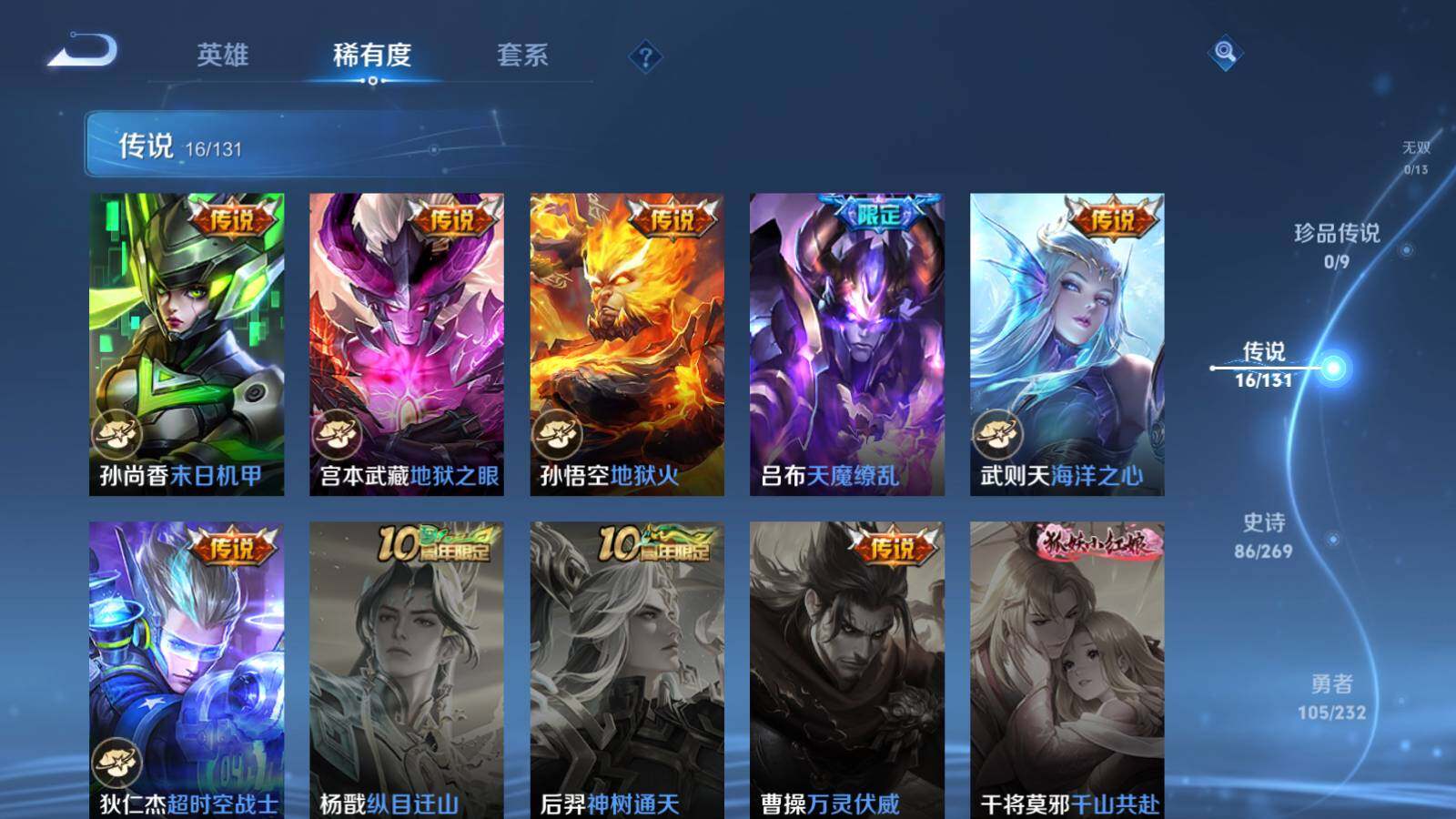 【传说皮肤】:虞姬启明星使,伽罗太华,貂蝉猫影幻舞,花木兰冠军飞将,梦奇胖达荣荣,后羿黄金射手座,杨戬永曜之星,诸葛亮武陵仙君,貂蝉仲夏夜之梦,李白凤求凰,孙尚香末日机甲,宫本武藏地狱之眼,孙悟空地狱火,吕布天魔缭乱,武则天海洋之心,狄仁杰超时空战士