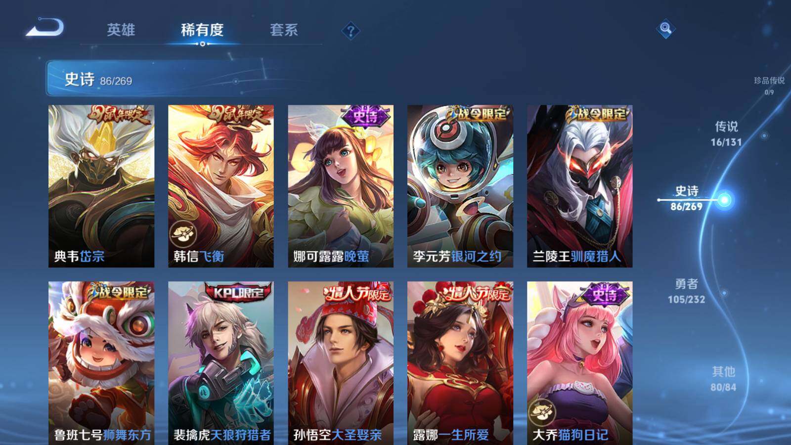 【年限皮肤】:孙悟空美猴王,王昭君凤凰于飞,李白凤求凰,杨戬永曜之星,后羿辉光之辰,伽罗太华,甄姬幽恒,韩信飞衡,典韦岱宗,庄周玄嵩
