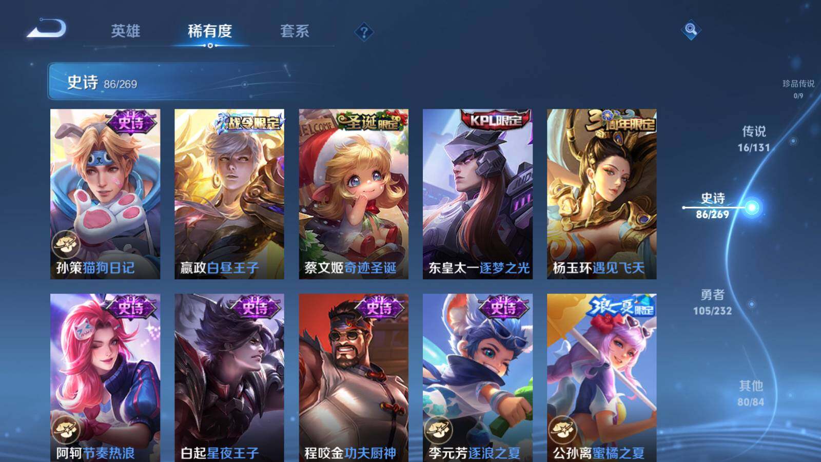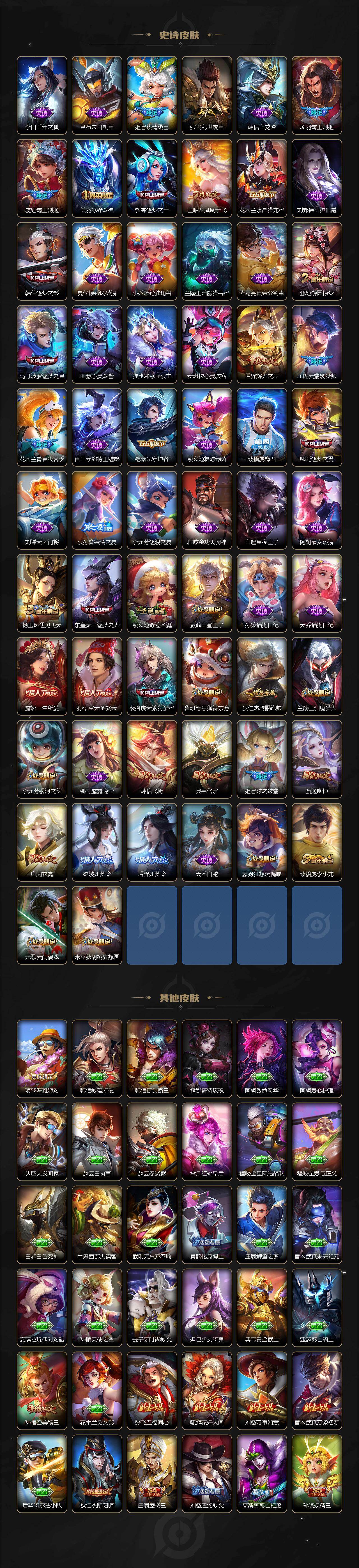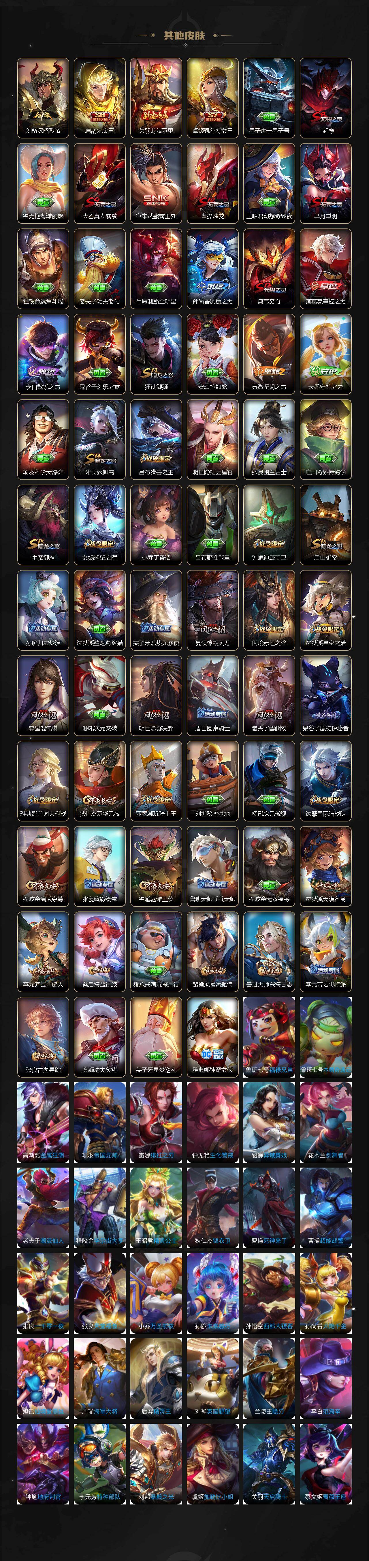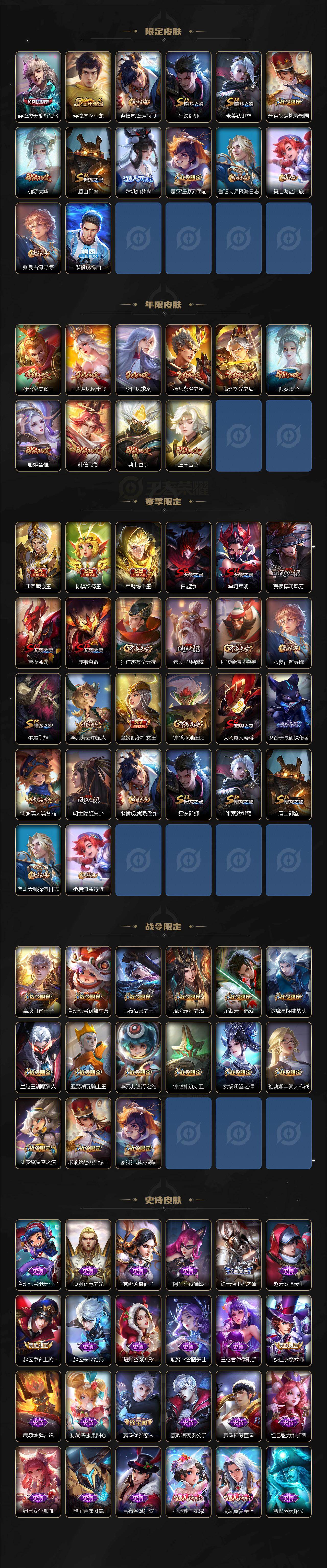 【限定皮肤】:白起狰,狄仁杰阴阳师,小乔纯白花嫁,虞姬凯尔特女王,赵云皇家上将,妲己热情桑巴,妲己时之彼端,嬴政优雅恋人,嬴政白昼王子,鲁班七号狮舞东方,庄周蜃楼王,庄周云端筑梦师,庄周玄嵩,高渐离死亡摇滚,钟无艳王者之锤,孙膑妖精王,扁鹊炼金王,芈月重明,吕布天魔缭乱,吕布猎兽之王,周瑜真爱至上,周瑜赤莲之焰,元歌云间偶戏,夏侯惇朔风刀,甄姬幽恒,甄姬游园惊梦,曹操烛龙,典韦穷奇,典韦岱宗,马可波罗逐梦之星,狄仁杰魔术师,狄仁杰万华元夜,达摩星际陆战队,项羽海滩派对,项羽霸王别姬,老夫子醍醐杖,关羽冰锋战神,貂蝉逐梦之音,程咬金演武夺筹,露娜一生所爱,韩信逐梦之影,韩信飞衡,王昭君凤凰于飞,兰陵王驯魔猎人,花木兰青春决赛季,亚瑟潮玩骑士王,孙悟空美猴王,孙悟空大圣娶亲,牛魔御旌,后羿辉光之辰,后羿如梦令,李元芳银河之约,李元芳云中旅人,虞姬霸王别姬,虞姬启明星使,钟馗神迹守卫,钟馗驱傩正仪,杨玉环遇见飞天,杨戬永曜之星,女娲朔望之晖,哪吒逐梦之翼,雅典娜单词大作战,蔡文姬奇迹圣诞,太乙真人饕餮,东皇太一逐梦之光,鬼谷子原初探秘者,诸葛亮武陵仙君,弈星混沌棋,公孙离蜜橘之夏,沈梦溪星空之诺,沈梦溪大漠名商,明世隐疑决卦,裴擒虎天狼狩猎者,裴擒虎李小龙,裴擒虎擒涛扼浪,狂铁御狮,米莱狄御霄,米莱狄胡桃异想国,伽罗太华,盾山御銮,嫦娥如梦令,蒙犽狂想玩偶喵,鲁班大师探海日志,桑启海盐诗旅,张良古海寻踪,裴擒虎梅西