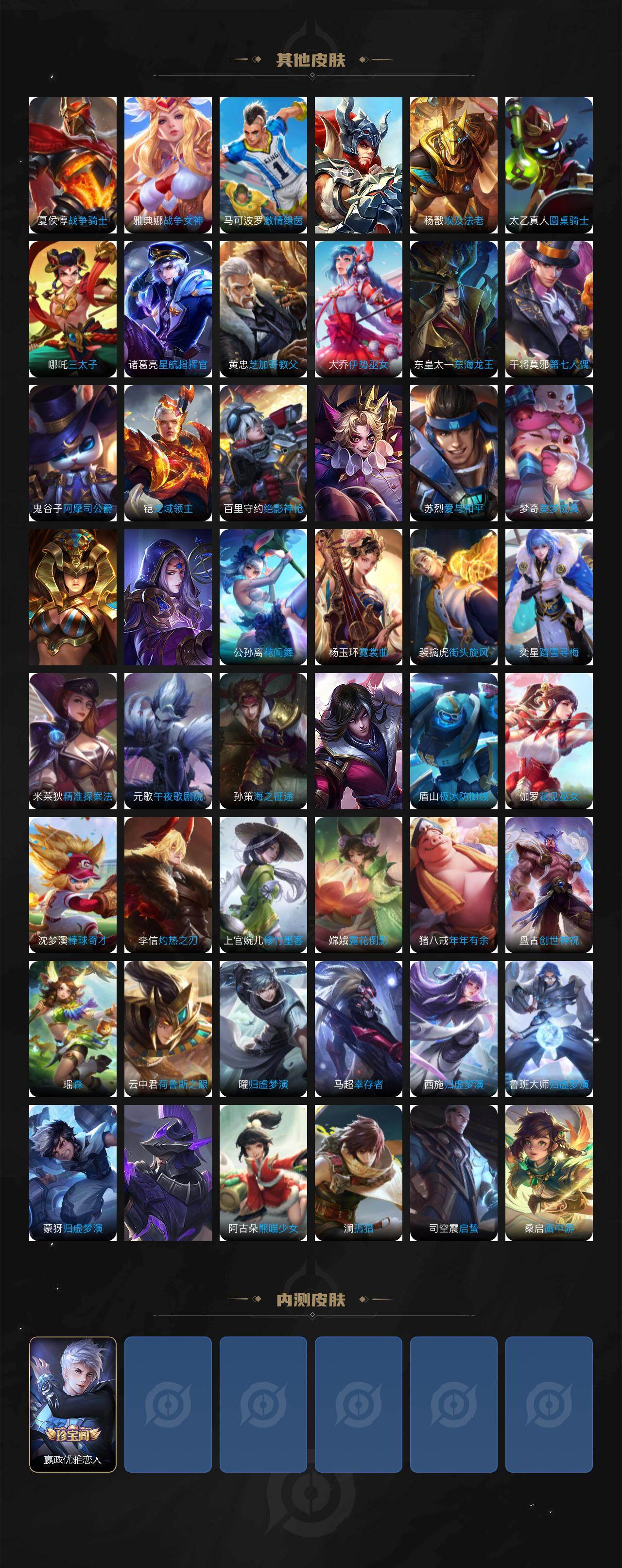 庄周蜃楼王,孙膑妖精王,扁鹊炼金王,虞姬凯尔特女王,白起狰,太乙真人饕餮,曹操烛龙,芈月重明,典韦穷奇,狂铁御狮,米莱狄御霄,牛魔御旌,盾山御銮,夏侯惇朔风刀,明世隐疑决卦,老夫子醍醐杖,鬼谷子原初探秘者,狄仁杰万华元夜,程咬金演武夺筹,钟馗驱傩正仪,吕布猎兽之王,嬴政白昼王子,女娲朔望之晖,钟馗神迹守卫,鲁班七号狮舞东方,沈梦溪星空之诺,李元芳银河之约,蒙犽狂想玩偶喵,元歌云间偶戏,弈星混沌棋,沈梦溪大漠名商,李元芳云中旅人,桑启海盐诗旅,裴擒虎擒涛扼浪,鲁班大师探海日志,张良古海寻踪