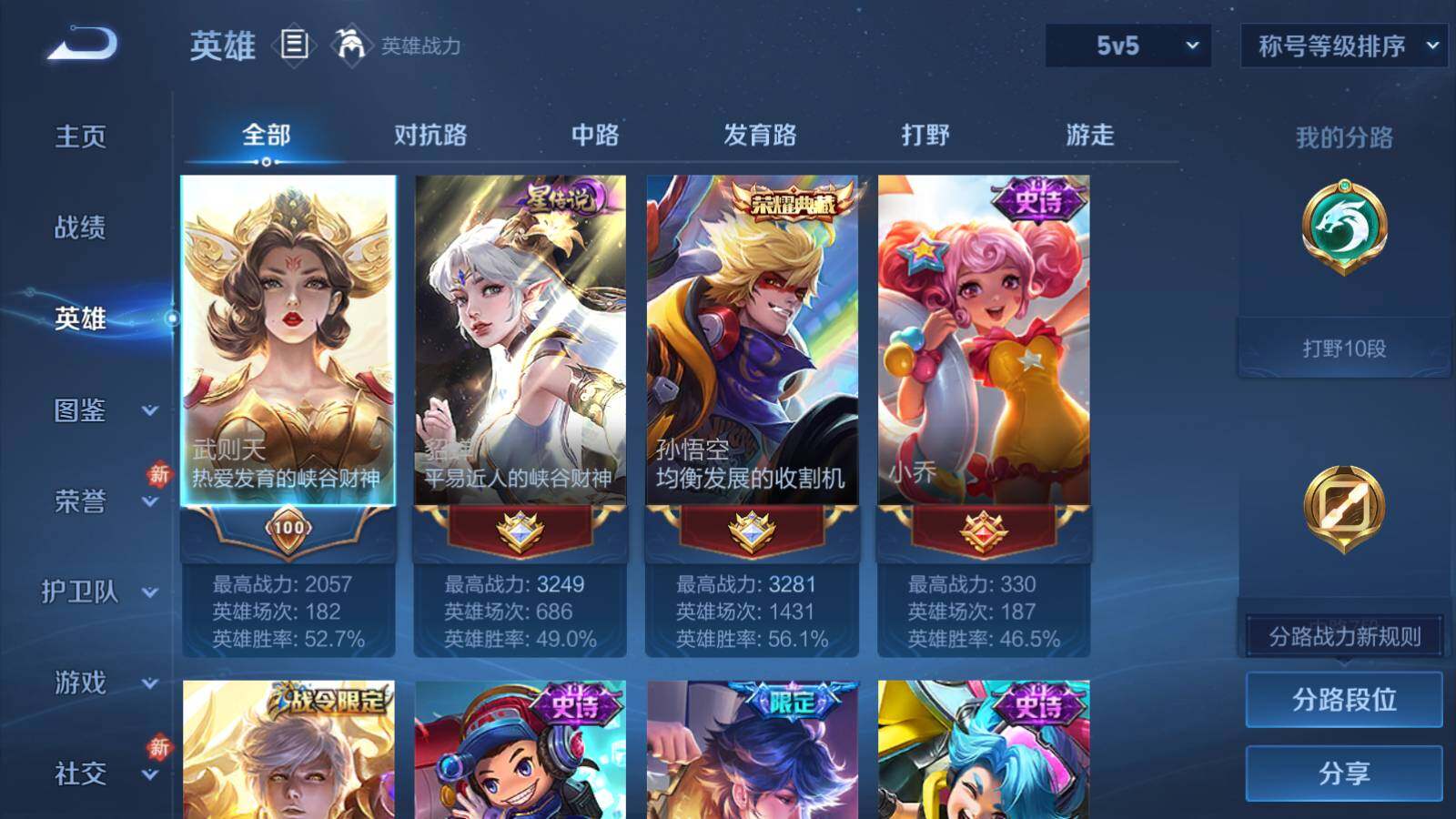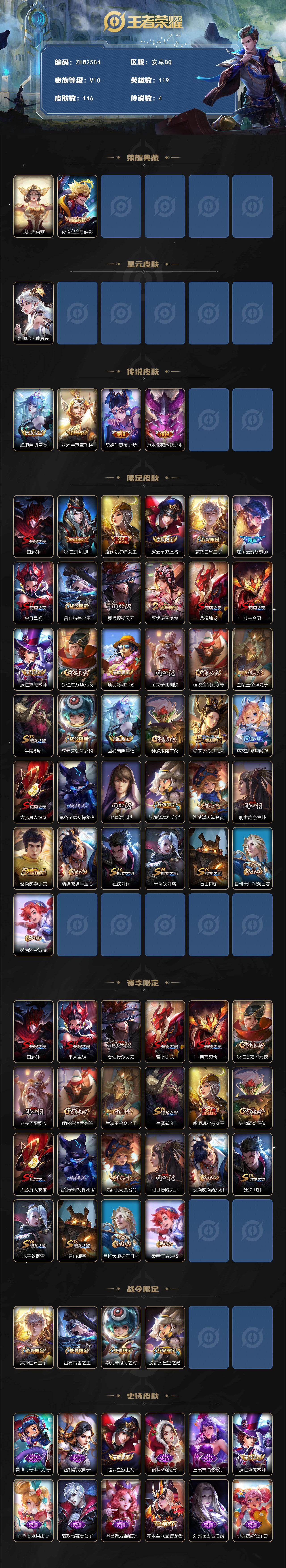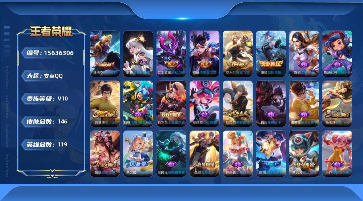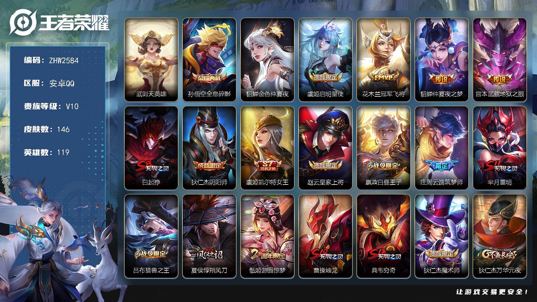 [15636306]安卓Q-V10-荣耀黄金IV段位-119英雄-146皮肤-1典藏皮肤-1典藏英雄-4传说-26史诗 【荣耀典藏】:武则天英雄,孙悟空全息碎影 【传说皮肤】:虞姬启明星使,花木兰冠军飞将,貂蝉仲夏夜之梦,宫本武藏地狱之眼 【限定皮肤】:白起狰,狄仁杰阴阳师,虞姬凯尔特女王,赵云皇家上将,嬴政白昼王子,庄周云端筑梦师,芈月重明,吕布猎兽之王,夏侯惇朔风刀,甄姬游园惊梦,曹操烛龙,典韦穷奇,狄仁杰魔术师,狄仁杰万华元夜,项羽海滩派对,老夫子醍醐杖,程咬金演武夺筹,兰陵王金庭之子,牛魔御旌,李元芳银河之约,虞姬启明星使,钟馗驱傩正仪,杨玉环遇见飞天,蔡文姬繁星吟游,太乙真人饕餮,鬼谷子原初探秘者,弈星混沌棋,沈梦溪星空之诺,沈梦溪大漠名商,明世隐疑决卦,裴擒虎李小龙,裴擒虎擒涛扼浪,狂铁御狮,米莱狄御霄,盾山御銮,鲁班大师探海日志,桑启海盐诗旅 【赛季限定】:白起狰,芈月重明,夏侯惇朔风刀,曹操烛龙,典韦穷奇,狄仁杰万华元夜,老夫子醍醐杖,程咬金演武夺筹,兰陵王金庭之子,牛魔御旌,虞姬凯尔特女王,钟馗驱傩正仪,太乙真人饕餮,鬼谷子原初探秘者,弈星混沌棋,沈梦溪大漠名商,明世隐疑决卦,裴擒虎擒涛扼浪,狂铁御狮,米莱狄御霄,盾山御銮,鲁班大师探海日志,桑启海盐诗旅 【战令限定】:嬴政白昼王子,吕布猎兽之王,李元芳银河之约,沈梦溪星空之诺 【史诗皮肤】:鲁班七号电玩小子,露娜紫霞仙子,赵云皇家上将,貂蝉圣诞恋歌,王昭君偶像歌手,狄仁杰魔术师,孙尚香水果甜心,嬴政暗夜贵公子,妲己魅力维加斯,花木兰水晶猎龙者,刘邦德古拉伯爵,小乔缤纷独角兽,兰陵王暗隐猎兽者,诸葛亮黄金分割率,甄姬游园惊梦,安琪拉心灵骇客,庄周云端筑梦师,程咬金功夫厨神,白起星夜王子,杨玉环遇见飞天,嬴政白昼王子,狄仁杰鹰眼统帅,蔡文姬繁星吟游,李元芳银河之约,裴擒虎李小龙,刘禅电玩爆裂旋风 【其他皮肤】:项羽海滩派对,韩信教廷特使,阿轲致命风华,达摩大发明家,程咬金爱与正义,白起白色死神,扁鹊化身博士,庄周鲤鱼之梦,妲己少女阿狸,典韦黄金武士,亚瑟死亡骑士,达摩拳王,花木兰兔女郎,甄姬花好人间,刘备万事如意,宫本武藏万象初新,后羿阿尔法小队,狄仁杰阴阳师,刘备纽约教父,刘备汉昭烈帝,关羽龙腾万里,虞姬凯尔特女王,白起狰,钟无艳海滩丽影,太乙真人饕餮,宫本武藏霸王丸,曹操烛龙,王昭君幻想奇妙夜,芈月重明,狂铁命运角