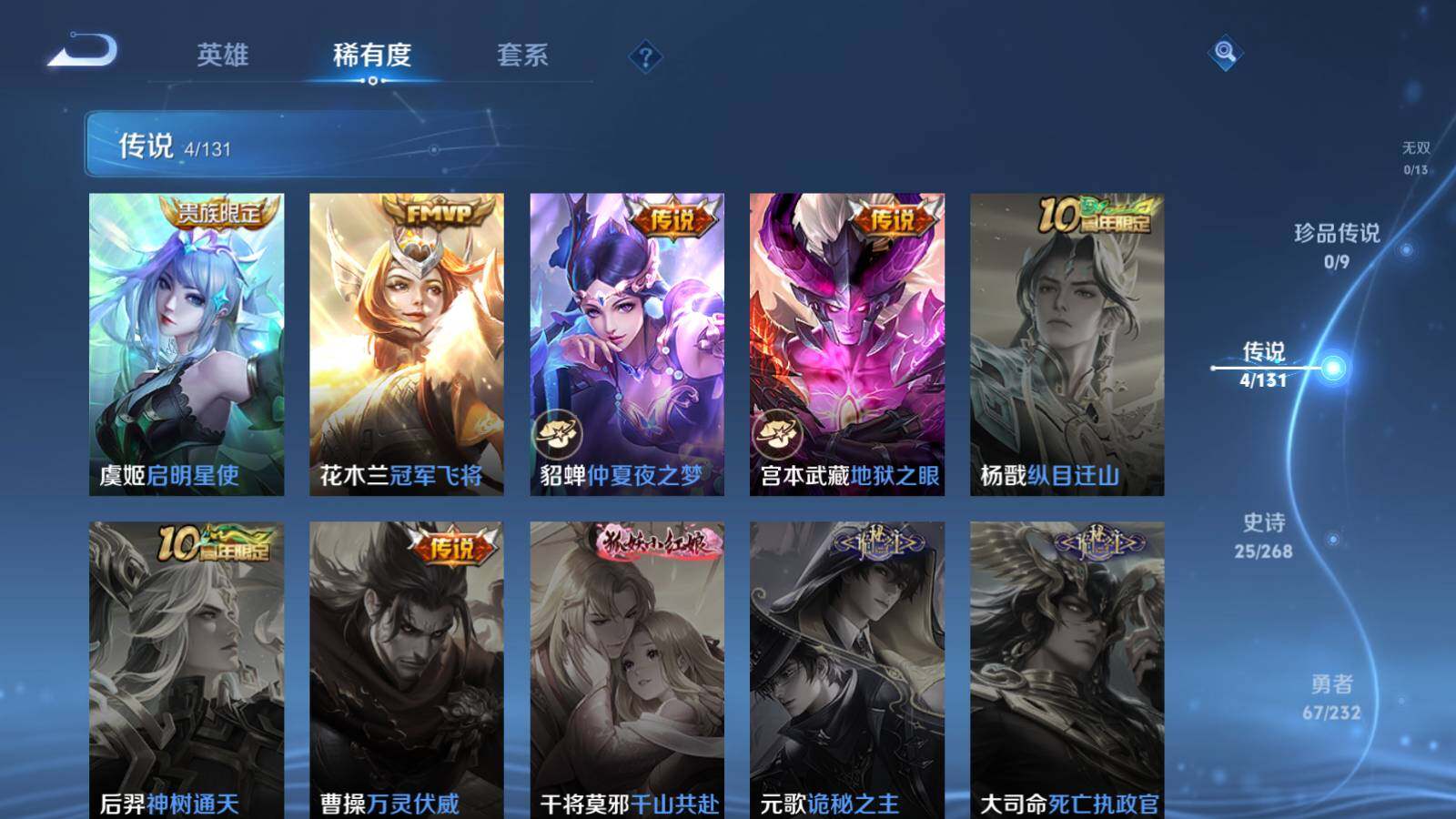 【传说皮肤】:虞姬启明星使,花木兰冠军飞将,貂蝉仲夏夜之梦,宫本武藏地狱之眼