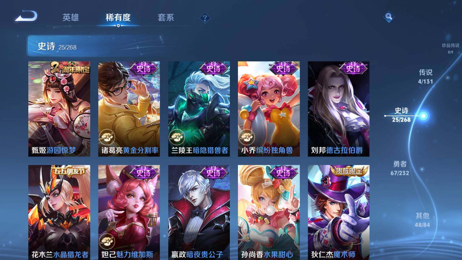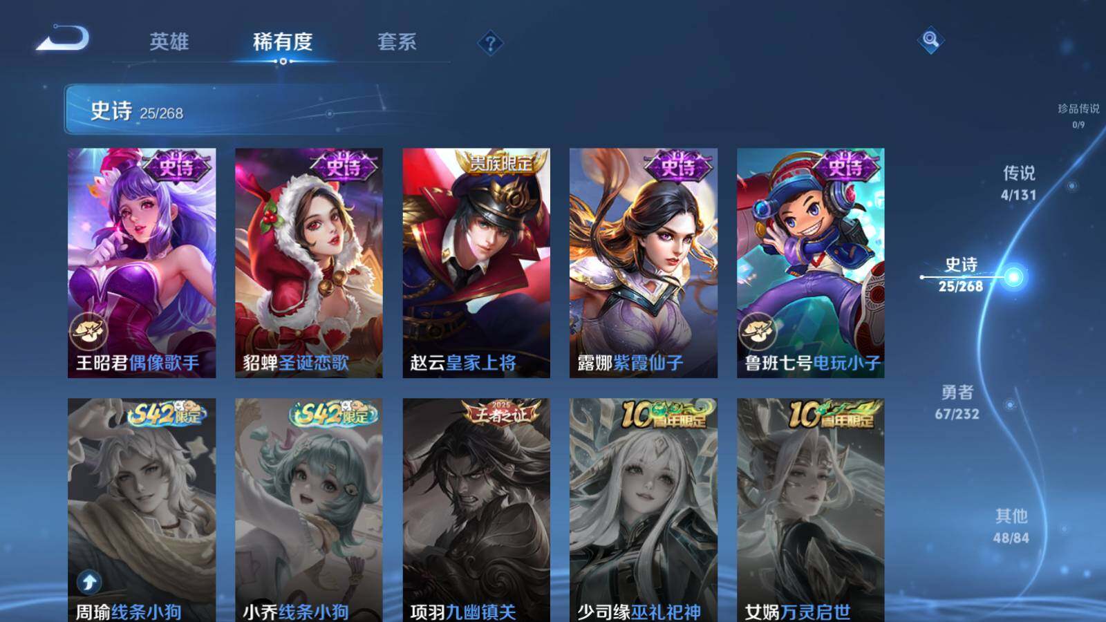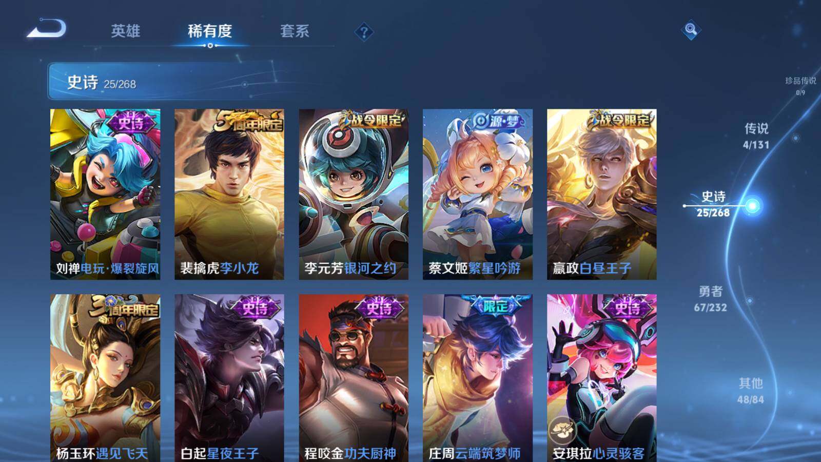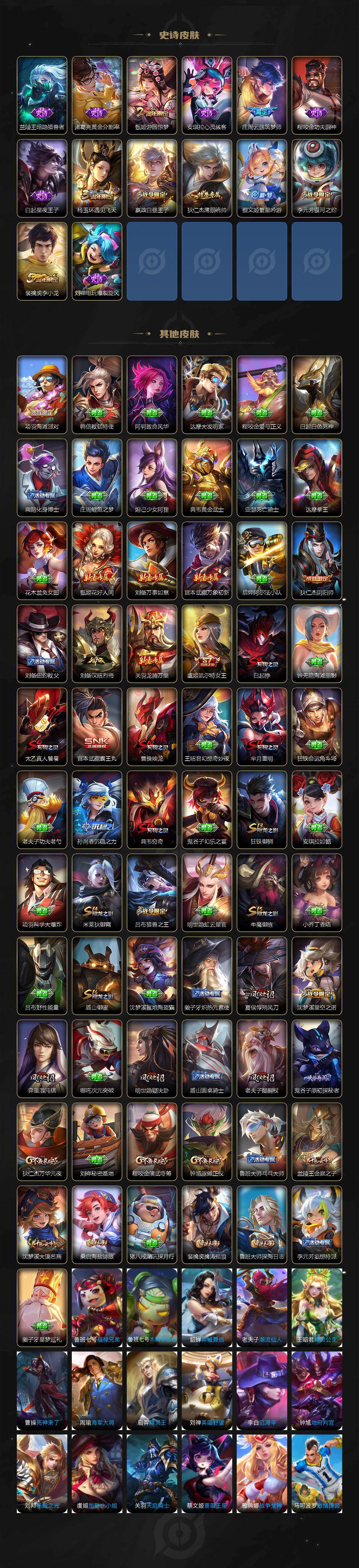 【史诗皮肤】:鲁班七号电玩小子,露娜紫霞仙子,赵云皇家上将,貂蝉圣诞恋歌,王昭君偶像歌手,狄仁杰魔术师,孙尚香水果甜心,嬴政暗夜贵公子,妲己魅力维加斯,花木兰水晶猎龙者,刘邦德古拉伯爵,小乔缤纷独角兽,兰陵王暗隐猎兽者,诸葛亮黄金分割率,甄姬游园惊梦,安琪拉心灵骇客,庄周云端筑梦师,程咬金功夫厨神,白起星夜王子,杨玉环遇见飞天,嬴政白昼王子,狄仁杰鹰眼统帅,蔡文姬繁星吟游,李元芳银河之约,裴擒虎李小龙,刘禅电玩爆裂旋风