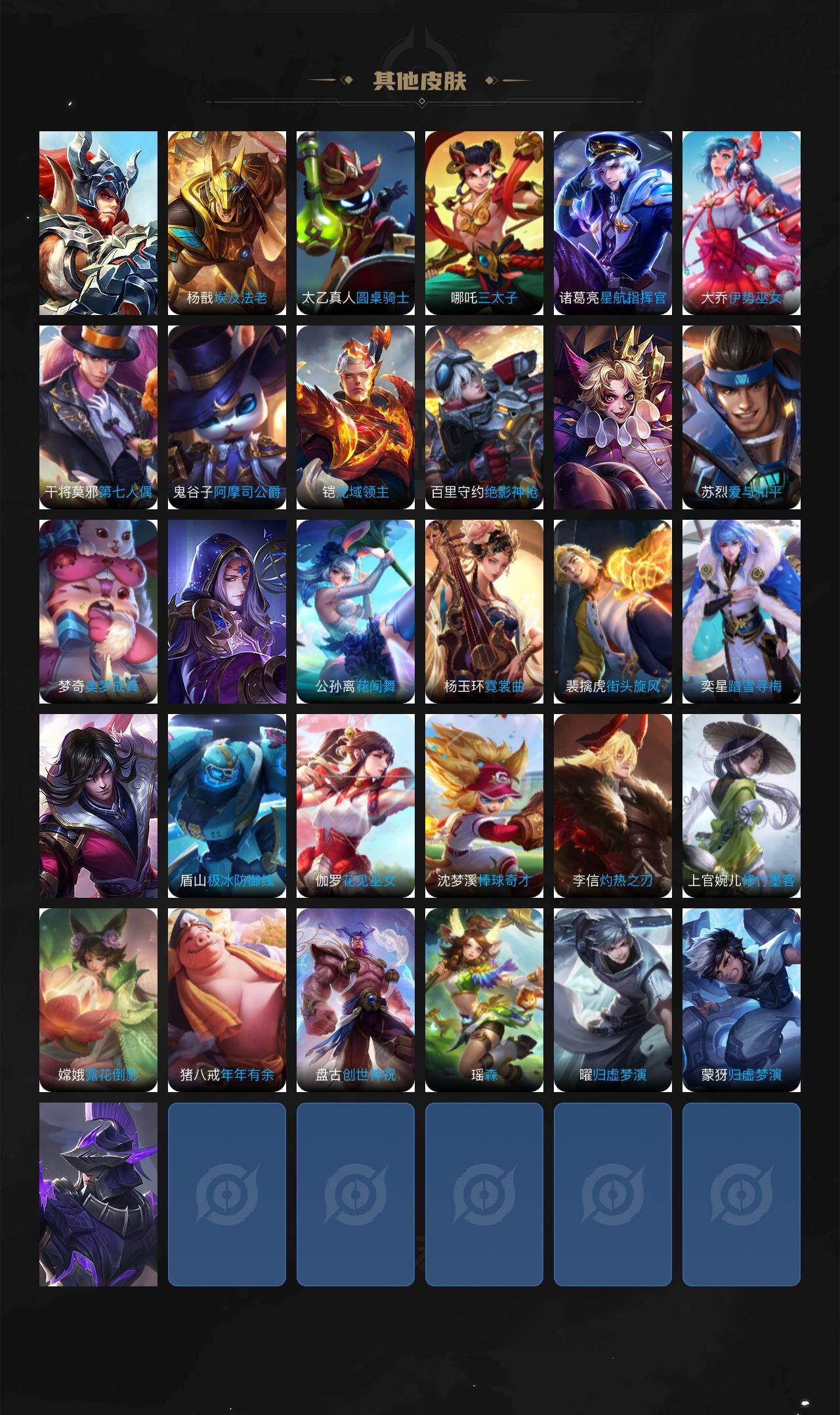 【其他皮肤】:项羽海滩派对,韩信教廷特使,阿轲致命风华,达摩大发明家,程咬金爱与正义,白起白色死神,扁鹊化身博士,庄周鲤鱼之梦,妲己少女阿狸,典韦黄金武士,亚瑟死亡骑士,达摩拳王,花木兰兔女郎,甄姬花好人间,刘备万事如意,宫本武藏万象初新,后羿阿尔法小队,狄仁杰阴阳师,刘备纽约教父,刘备汉昭烈帝,关羽龙腾万里,虞姬凯尔特女王,白起狰,钟无艳海滩丽影,太乙真人饕餮,宫本武藏霸王丸,曹操烛龙,王昭君幻想奇妙夜,芈月重明,狂铁命运角