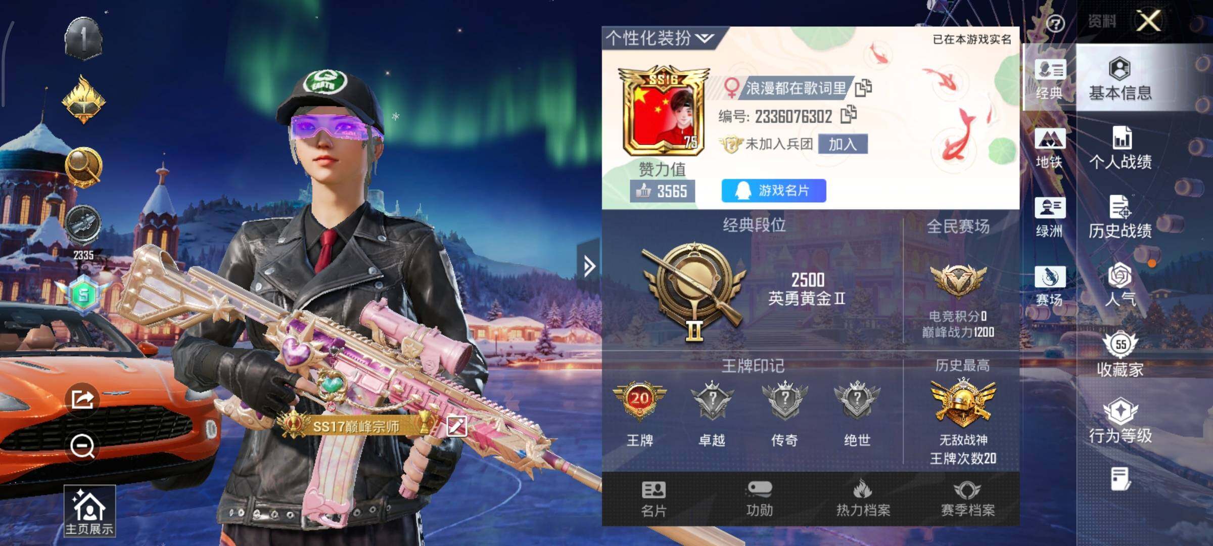 - PX_2097860-1【可二次】【因赛季更新游戏段付以上号为准!】苹果Q-2w热力值 4王牌印记 历史卓越王牌10星 75套装 98枪皮 【1载具】 宾利飞驰布罗德盖棕双色 【7粉装】 茉莉星 宝贝奶油派 天使彩虹糖 星穹咏叹调 霞光圣骑 冰川红玫 寒光使者 【3特效枪】 Kar98K-巳巳如意 (5级) AMR-炫光之旅 (6级) M416-暖熊萌萌 (5级) 【2飞行器】 御兔特攻飞行器