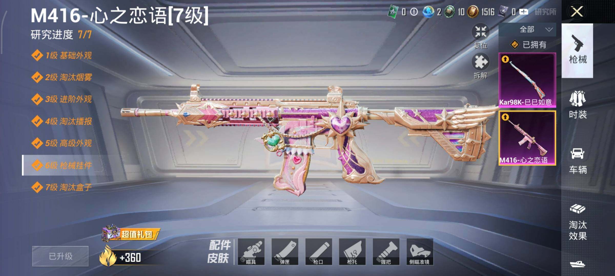 【粉色枪皮等级】:M416-心之恋语(七级),Kar98K-巳巳如意(二级)