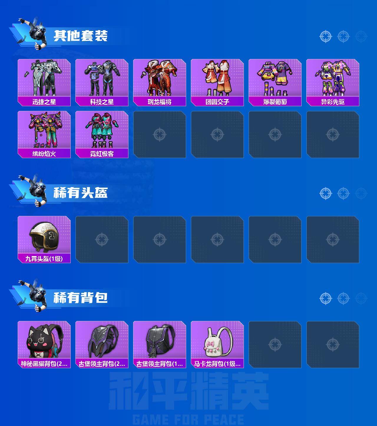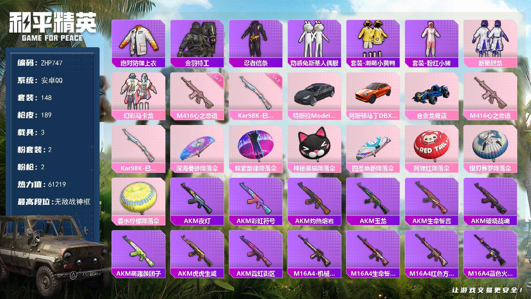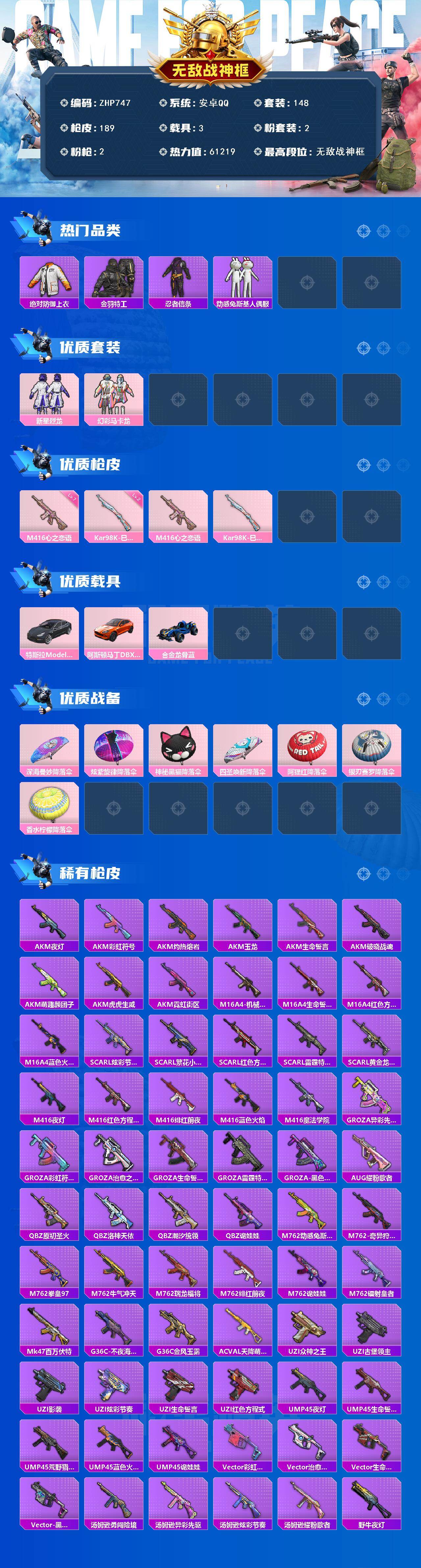 [15636765]无敌战神框-港澳-巡查员上衣-2粉装-2特效枪-3载具-0粉色飞行器-61219热力值-20王牌印记-148套装-189枪皮 【热门品类】:绝对防御上衣,套装-金羽特工,套装-忍者信条,套装-动感兔斯基人偶服,套装-潮萌小黄鸭,套装-粉红小猪 【粉色套装】:粉装-新星烈龙,粉装-幻彩马卡龙 【粉色枪皮等级】:M416-心之恋语(七级),Kar98K-巳巳如意(二级) 【粉色载具】:特斯拉Model 3(冷光银),阿斯顿马丁DBX(橙),合金龙骨(蓝) 【粉色枪皮】:M416-心之恋语,Kar98K-巳巳如意 【粉色降落伞】:深海曼妙降落伞,炫紫旋律降落伞,神秘黑猫降落伞,四圣焕新降落伞,阿狸红降落伞,银刃赛罗降落伞,香水柠檬降落伞 【稀有枪皮】:AKM-夜灯,AKM-彩虹符号,AKM-灼热熔岩,AKM-玉龙,AKM-生命誓言,AKM-破晓战魂,AKM-萌趣颜团子,AKM-虎虎生威,AKM-霓虹街区,M16A4-机械英豪,M16A4-生命誓言,M16A4-红色方程式,M16A4-蓝色火焰,SCAR-L-炫彩节奏,SCAR-L-繁花小夜曲,SCAR-L-红色方程式,SCAR-L-雷霆特警,SCAR-L-黄金龙骨,M416-夜灯,M416-红色方程式,M416-绯红前夜,M416-蓝色火焰,M416-魔法学院,GROZA-异彩先驱,GROZA-彩虹符号,GROZA-治愈之星,GROZA-生命誓言,GROZA-雷霆特警,GROZA-黑色刀锋,AUG-耀粉歌者,QBZ-原初圣火,QBZ-洛神天依,QBZ-潮汐统领,QBZ-诡娃娃,M762-动感兔斯基,M762-奇异狩猎者,M762-拳皇97,M762-牛气冲天,M762-瑞龙福将,M762-绯红前夜,M762-诡娃娃,M762-镭射皇者,Mk47-百万伏特,G36C-不夜海上花,G36C-金风玉露,AC-VAL-天降萌叽,UZI-众神之王,UZI-古堡领主,UZI-影袭,UZI-炫彩节奏,UZI-生命誓言,UZI-红色方程式,UMP45-夜灯,UMP45-生命誓言,UMP45-荒野猎神,UMP45-蓝色火焰,UMP45-诡娃娃,Vector-彩虹符号,Vector-治愈之星,Vector-生命誓言,Vector-黑色刀锋,汤姆逊-勇闯险境,汤姆逊-异彩先驱,汤姆逊-炫彩节奏,汤姆逊-耀粉歌者,野牛-夜灯,野牛-机械英豪,M