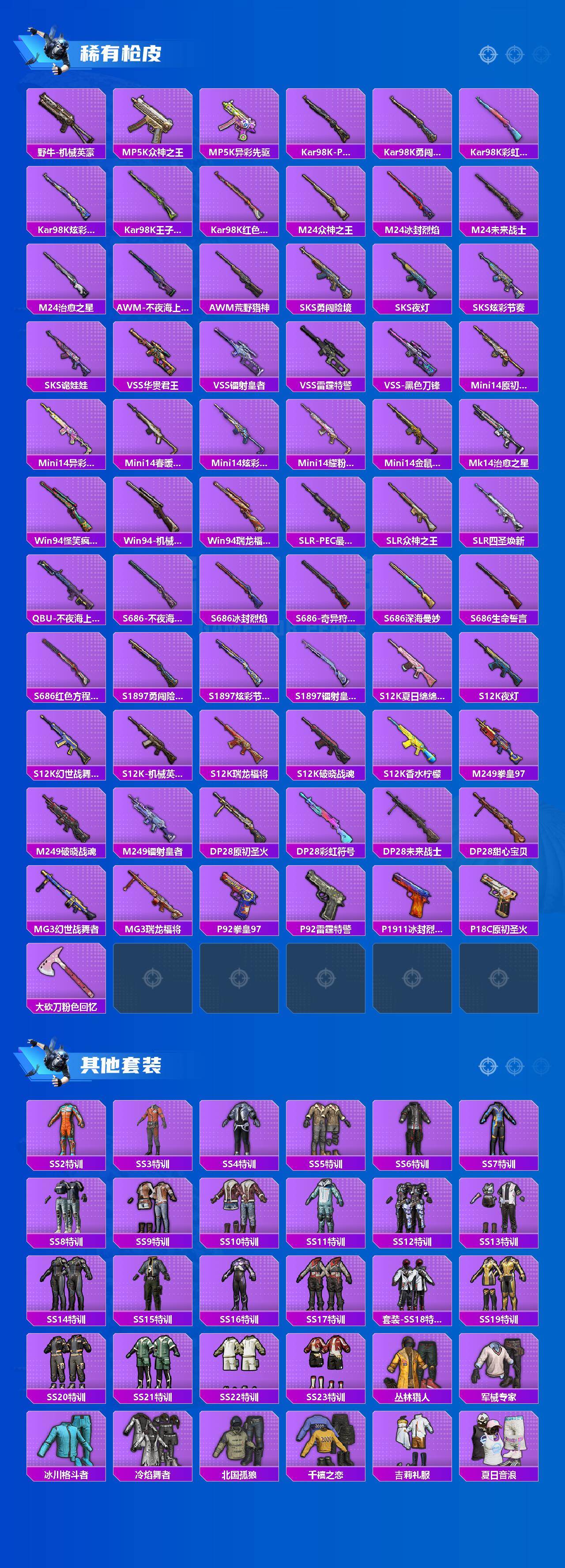 【稀有枪皮】:AKM-夜灯,AKM-彩虹符号,AKM-灼热熔岩,AKM-玉龙,AKM-生命誓言,AKM-破晓战魂,AKM-萌趣颜团子,AKM-虎虎生威,AKM-霓虹街区,M16A4-机械英豪,M16A4-生命誓言,M16A4-红色方程式,M16A4-蓝色火焰,SCAR-L-炫彩节奏,SCAR-L-繁花小夜曲,SCAR-L-红色方程式,SCAR-L-雷霆特警,SCAR-L-黄金龙骨,M416-夜灯,M416-红色方程式,M416-绯红前夜,M416-蓝色火焰,M416-魔法学院,GROZA-异彩先驱,GROZA-彩虹符号,GROZA-治愈之星,GROZA-生命誓言,GROZA-雷霆特警,GROZA-黑色刀锋,AUG-耀粉歌者,QBZ-原初圣火,QBZ-洛神天依,QBZ-潮汐统领,QBZ-诡娃娃,M762-动感兔斯基,M762-奇异狩猎者,M762-拳皇97,M762-牛气冲天,M762-瑞龙福将,M762-绯红前夜,M762-诡娃娃,M762-镭射皇者,Mk47-百万伏特,G36C-不夜海上花,G36C-金风玉露,AC-VAL-天降萌叽,UZI-众神之王,UZI-古堡领主,UZI-影袭,UZI-炫彩节奏,UZI-生命誓言,UZI-红色方程式,UMP45-夜灯,UMP45-生命誓言,UMP45-荒野猎神,UMP45-蓝色火焰,UMP45-诡娃娃,Vector-彩虹符号,Vector-治愈之星,Vector-生命誓言,Vector-黑色刀锋,汤姆逊-勇闯险境,汤姆逊-异彩先驱,汤姆逊-炫彩节奏,汤姆逊-耀粉歌者,野牛-夜灯,野牛-机械英豪,M