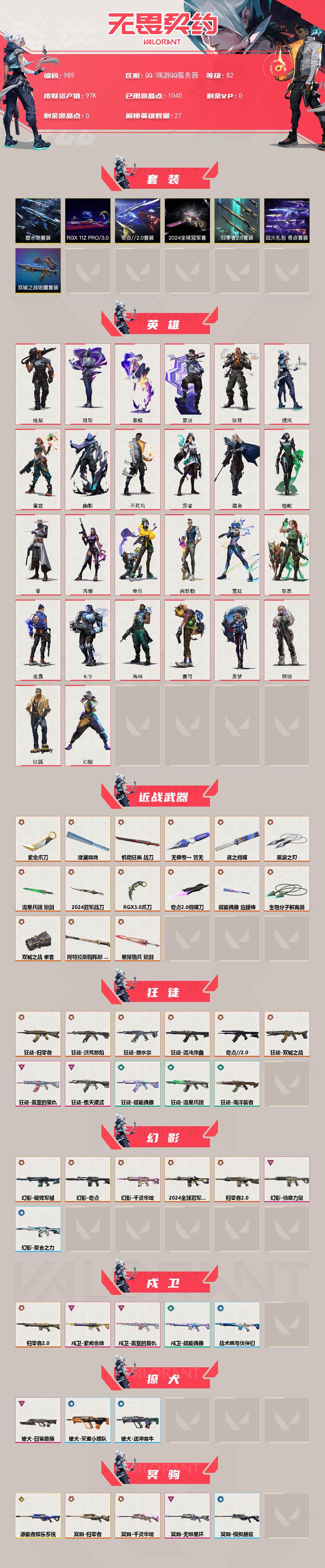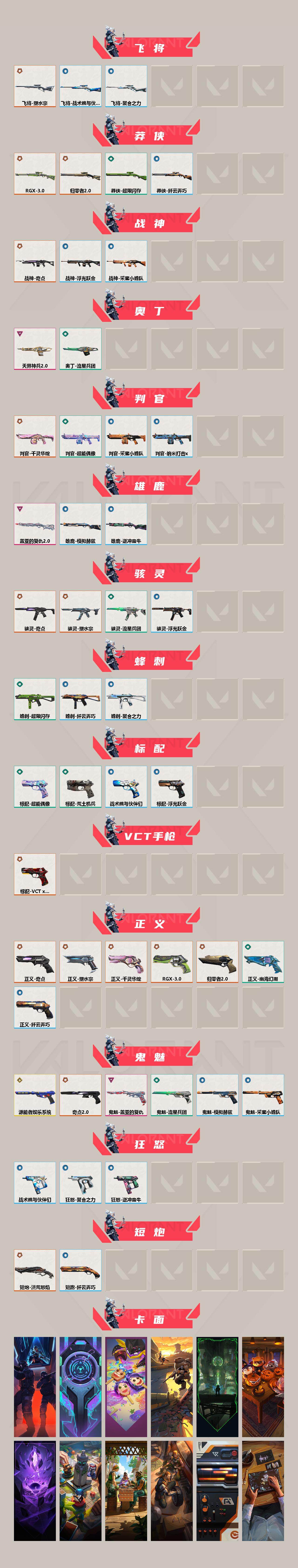 [15638720]【套装】:2024全球冠军赛套装,RGX 11z Pro//3.0套装,塑水宗套装,《双城之战》收藏套装,归零者//2.0套装,奇点//2.0套装,回火礼包:奇点套装 【英雄】:幻棱,炼狱,维斯,暮蝶,钛狐,壹决,铁臂,捷风,雷兹,幽影,不死鸟,贤者,猎枭,蝰蛇,零,芮娜,奇乐,尚勃勒,霓虹,斯凯,夜露,K/O,海神,盖可,黑梦,钢锁 【近战武器】:近战武器-2024全球冠军赛 战刀,近战武器-无畏契约GO!第一卷 苦无,近战武器-奇点//2.0 蝴蝶刀,近战武器-紫金爪刀,近战武器-RGX 11z Pro//3.0 爪刀,近战武器-黑波之刃,近战武器-澄湖潋滟,近战武器-夜之蝴蝶,近战武器-双城之战 拳套,近战武器-流星兵团 短剑,近战武器-超能偶像 应援棒,近战武器-机动狂飙 战刀,近战武器-生物分子解离器,近战武器-阿特拉斯指挥部 甩棍,近战武器-星际猎兵 短剑 【狂徒】:狂徒-归零者,狂徒-洪荒怒焰,狂徒-混沌序曲,狂徒-奇点//2.0,狂徒-双城之战,狂徒-塑水宗,狂徒-堕天遗武,狂徒-盖亚的复仇,狂徒-超能偶像,狂徒-海洋旅者,狂徒-流星兵团 【幻影】:幻影-2024全球冠军赛,幻影-归零者//2.0,幻影-破败军械,幻影-奇点,幻影-千灵华绽,幻影-侦察力量,幻影-聚合之力 【戍卫】:戍卫-归零者//2.0,戍卫-盖亚的复仇,戍卫-紫阙金琅,戍卫-超能偶像,戍卫-战术熊与伙伴们 【獠犬】:獠犬-日冕雄师,獠犬-采蜜小蜂队,獠犬-逆冲蛮牛 【冥驹】:冥驹-源能者娱乐系统,冥驹-归零者,冥驹-千灵华绽,冥驹-无垠星环,冥驹-模拟赫兹 【飞将】:飞将-塑水宗,飞将-聚合之力,飞将-战术熊与伙伴们 【莽侠】:莽侠-RGX 11z Pro//3.0,莽侠-归零者//2.0,莽侠-超限闪存,莽侠-纤云弄巧 【战神】:战神-奇点,战神-采蜜小蜂队,战神-浮光跃金 【奥丁】:奥丁-天界神兵//2.0,奥丁-流星兵团 【判官】:判官-千灵华绽,判官-超能偶像,判官-采蜜小蜂队,判官-纳米打击x 【雄鹿】:雄鹿-盖亚的复仇//2.0,雄鹿-模拟赫兹,雄鹿-逆冲蛮牛 【骇灵】:骇灵-奇点,骇灵-塑水宗,骇灵-流星兵团,骇灵-浮光跃金 【蜂刺】:蜂刺-超限闪存,蜂刺-聚合之力,蜂刺-纤云弄巧 【标配】:标配-超能偶像,标配-荒土机兵,标配-浮光跃金,标配-战术熊与伙伴们 【