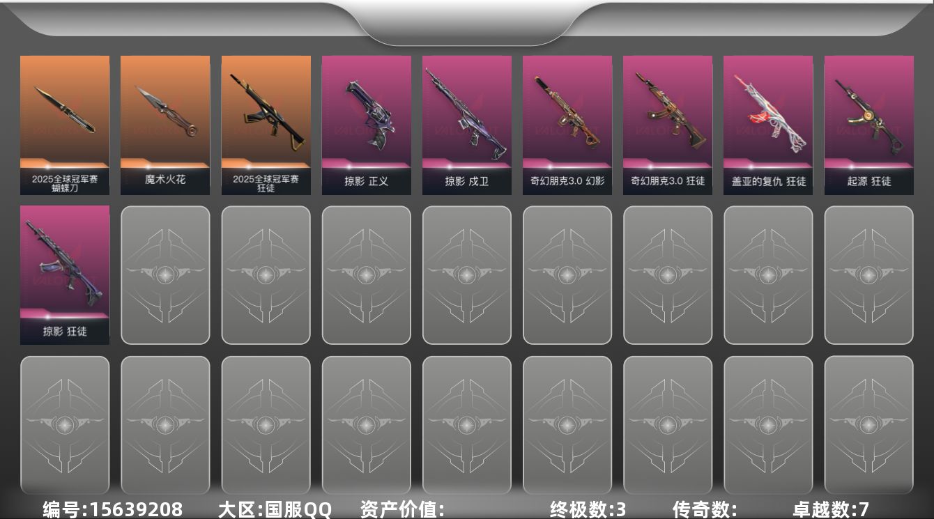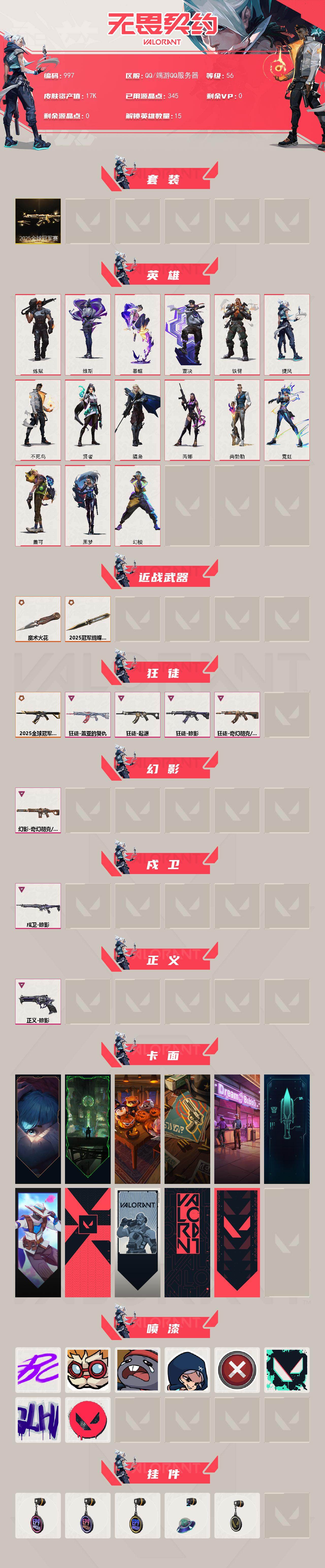 [15639208]【套装】:2025全球冠军赛套装 【英雄】:幻棱,炼狱,维斯,暮蝶,壹决,铁臂,捷风,不死鸟,贤者,猎枭,芮娜,尚勃勒,霓虹,盖可,黑梦 【近战武器】:近战武器-2025全球冠军赛 蝴蝶刀,近战武器-魔术火花,近战武器-魔术火花 【狂徒】:狂徒-2025全球冠军赛,狂徒-掠影,狂徒-盖亚的复仇,狂徒-起源,狂徒-奇幻朋克//3.0 【幻影】:幻影-奇幻朋克//3.0 【戍卫】:戍卫-掠影 【正义】:正义-掠影 【卡面】:《双城之战》拥抱 卡面,欢迎来到底城 卡面,南瓜盛典 卡面,正义的化身 卡面,梦幻奶茶 卡面,零点嗅探设计图 卡面,无畏契约GO!第一卷:零 卡面,代号红色 卡面,新兵报到 卡面,V契约 卡面,无畏契约 卡面 【喷漆】:嘭! 喷漆,都算到了 喷漆,熊抱 喷漆,捷风差距 喷漆,买装还是存钱 喷漆,胜利属于无畏契约 喷漆,GLHF 喷漆,无畏契约 喷漆 【挂饰】:第九季//第三幕 纪念币 挂饰,第九季//第二幕 纪念币 挂饰,第九季//第一幕 纪念币 挂饰,天外飞客 挂饰,无畏契约 纪念币 挂饰