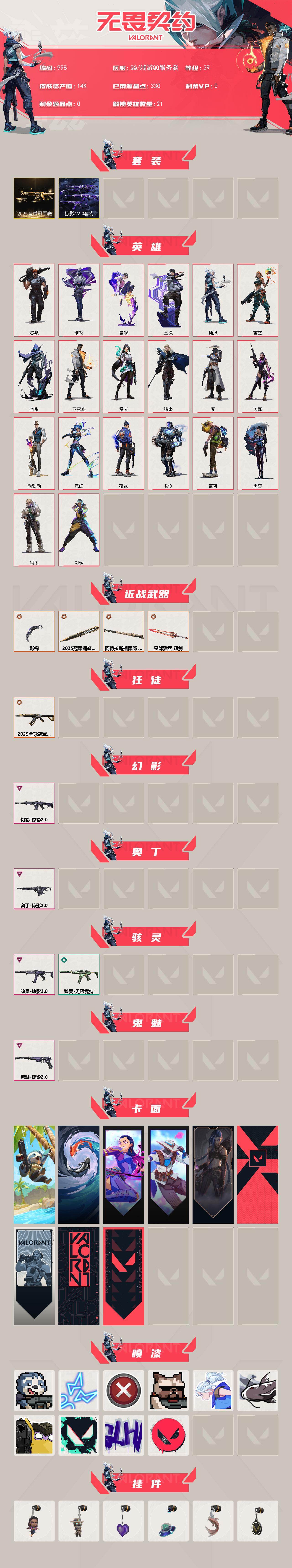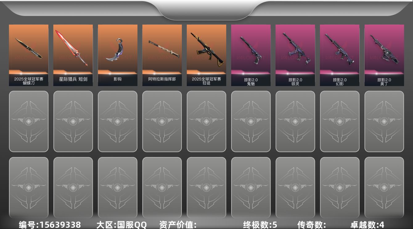 [15639338]【套装】:2025全球冠军赛套装,掠影//2.0套装 【英雄】:幻棱,炼狱,维斯,暮蝶,壹决,捷风,雷兹,幽影,不死鸟,贤者,猎枭,零,芮娜,尚勃勒,霓虹,夜露,K/O,盖可,黑梦,钢锁 【近战武器】:近战武器-2025全球冠军赛 蝴蝶刀,近战武器-影钩,近战武器-阿特拉斯指挥部 甩棍,近战武器-星际猎兵 短剑 【狂徒】:狂徒-2025全球冠军赛 【幻影】:幻影-掠影//2.0 【奥丁】:奥丁-掠影//2.0 【骇灵】:骇灵-掠影//2.0,骇灵-无限竞技 【鬼魅】:鬼魅-掠影//2.0 【卡面】:树懒大作战 卡面,红鳞松叶 卡面,无畏契约GO!第一卷:芮娜 卡面,无畏契约GO!第一卷:零 卡面,《双城之战》金克丝 卡面,代号红色 卡面,新兵报到 卡面,V契约 卡面,无畏契约 卡面 【喷漆】:审判之爪 喷漆,霓光四射 喷漆,买装还是存钱 喷漆,关门放狗 喷漆,无畏契约GO!第一卷:捷风 喷漆,松叶 喷漆,放下武器 喷漆,胜利属于无畏契约 喷漆,GLHF 喷漆,无畏契约 喷漆 【挂饰】:无畏契约GO!第一卷 芮娜 挂饰,无畏契约GO!第一卷 零 挂饰,薰衣草之心 挂饰,天外飞客 挂饰,红鳞松叶 挂饰,无畏契约 纪念币 挂饰