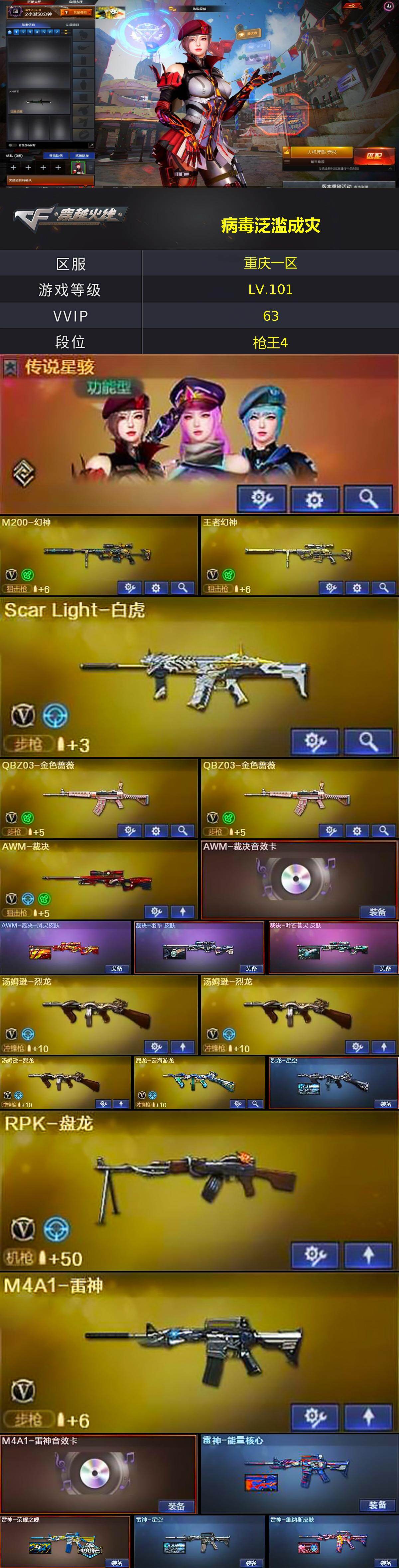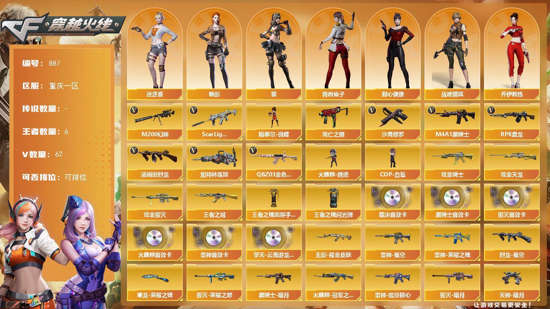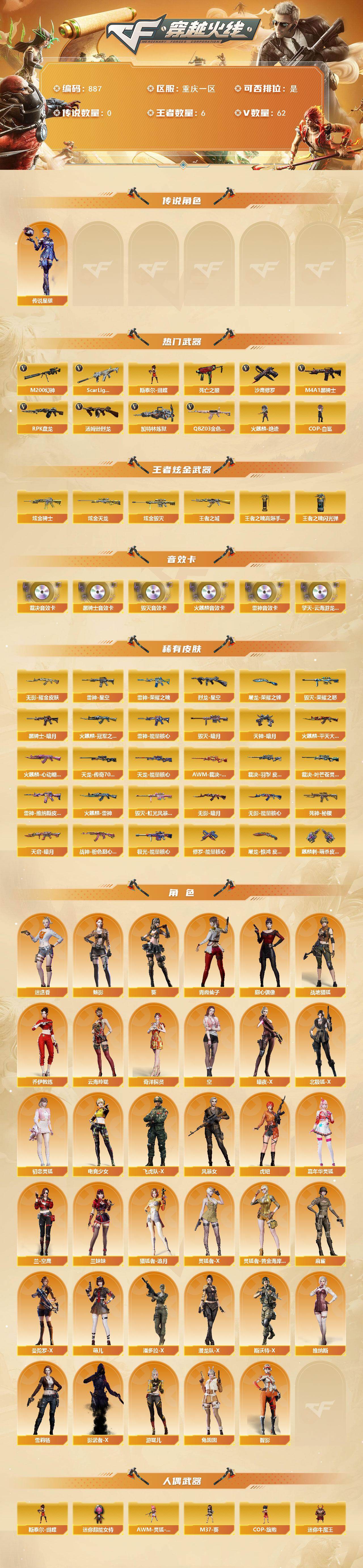 [15639411]重庆一区-62V-6王者-4炫金 【传说角色】:传说星骇 【热门武器】:QBZ03-金色蔷薇*2,Scar Light-白虎,M200-幻神,死亡之眼,M4A1-黑骑士,汤姆逊-烈龙*3,RPK-盘龙,加特林-炼狱,斯泰尔-蝴蝶,火麒麟-绝迹,COP-白鲨,沙鹰-修罗*3 【王者炫金武器】:王者之城,炫金骑士,炫金毁灭*2,炫金天龙,王者之魄高爆手雷,王者之魄闪光弹 【音效卡】:擎天-云海游龙音效卡,AK47-火麒麟音效卡,M4A1-雷神音效卡,M4A1-黑骑士音效卡,Barrett-毁灭音效卡,AWM-裁决音效卡 【皮肤】:AWM-裁决-凤灵皮肤,裁决-羽掣 皮肤,裁决-叶芒苍灵 皮肤,烈龙-星空,雷神-能量核心,雷神-荣耀之魄,雷神-星空,雷神-维纳斯皮肤,火麒麟-雷神,火麒麟-冠军之心,火麒麟-平天大圣,火麒麟-心动糖果,毁灭-暗月,毁灭-荣耀之怒,毁灭-虹光风暴 皮肤,黑骑士-暗月*2,无影-暗月*4,无影-能量核心*2,无影耀金皮肤,死神-秘银,天启-暗月*2,战神-粉色甜心皮肤,天龙-能量核心,AWM-天龙-传奇70KG,极光-能量核心,修罗-能量核心,天神-暗月*2,屠龙-荣耀之锋,屠龙-惊鸿 皮肤,麒麟刺-萌杀皮肤 【角色】:葵,魅影,迷迭香,战地猎狐,奇洋探员,乔伊教练,云海玲珑,空,暗夜-X,北极狐-X,初恋灵狐,电竞少女,飞虎队-X,风暴女,虎妞,嘉年华灵狐,兰-空鹰,兰妹妹,猎狐者-追月,灵狐者-X,灵狐者-黄金海岸,麻雀,曼陀罗-X,萌儿,潘多拉-X,潜龙队-X,青霞仙子,斯沃特-X,甜心偶像,兔囡囡,维纳斯,雪莉杨,影武者-X,游珑儿,智影 【人偶武器】:火麒麟-绝迹,COP-白鲨,斯泰尔-蝴蝶,AWM-灵狐-15周年嘉年华,M37-葵,COP-旗袍,迷你牛魔王,迷你牛牛,迷你生化手雷,生化手雷-机甲核心,迷你超能女侍,灵狐娃娃手雷 【暴走生化】:死亡之眼 【挑战大师】:激光毁灭者III,神圣爆裂者-末日III 【英雄级武器】:M4A1-千变,AK47-火麒麟,M4A1-黑龙,M4A1-雷神,M4A1-黑骑士,AK47-无影,M4A1-死神,AK47-黑武士,AK12-天启,AK47-机械迷城,AK47-黑鲨,M4A1-龙血,Scar Light-白虎,无影-神兵利器,黑武士-锦绣游龙,M4A1-玫瑰精灵,QBZ03-金色蔷薇*2,M4