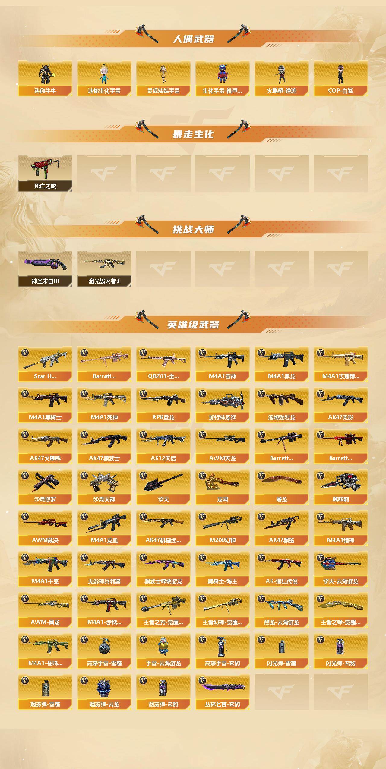 【英雄级武器】:M4A1-千变,AK47-火麒麟,M4A1-黑龙,M4A1-雷神,M4A1-黑骑士,AK47-无影,M4A1-死神,AK47-黑武士,AK12-天启,AK47-机械迷城,AK47-黑鲨,M4A1-龙血,Scar Light-白虎,无影-神兵利器,黑武士-锦绣游龙,M4A1-玫瑰精灵,QBZ03-金色蔷薇*2,M4