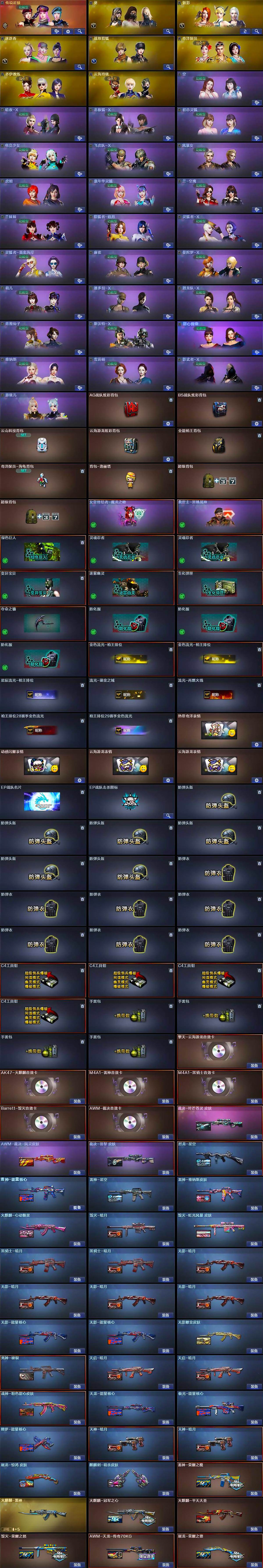 - [15622203]河北一区-60V-9王者-1炫金 【热门武器】:QBZ03-金色蔷薇,M200-竞技荣光,死亡之眼*5,汤姆逊-烈龙*6,裁决-雪莉杨,COP 357-幻灵,沙鹰-修罗*2 【王者炫金武器】:王者之怒,炼狱-悦蓝,王者之锋,炫金黑龙 【音效卡】:Barrett-碧霄极光音效卡 【皮肤】:雷神-能量核心,雷神-机甲刑天皮肤,火麒麟-百城,火麒麟-心动糖果,黑龙-暗月,修罗-能量核心 【角色】:葵,电竞教官-云悠悠,战地猎狐,王者-魅影,奇洋探员,乔伊教练,云海玲珑,暗夜-X,初恋灵狐,芳心审判者,风暴女,嘉年华灵狐,娟娟,灵狐者-X,灵狐者-七夕宝贝,麻雀,曼陀罗-X,潘多拉-X,潘多拉-甜心教官,潜龙队-X,斯沃特-X,甜心偶像,蜀雪,铁骑荣耀,夜玫瑰-宠粉,樱-战斗天使,影武者-X,游珑儿 【人偶武器】:裁决-雪莉杨,AWM-灵狐-15周年嘉年华,迷你深渊冰龙,迷你牛魔王,迷你波特博士,夺魂,迷你生化手雷,深渊终结者手雷,迷你艾比,迷你巨石泰坦-魔花研究所 【暴走生化】:死亡之眼*5,超级对讲机 【挑战大师】:冰龙粉碎者-白马银枪,激光毁灭者III-白马银枪,试炼破坏者III,神圣爆裂者-末日III 【英雄级武器】:AK47-火麒麟*2,M4A1-黑龙,M4A1-雷神*2,AN94-超新星,AK47-机械迷城,无影-神兵利器,黑武士-锦绣游龙,QBZ03-金色蔷薇,M4A1-猎神,烈火-动感闪耀,王者之势-觉醒版,黑骑士-海王,AWM-天龙,Barrett-毁灭*2,Barrett-极光,AWM-裁决,M200-竞技荣光,汤姆逊-烈龙*6,沙鹰-修罗*2,COP 357-幻灵,柯尔特-竞技荣光,天神-动感闪耀,屠龙*2,龙啸,擎天,麒麟刺,擎天-竞技荣光,屠龙-动感闪耀,雷霆王者之锋-觉醒版,高爆手雷-竞技荣光*6,手雷-动感闪耀,闪光弹-竞技荣光*6,闪光弹-雷霆王者-觉醒版,烟雾弹-竞技荣光*6,烟雾弹-神工天巧,M4A1-赤狱骑士 【道具】:云山科技背包,全能枪王背包,战舰背包,炫彩背包,超级背包,黑桃战神背包,女皇终结者-魔龙之吻,救世主-黑桃战神,绿色巨人,灵魂忍者,迷雾幽灵,生化弹匣,夺命之镰*2,防化服*3,金色流光-枪王排位*2,星辰流光-枪王排位,枪王排位28赛季金色流光,枪王排位29赛季金色流光,动感闪耀表情,EP战队收纳包,C4-再燃火线,