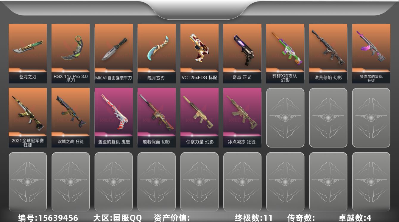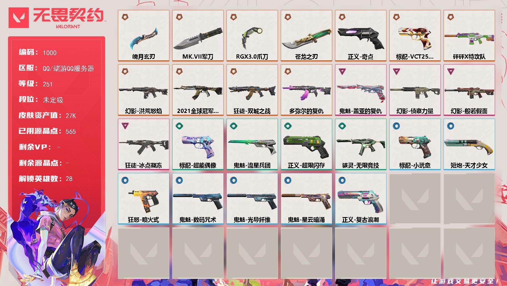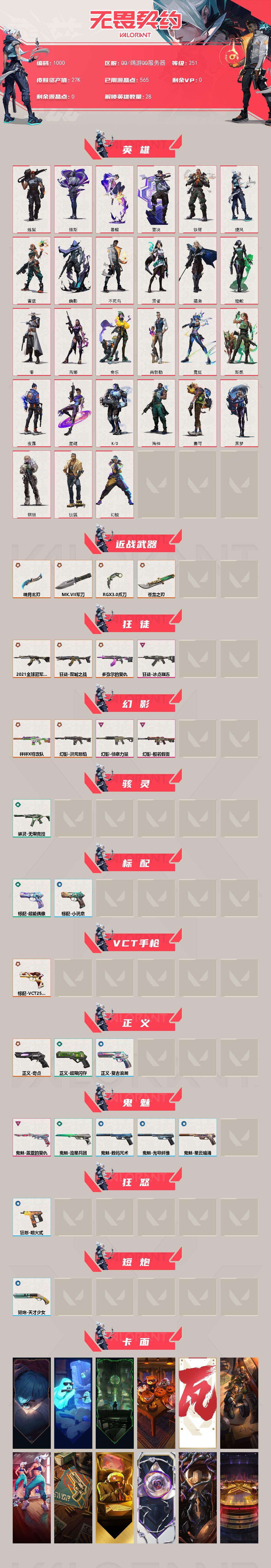 [15639456]【英雄】:幻棱,炼狱,维斯,暮蝶,钛狐,壹决,铁臂,捷风,雷兹,幽影,不死鸟,贤者,猎枭,蝰蛇,零,芮娜,奇乐,尚勃勒,霓虹,斯凯,夜露,星礈,K/O,海神,盖可,黑梦,钢锁 【近战武器】:近战武器-5周年//公测重制版 苍龙之刃,近战武器-RGX 11z Pro//3.0 爪刀,近战武器-MK.VII 自由强袭 军刀,近战武器-魄月玄刃 【狂徒】:狂徒-2021全球冠军赛,狂徒-双城之战,狂徒-多弥尔的复仇,狂徒-冰点凝冻 【幻影】:幻影-洪荒怒焰,幻影-砰砰X特攻队,幻影-般若假面,幻影-侦察力量 【骇灵】:骇灵-无限竞技 【标配】:标配-超能偶像,标配-小玩意 【VCT手枪】:标配-VCT25 x EDG 【正义】:正义-奇点,正义-超限闪存,正义-复古浪潮 【鬼魅】:鬼魅-盖亚的复仇,鬼魅-流星兵团,鬼魅-光导纤维,鬼魅-数码咒术,鬼魅-星云暗涌 【狂怒】:狂怒-喷火式 【短炮】:短炮-天才少女 【卡面】:《双城之战》拥抱 卡面,精灵大战 卡面,欢迎来到底城 卡面,南瓜盛典 卡面,VCT CN首冠 卡面,修车达人 卡面,热舞环节 卡面,正义的化身 卡面,终章:生意人麦宝 卡面,铁之华 卡面,时间到 卡面,最高舞台 卡面,音熊登场 卡面,先瓦为敬 - 银色 卡面,树懒大作战 卡面,声感陷阱设计图 卡面,Clutch 卡面,梦幻奶茶 卡面,终章:打造专属狂徒 卡面,趁热吃 卡面,哨卫者之领域 卡面,艺无止境//全球冠军赛 卡面,源能反应 卡面,暂别喧嚣 卡面,零点嗅探设计图 卡面,表象之下 卡面,沙雕爆能器 卡面,无畏契约GO!第一卷:芮娜 卡面,清除名单 卡面,无畏契约GO!第一卷:零 卡面,终章:同步耍酷 卡面,龍记 卡面,化茧成蝶 卡面,无垠星环 卡面,《双城之战》金克丝 卡面,完美调谐 卡面 ,暗枪 卡面,无畏契约GO!第一卷:贤者 卡面,钢锁vs盖可 卡面,别冒尖 卡面,夯实根基 卡面,"Luie" 卡面,热烈欢迎 卡面,铁臂设计图 卡面,代号红色 卡面,冰淇淋店 卡面,新兵报到 卡面,友军火力 卡面,V契约 卡面,无畏契约 卡面,2023全球冠军赛 趴地跳跳车 卡面,809特遣队 卡面 【喷漆】:嗨宝南瓜灯 喷漆,嘭! 喷漆,都算到了 喷漆,控场勿近 喷漆,小丑猫 喷漆,熊抱 喷漆,蛋糕还是爆能器? 喷漆,超级粉丝 喷漆,捷风差距 喷漆,惊声尖叫