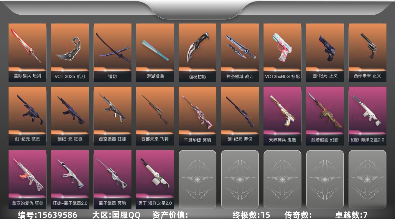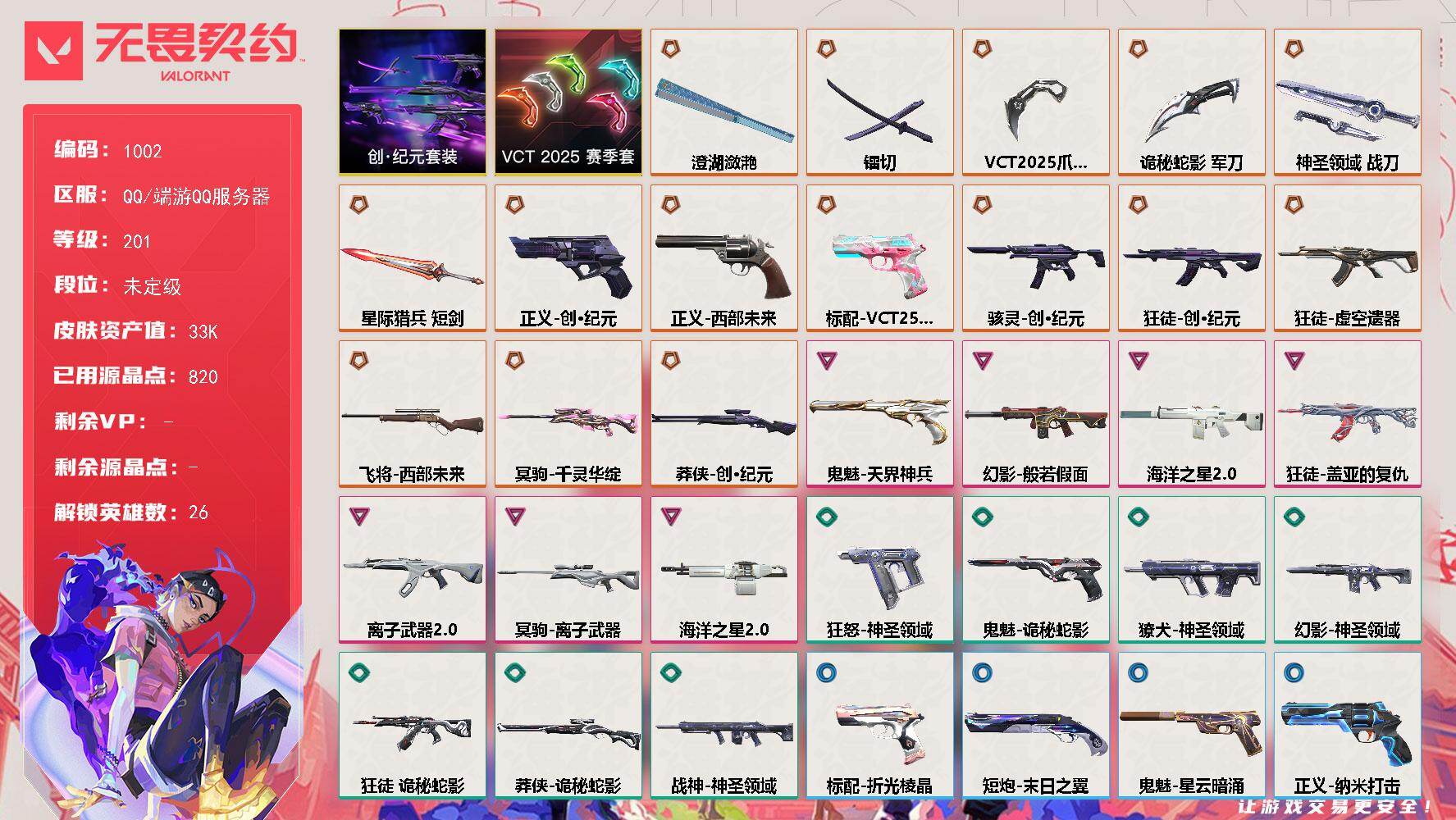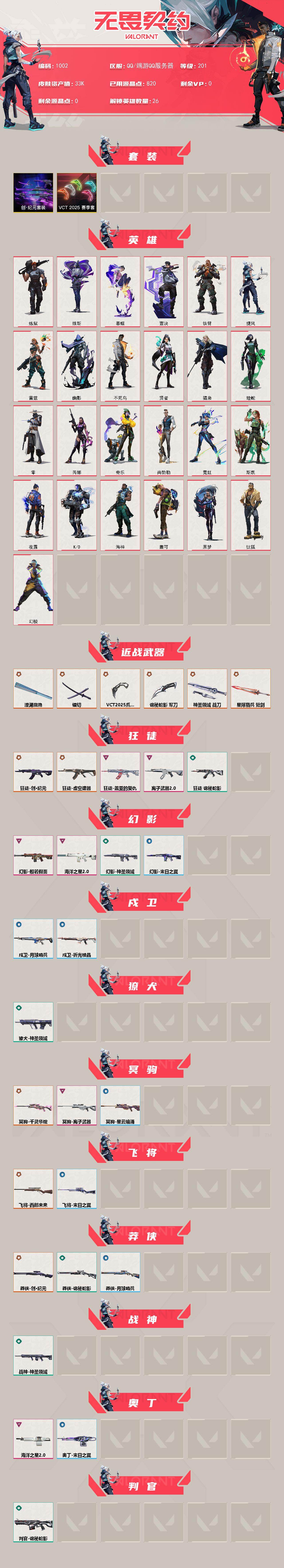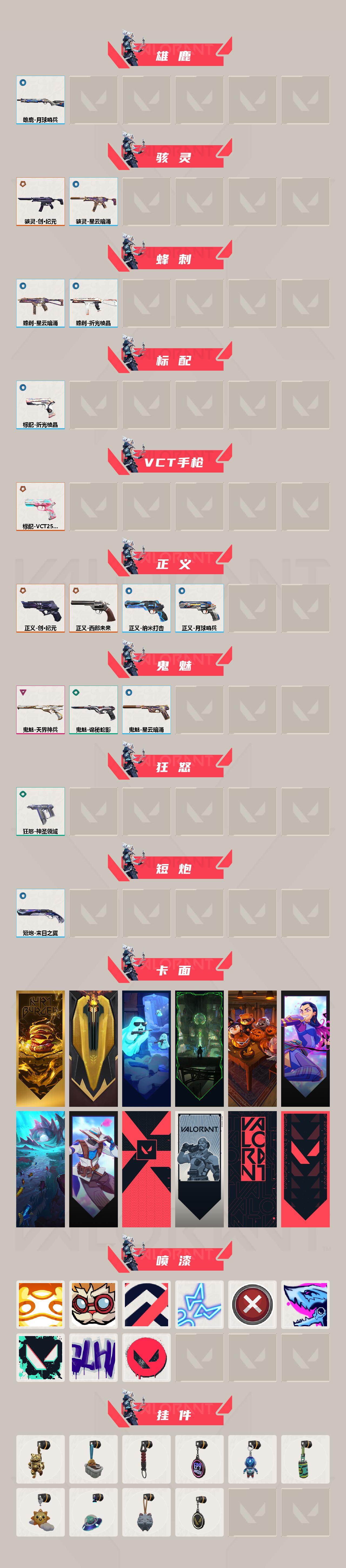[15639586]【套装】:VCT 2025 赛季套装,创·纪元套装 【英雄】:幻棱,炼狱,维斯,暮蝶,钛狐,壹决,铁臂,捷风,雷兹,幽影,不死鸟,贤者,猎枭,蝰蛇,零,芮娜,奇乐,尚勃勒,霓虹,斯凯,夜露,K/O,海神,盖可,黑梦 【近战武器】:近战武器-VCT 2025 爪刀,近战武器-镭切,近战武器-澄湖潋滟,近战武器-诡秘蛇影 军刀,近战武器-神圣领域 战刀,近战武器-星际猎兵 短剑 【狂徒】:狂徒-创·纪元,狂徒-虚空遗器,狂徒-盖亚的复仇,狂徒-离子武器//2.0,狂徒-诡秘蛇影 【幻影】:幻影-般若假面,幻影-海洋之星//2.0,幻影-神圣领域,幻影-末日之翼 【戍卫】:戍卫-月球哨兵,戍卫-折光棱晶 【獠犬】:獠犬-神圣领域 【冥驹】:冥驹-千灵华绽,冥驹-离子武器,冥驹-星云暗涌 【飞将】:飞将-西部未来,飞将-末日之翼 【莽侠】:莽侠-创·纪元,莽侠-诡秘蛇影,莽侠-月球哨兵 【战神】:战神-神圣领域 【奥丁】:奥丁-海洋之星//2.0,奥丁-末日之翼 【判官】:判官-诡秘蛇影 【雄鹿】:雄鹿-月球哨兵 【骇灵】:骇灵-创·纪元,骇灵-星云暗涌 【蜂刺】:蜂刺-星云暗涌,蜂刺-折光棱晶 【标配】:标配-折光棱晶 【VCT手枪】:标配-VCT25 x BLG 【正义】:正义-创·纪元,正义-西部未来,正义-纳米打击,正义-月球哨兵 【鬼魅】:鬼魅-天界神兵,鬼魅-诡秘蛇影,鬼魅-星云暗涌 【狂怒】:狂怒-神圣领域 【短炮】:短炮-末日之翼 【卡面】:终章:激斗汉堡 卡面,进入射程 卡面,精灵大战 卡面,欢迎来到底城 卡面,南瓜盛典 卡面,无畏契约GO!第一卷:芮娜 卡面,珍珠棘贝 卡面,无畏契约GO!第一卷:零 卡面,代号红色 卡面,新兵报到 卡面,V契约 卡面,无畏契约 卡面 【喷漆】:嗨宝南瓜灯 喷漆,都算到了 喷漆,控场勿近 喷漆,霓光四射 喷漆,买装还是存钱 喷漆,暴走萝莉 喷漆,胜利属于无畏契约 喷漆,GLHF 喷漆,无畏契约 喷漆 【挂饰】:终章:猫猫木乃伊 挂饰,悠闲鸡块 挂饰,伞绳 挂饰,第九季//第三幕 纪念币 挂饰,迷你K/O 挂饰,Z世代特饮 挂饰,云开见日 挂饰,天外飞客 挂饰,《双城之战》魄罗 挂饰,无畏契约 纪念币 挂饰