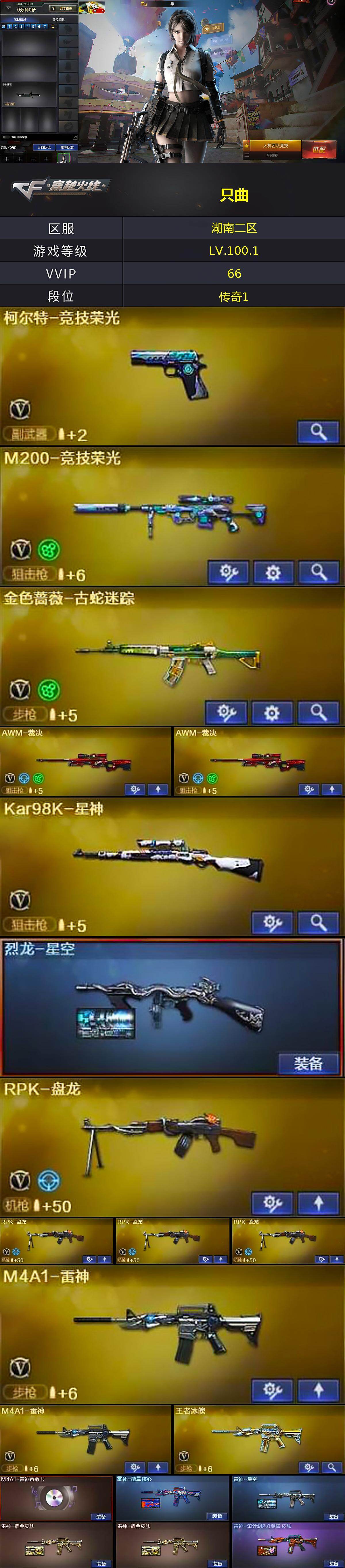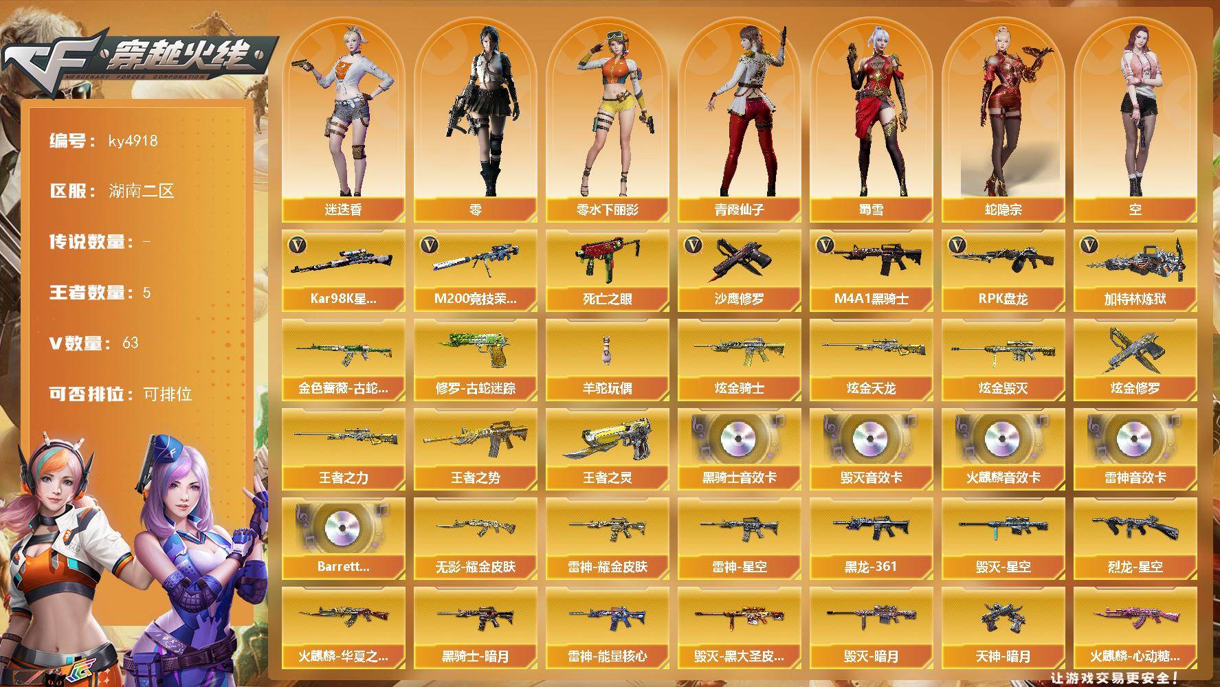 [15639896]湖南二区-63V-5王者-5炫金 【热门武器】:金色蔷薇-古蛇迷踪,修罗-古蛇迷踪,M200-竞技荣光,死亡之眼*2,Kar98K-星神,M4A1-黑骑士,RPK-盘龙*4,加特林-炼狱,羊驼玩偶,沙鹰-修罗 【王者炫金武器】:王者之势,王者之力,王者之灵,炫金骑士,炫金毁灭,炫金天龙*2,炫金修罗 【音效卡】:AK47-火麒麟音效卡,M4A1-雷神音效卡,M4A1-黑骑士音效卡,Barrett-毁灭音效卡,Barrett-碧霄极光音效卡*2 【皮肤】:烈龙-星空,雷神-能量核心,雷神-星空,雷神-耀金皮肤*2,雷神-源计划2.0专属 皮肤,火麒麟-华夏之心,火麒麟-心动糖果,毁灭-暗月*2,毁灭-星空,毁灭-黑大圣皮肤,M4A1-千变-孔明皮肤,M4A1-黑龙-361,黑骑士-暗月*3,无影-暗月*5,无影-能量核心,无影耀金皮肤,死神-秘银*4,天启-暗月*3,天龙-能量核心*2,AWM-天龙-传奇70KG,修罗-能量核心,天神-暗月 【角色】:零,迷迭香,蛇隐宗,空,芳心审判者,风暴女,嘉年华灵狐,兰-新年限定,0号玩家,零-水下丽影,灵狐者-X,龙儿,青霞仙子,蛇姬,斯沃特-X,蜀雪,影武者-X 【人偶武器】:火麒麟-灵狐,M4A1-雷神-精英刀锋,AWM-灵狐-15周年嘉年华,COP-旗袍,生化手雷-机甲核心*3 【暴走生化】:死亡之眼*2,超级对讲机 【挑战大师】:VEPR-12-金魔,激光毁灭者III 【英雄级武器】:AK47-火麒麟*3,M4A1-黑龙,M4A1-雷神*2,M4A1-黑骑士,AK47-无影*2,AK12-天启*2,M4A1-武圣*4,AK47-黑鲨,无影-神兵利器,金色蔷薇-古蛇迷踪,M4A1-猎神,王者冰魄-觉醒版,AWM-天龙,Barrett-毁灭*4,AWM-裁决*2,Kar98K-星神,M200-竞技荣光,Barrett-金色蔷薇,RPK-盘龙*4,加特林-炼狱,炼狱-悦蓝-觉醒版,沙鹰-修罗,沙鹰-天神,柯尔特-竞技荣光,修罗-古蛇迷踪,屠龙*3,龙啸*3,马来剑-夜魔,擎天,麒麟刺*3,擎天-竞技荣光,斩神刀-雷暴,高爆手雷-雷暴,高爆手雷-夜魔*2,高爆手雷-古蛇迷踪,闪光弹-雷暴,闪光弹-夜魔*2,烟雾弹-雷暴,烟雾弹-夜魔*2,烟雾弹-古蛇迷踪,M4A1-赤狱骑士,Barrett-碧霄极光 【道具】:BS战队炫彩背