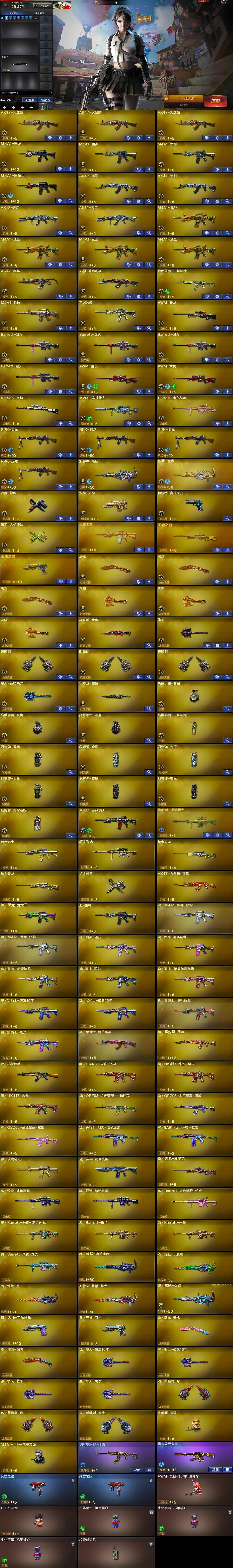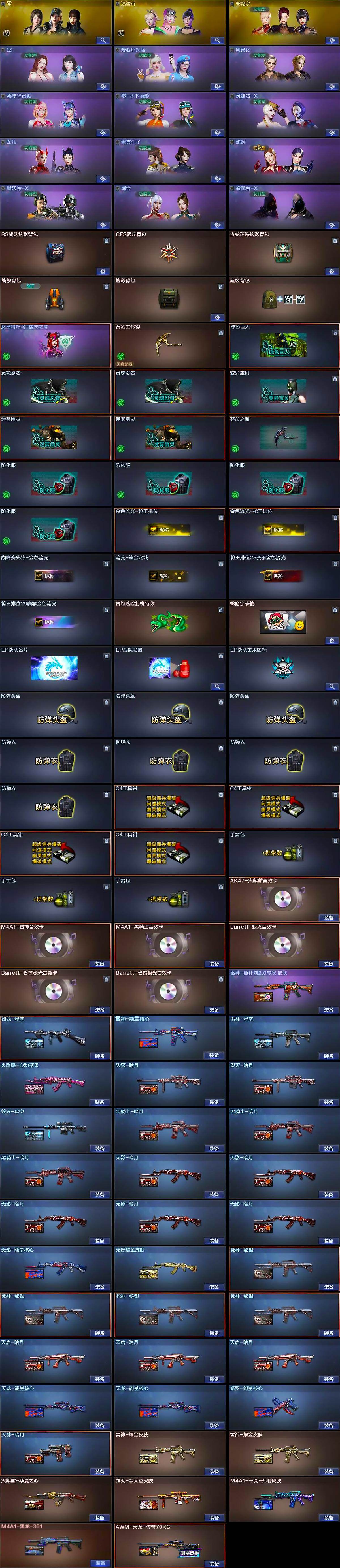 【英雄级武器】:AK47-火麒麟*3,M4A1-黑龙,M4A1-雷神*2,M4A1-黑骑士,AK47-无影*2,AK12-天启*2,M4A1-武圣*4,AK47-黑鲨,无影-神兵利器,金色蔷薇-古蛇迷踪,M4A1-猎神,王者冰魄-觉醒版,AWM-天龙,Barrett-毁灭*4,AWM-裁决*2,Kar98K-星神,M200-竞技荣光,Barrett-金色蔷薇,RPK-盘龙*4,加特林-炼狱,炼狱-悦蓝-觉醒版,沙鹰-修罗,沙鹰-天神,柯尔特-竞技荣光,修罗-古蛇迷踪,屠龙*3,龙啸*3,马来剑-夜魔,擎天,麒麟刺*3,擎天-竞技荣光,斩神刀-雷暴,高爆手雷-雷暴,高爆手雷-夜魔*2,高爆手雷-古蛇迷踪,闪光弹-雷暴,闪光弹-夜魔*2,烟雾弹-雷暴,烟雾弹-夜魔*2,烟雾弹-古蛇迷踪,M4A1-赤狱骑士,Barrett-碧霄极光