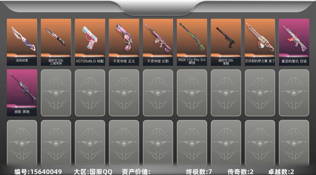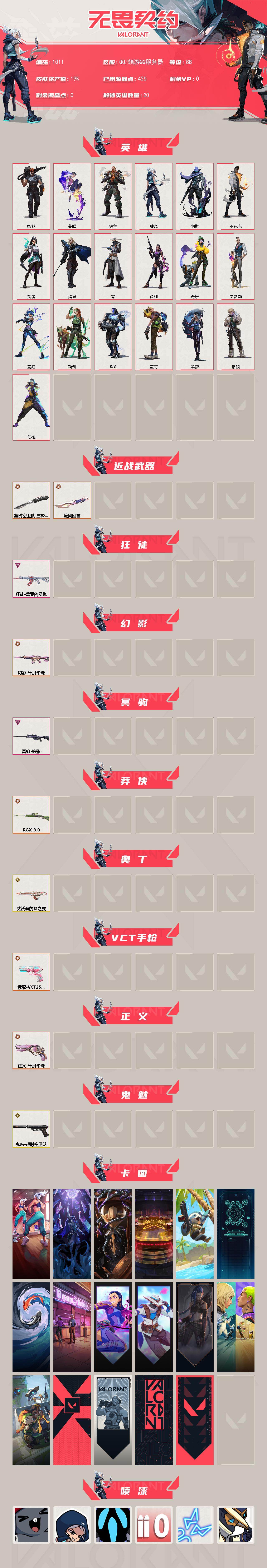 [15640049]【英雄】:幻棱,炼狱,暮蝶,铁臂,捷风,幽影,不死鸟,贤者,猎枭,零,芮娜,奇乐,尚勃勒,霓虹,斯凯,K/O,盖可,黑梦,钢锁 【近战武器】:近战武器-流风回雪,近战武器-超时空卫队 三棱军刺 【狂徒】:狂徒-盖亚的复仇 【幻影】:幻影-千灵华绽 【冥驹】:冥驹-掠影 【莽侠】:莽侠-RGX 11z Pro//3.0 【奥丁】:奥丁-艾沃莉的梦之翼 【VCT手枪】:标配-VCT25 x BLG 【正义】:正义-千灵华绽 【鬼魅】:鬼魅-超时空卫队 【卡面】:热舞环节 卡面,失而复得 卡面,时间到 卡面,最高舞台 卡面,树懒大作战 卡面,声感陷阱设计图 卡面,红鳞松叶 卡面,梦幻奶茶 卡面,无畏契约GO!第一卷:芮娜 卡面,无畏契约GO!第一卷:零 卡面,《双城之战》金克丝 卡面,钢锁vs盖可 卡面,别冒尖 卡面,代号红色 卡面,新兵报到 卡面,V契约 卡面,无畏契约 卡面 【喷漆】:超级粉丝 喷漆,捷风差距 喷漆,惊声尖叫 喷漆,拼一枪 喷漆,霓光四射 喷漆,哨卫滑步 喷漆,逮到一个 喷漆,买装还是存钱 喷漆,关门放狗 喷漆,红鳞 喷漆,无畏契约GO!第一卷:贤者 喷漆,暴走萝莉 喷漆,松叶 喷漆,无畏契约GO!第一卷:奇乐 喷漆,放下武器 喷漆,胜利属于无畏契约 喷漆,GLHF 喷漆,无畏契约 喷漆 【挂饰】:无畏契约GO!第一卷 芮娜 挂饰,薰衣草之心 挂饰,糖葫芦 挂饰,袖珍捷风 挂饰,迷你浓缩 挂饰,第九季//第一幕 纪念币 挂饰,天外飞客 挂饰,《双城之战》魄罗 挂饰,海豹的认可 挂饰,无畏契约 纪念币 挂饰