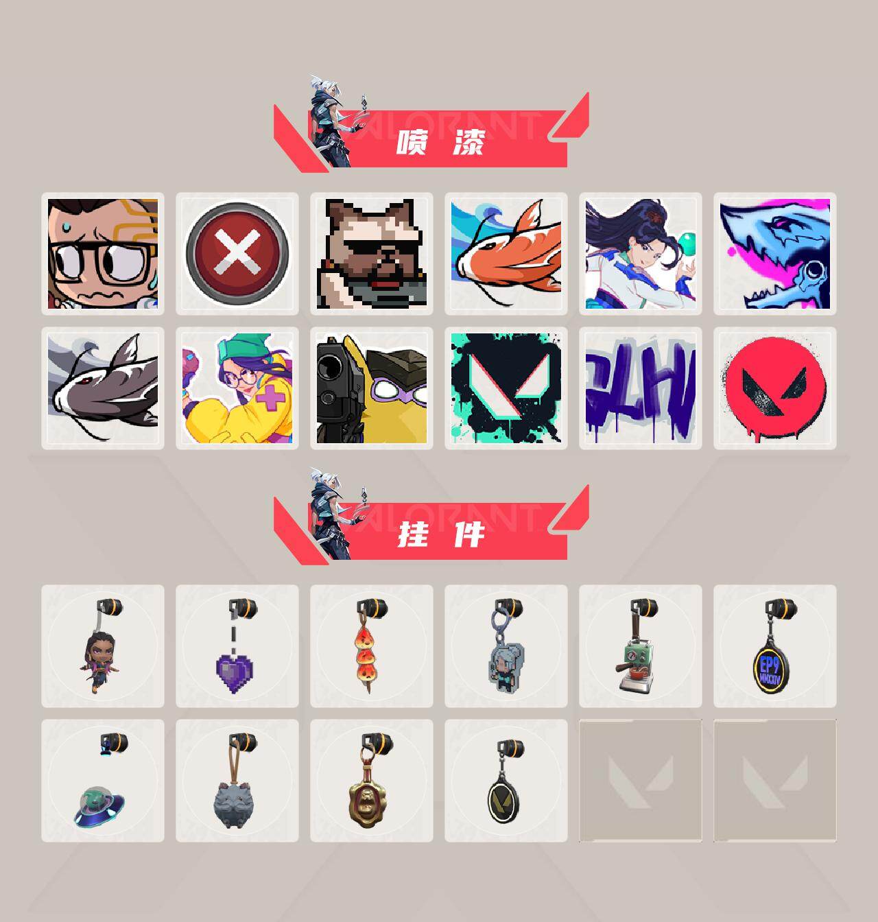 【喷漆】:超级粉丝 喷漆,捷风差距 喷漆,惊声尖叫 喷漆,拼一枪 喷漆,霓光四射 喷漆,哨卫滑步 喷漆,逮到一个 喷漆,买装还是存钱 喷漆,关门放狗 喷漆,红鳞 喷漆,无畏契约GO!第一卷:贤者 喷漆,暴走萝莉 喷漆,松叶 喷漆,无畏契约GO!第一卷:奇乐 喷漆,放下武器 喷漆,胜利属于无畏契约 喷漆,GLHF 喷漆,无畏契约 喷漆
