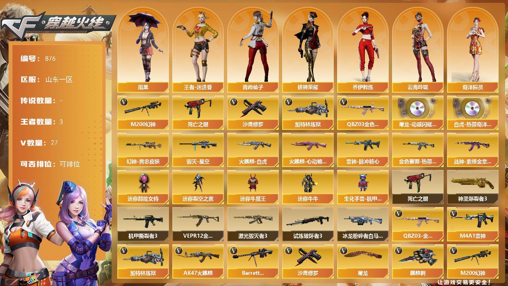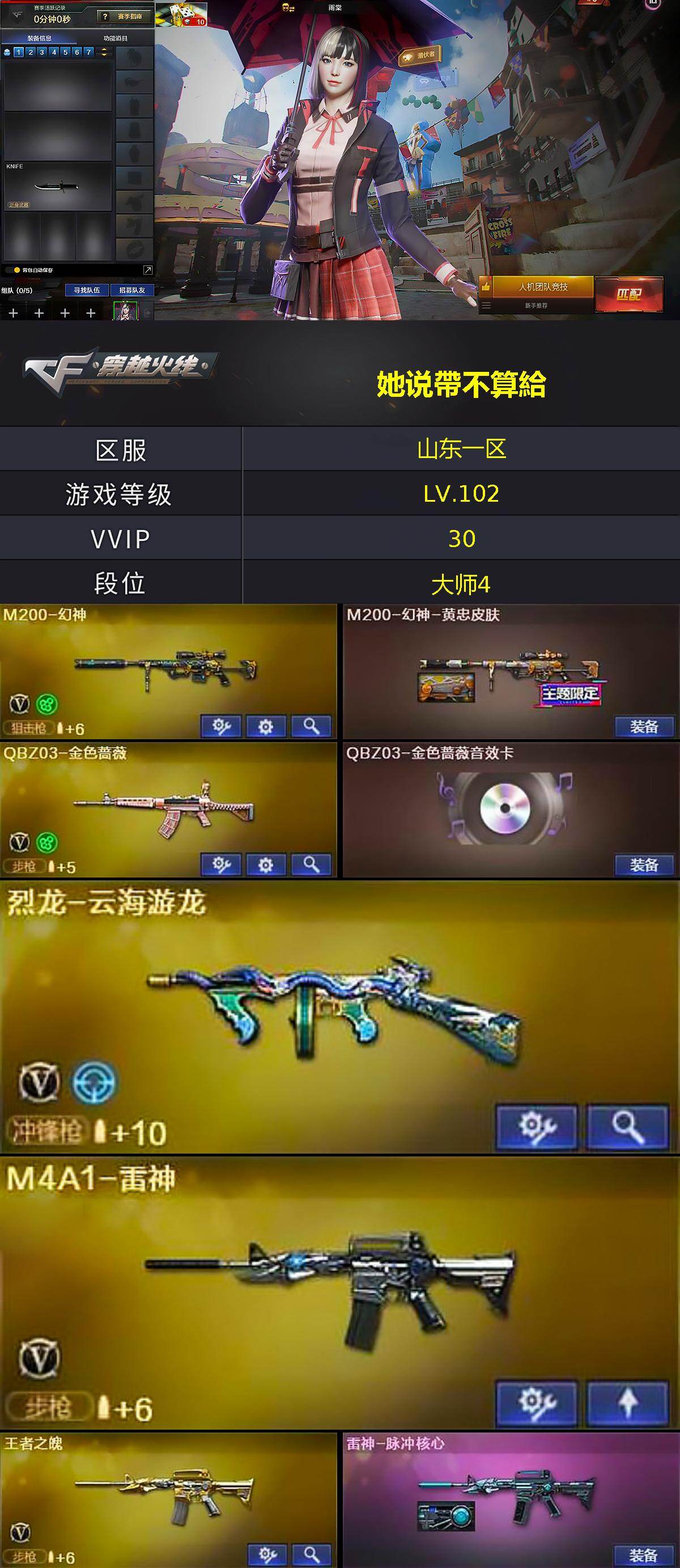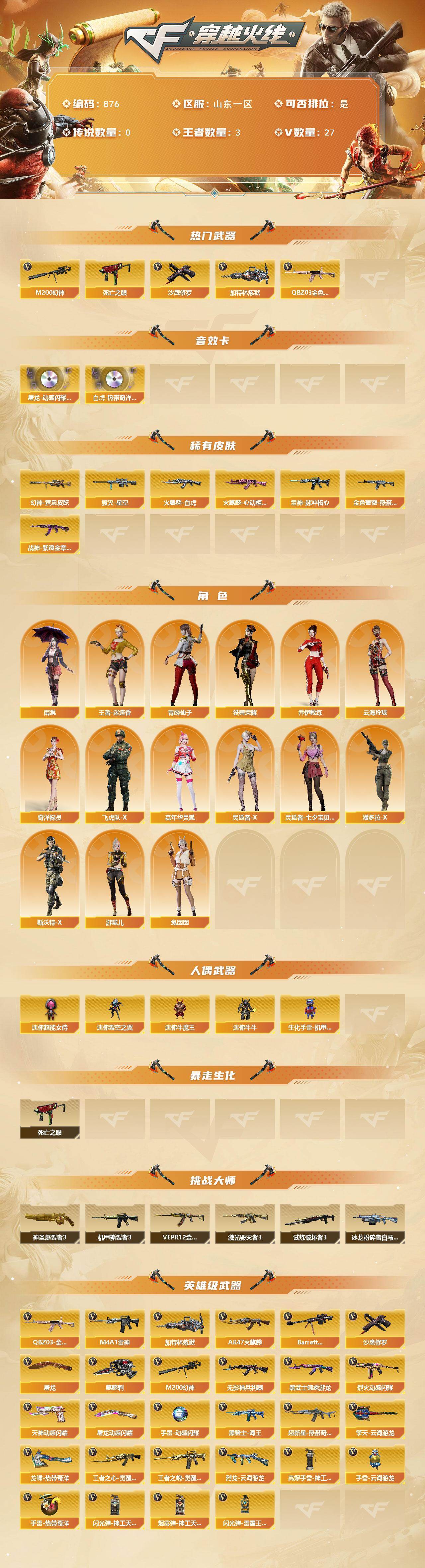 [15642991]山东一区-27V-3王者-0炫金 【热门武器】:QBZ03-金色蔷薇,M200-幻神,死亡之眼,加特林-炼狱,沙鹰-修罗 【音效卡】:屠龙-动感闪耀 音效卡,Scar Light-白虎-热带奇洋音效卡 【皮肤】:M200-幻神-黄忠皮肤,金色蔷薇-热带奇洋 皮肤,雷神-脉冲核心,火麒麟-白虎,火麒麟-心动糖果,毁灭-星空,战神-紫绶金章皮肤 【角色】:雨棠,王者-迷迭香,奇洋探员,乔伊教练,云海玲珑,飞虎队-X,嘉年华灵狐,灵狐者-X,灵狐者-七夕宝贝,潘多拉-X,青霞仙子,斯沃特-X,铁骑荣耀,兔囡囡,游珑儿 【人偶武器】:迷你裂空之翼,迷你牛魔王,迷你牛牛,生化手雷-机甲核心,迷你超能女侍 【暴走生化】:死亡之眼 【挑战大师】:神圣爆裂者III,冰龙粉碎者-白马银枪*2,VEPR-12-金魔,激光毁灭者III,机甲撕裂者III,试炼破坏者III 【英雄级武器】:AK47-火麒麟*2,M4A1-雷神,无影-神兵利器,黑武士-锦绣游龙,超新星-热带奇洋,QBZ03-金色蔷薇,烈火-动感闪耀,王者之心-觉醒版,王者之魄-觉醒版,黑骑士-海王,Barrett-毁灭,M200-幻神,加特林-炼狱,烈龙-云海游龙,沙鹰-修罗,天神-动感闪耀,屠龙,麒麟刺,屠龙-动感闪耀,擎天-云海游龙,龙啸-热带奇洋,高爆手雷-神工天巧,手雷-动感闪耀,手雷-云海游龙,手雷-热带奇洋,闪光弹-神工天巧,闪光弹-雷霆王者-觉醒版,烟雾弹-神工天巧*2 【道具】:云海游龙炫彩背包,奇洋探员-海龟背包,炫彩背包,热带奇洋炫彩背包,虎牙炫彩背包,超级背包,变异宝贝,生化弹匣,夺命之镰,防化服,金色流光-枪王排位*2,星辰流光-枪王排位,枪王排位28赛季金色流光,电玩兔兔表情,热带奇洋表情,动感闪耀表情,云海游龙表情,防弹头盔*3,防弹衣*3,C4工具钳*3,手雷包*3 【特殊枪械】:1炼狱