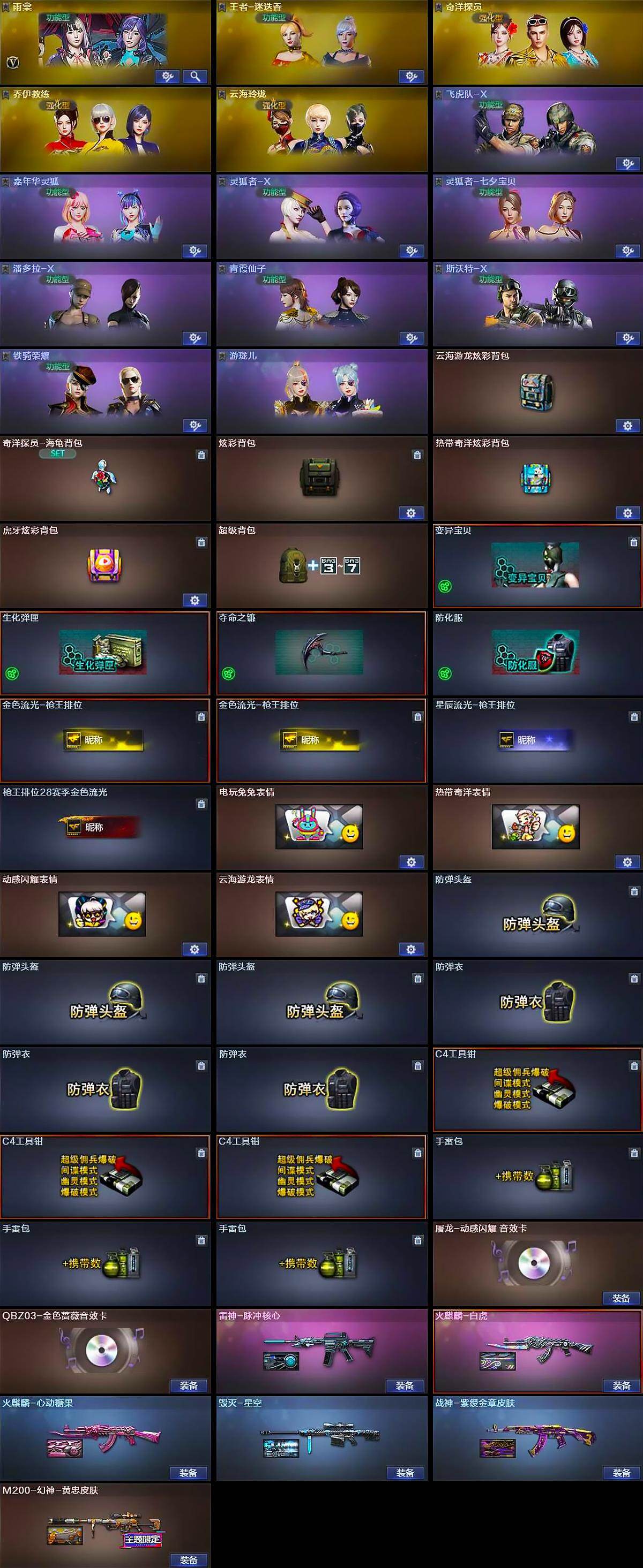 【道具】:云海游龙炫彩背包,奇洋探员-海龟背包,炫彩背包,热带奇洋炫彩背包,虎牙炫彩背包,超级背包,变异宝贝,生化弹匣,夺命之镰,防化服,金色流光-枪王排位*2,星辰流光-枪王排位,枪王排位28赛季金色流光,电玩兔兔表情,热带奇洋表情,动感闪耀表情,云海游龙表情,防弹头盔*3,防弹衣*3,C4工具钳*3,手雷包*3