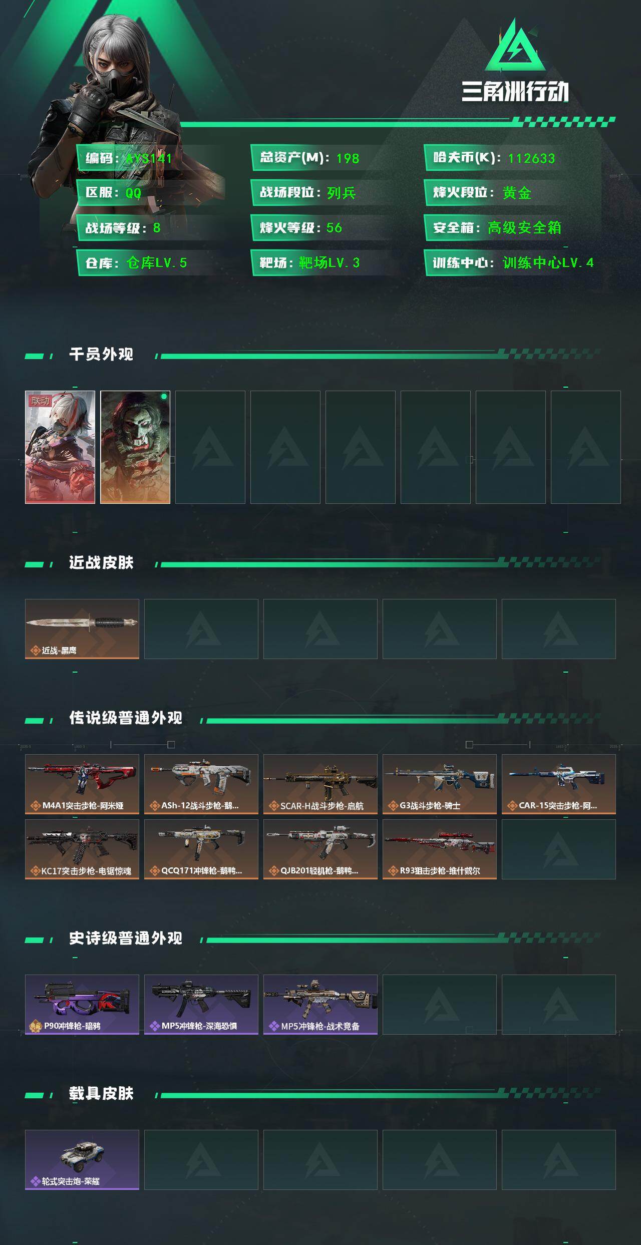 [15643096]【店主推荐捡漏号!可直接换绑】 112633k哈伏币-194m流动资产-56烽火等级-黄金-8战场等级-列兵 【干员外观】:骇爪-维什戴尔,红狼-电锯惊魂 【近战皮肤】:近战-黑鹰 【传说外观】:M4A1突击步枪-阿米娅,ASh-12战斗步枪-鹅鸭杀,SCAR-H战斗步枪-启航,G3战斗步枪-骑士,CAR-15突击步枪-阿米娅,KC17突击步枪-电锯惊魂,QCQ171冲锋枪-鹅鸭杀,QJB201轻机枪-鹅鸭杀,R93狙击步枪-维什戴尔 【史诗外观】:P90冲锋枪-暗鸦,MP5冲锋枪-深海恐惧,MP5冲锋枪-战术竞备 【稀有外观】:QBZ95-1突击步枪-公平竞技,M7战斗步枪-捣蛋鬼,SCAR-H战斗步枪-荣耀列队,MP5冲锋枪-弄臣,MP5冲锋枪-哈夫克卫队,P90冲锋枪-黄昏,P90冲锋枪-捣蛋鬼,Vector冲锋枪-先锋,SMG-45-行动开启,Mini-14射手步枪-荣耀列队,SKS射手步枪-弄臣 【普通外观】:M4A1突击步枪-粉色涂装,M4A1突击步枪-高雅黑,M4A1突击步枪-海色,QBZ95-1突击步枪-高雅黑,QBZ95-1突击步枪-海浪,K416突击步枪-几何迷彩,M16A4突击步枪-高雅黑,AUG突击步枪-浅蓝涂装,SG552突击步枪-浅蓝涂装,SCAR-H战斗步枪-数码迷彩,G3战斗步枪-高雅黑,MP5冲锋枪-黄蜂,UZI冲锋枪-海色,M1014霰弹枪-海浪,M250通用机枪-条纹,SR-25射手步枪-黄蜂,SV-98狙击步枪-红色涂装,QSZ92G-条纹,沙漠之鹰-海浪 【载具外观】:轮式突击炮-荣耀 【军牌】:军牌-装备修理,军牌-享受音乐,军牌-神秘艺术,军牌-信誉优秀 【挂饰】:挂饰-维什戴尔,挂饰-诡影狙击兵,挂饰-启程