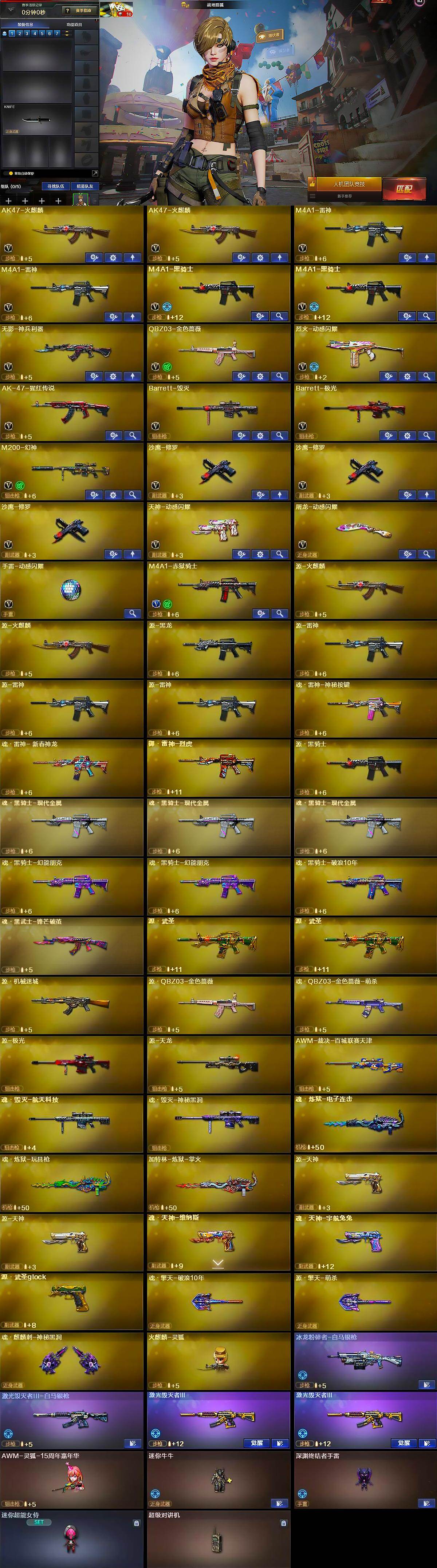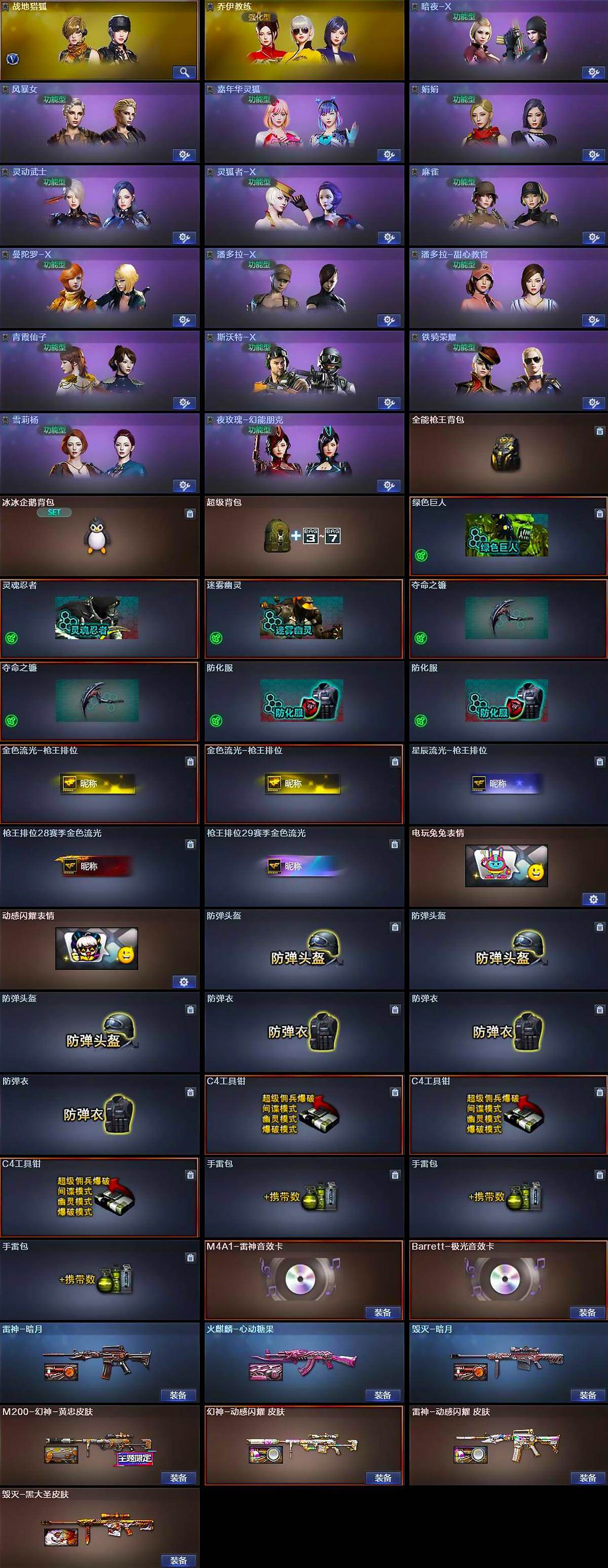 【英雄级武器】:AK47-火麒麟*2,M4A1-雷神*2,M4A1-黑骑士*2,无影-神兵利器,QBZ03-金色蔷薇,烈火-动感闪耀,AK-47-猩红传说,Barrett-毁灭,Barrett-极光,M200-幻神,沙鹰-修罗*3,天神-动感闪耀,屠龙-动感闪耀,手雷-动感闪耀,M4A1-赤狱骑士