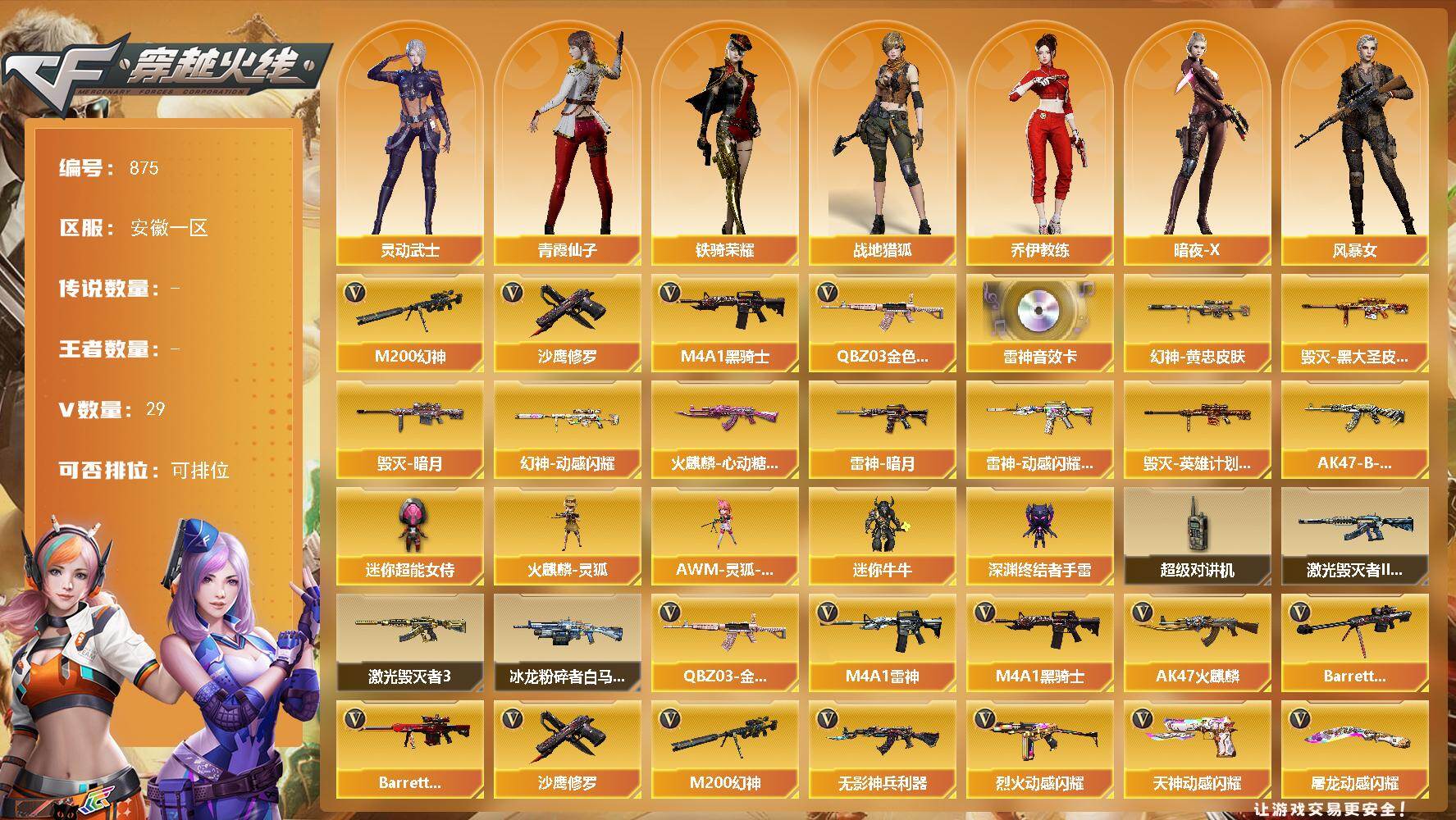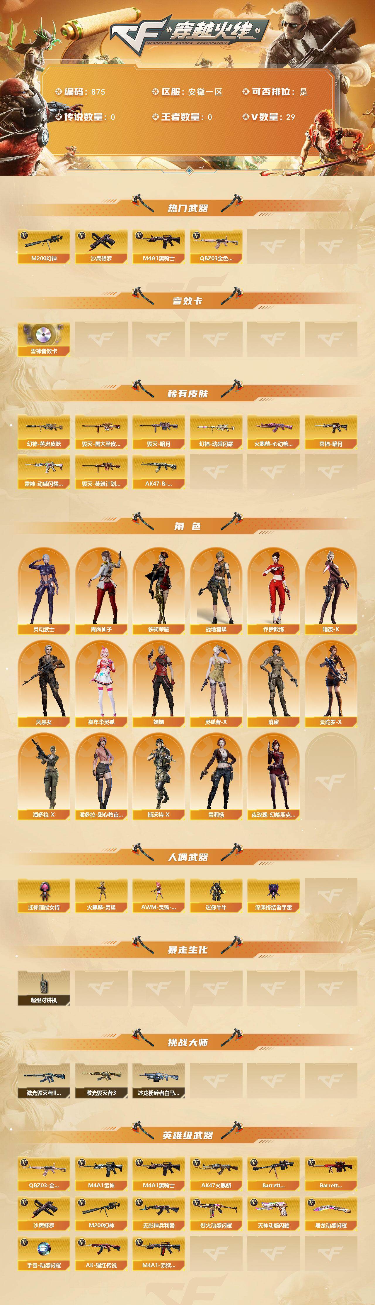 [15643099]安徽一区-29V-0王者-0炫金 【热门武器】:QBZ03-金色蔷薇,M200-幻神,M4A1-黑骑士*2,沙鹰-修罗*3 【音效卡】:M4A1-雷神音效卡 【皮肤】:M200-幻神-黄忠皮肤,幻神-动感闪耀 皮肤,雷神-暗月,雷神-动感闪耀 皮肤,火麒麟-心动糖果,毁灭-暗月,毁灭-黑大圣皮肤,毁灭-英雄计划 皮肤,AK47-B-常胜将军-刘备 【角色】:战地猎狐,乔伊教练,暗夜-X,风暴女,嘉年华灵狐,娟娟,灵动武士,灵狐者-X,麻雀,曼陀罗-X,潘多拉-X,潘多拉-甜心教官,青霞仙子,斯沃特-X,铁骑荣耀,雪莉杨,夜玫瑰-幻能朋克 【人偶武器】:火麒麟-灵狐,AWM-灵狐-15周年嘉年华,迷你牛牛,深渊终结者手雷,迷你超能女侍 【暴走生化】:超级对讲机 【挑战大师】:冰龙粉碎者-白马银枪,激光毁灭者III-白马银枪,激光毁灭者III*2 【英雄级武器】:AK47-火麒麟*2,M4A1-雷神*2,M4A1-黑骑士*2,无影-神兵利器,QBZ03-金色蔷薇,烈火-动感闪耀,AK-47-猩红传说,Barrett-毁灭,Barrett-极光,M200-幻神,沙鹰-修罗*3,天神-动感闪耀,屠龙-动感闪耀,手雷-动感闪耀,M4A1-赤狱骑士 【道具】:全能枪王背包,冰冰企鹅背包,超级背包,绿色巨人,灵魂忍者,迷雾幽灵,夺命之镰*2,防化服*2,金色流光-枪王排位*2,星辰流光-枪王排位,枪王排位28赛季金色流光,枪王排位29赛季金色流光,电玩兔兔表情,动感闪耀表情,防弹头盔*3,防弹衣*3,C4工具钳*3,手雷包*3 【特殊枪械】:2黑骑士