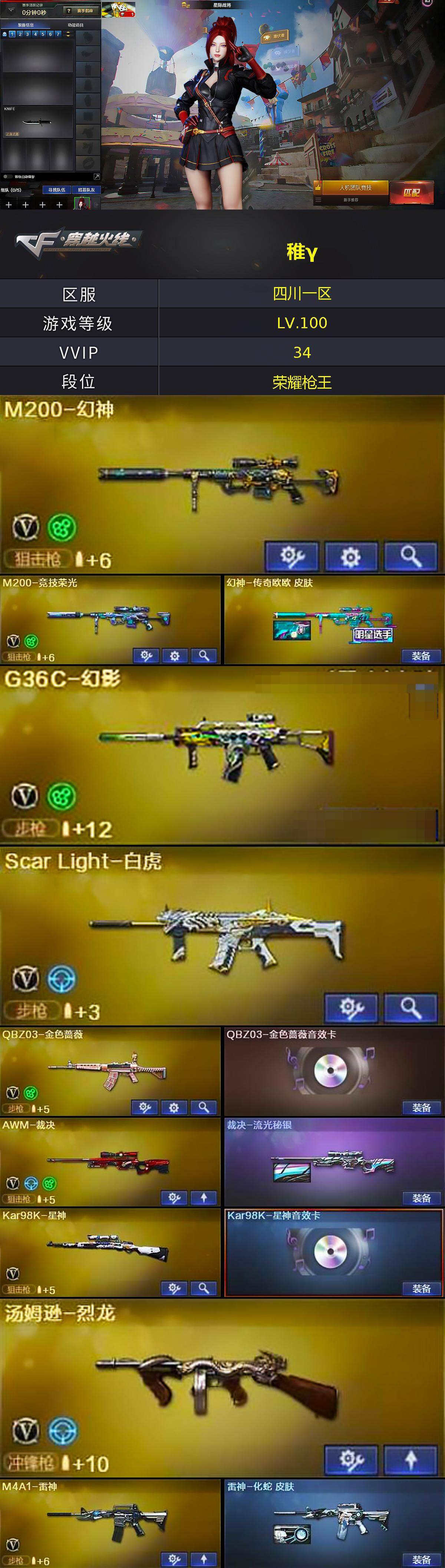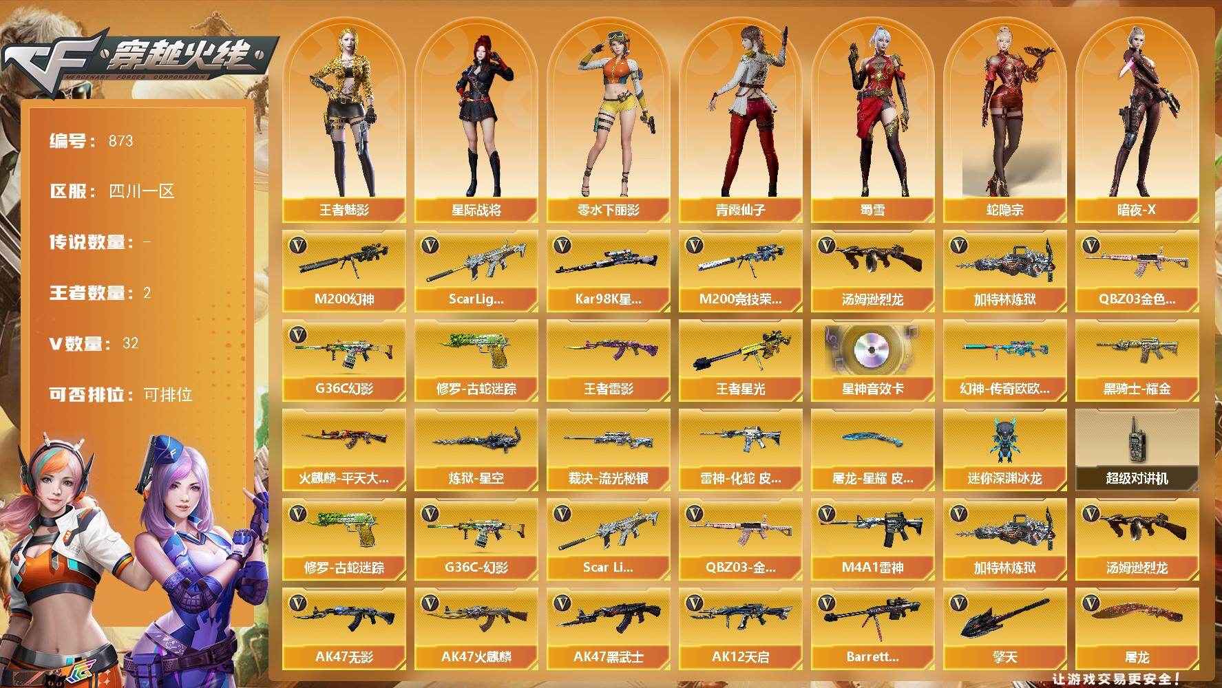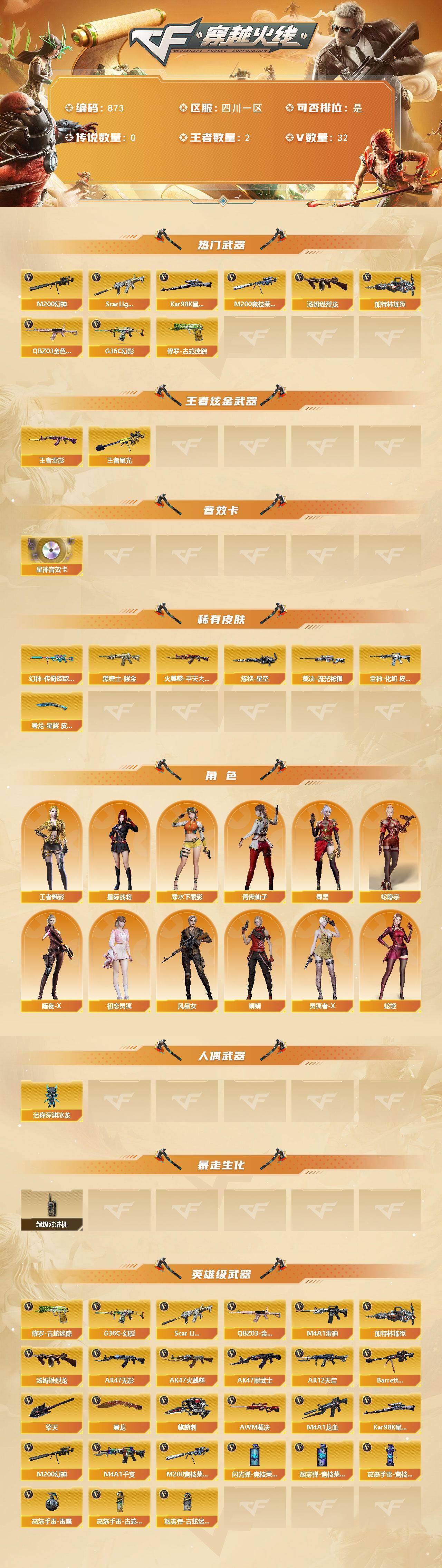 [15643366]四川一区-32V-2王者-0炫金 【热门武器】:G36C-幻影,QBZ03-金色蔷薇,Scar Light-白虎,M200-幻神,修罗-古蛇迷踪,M200-竞技荣光,Kar98K-星神,汤姆逊-烈龙,加特林-炼狱 【王者炫金武器】:王者雷影,王者星光 【音效卡】:Kar98K-星神音效卡 【皮肤】:幻神-传奇欧欧 皮肤,裁决-流光秘银,雷神-化蛇 皮肤,火麒麟-平天大圣,黑骑士耀金皮肤,炼狱-星空,屠龙-星耀 皮肤 【角色】:星际战将,王者-魅影,蛇隐宗,暗夜-X,初恋灵狐,风暴女,娟娟,零-水下丽影,灵狐者-X,青霞仙子,蛇姬,蜀雪 【人偶武器】:迷你深渊冰龙 【暴走生化】:超级对讲机 【英雄级武器】:M4A1-千变,AK47-火麒麟,M4A1-雷神,AK47-无影,AK47-黑武士,AK12-天启*2,M4A1-龙血*2,Scar Light-白虎,G36C-幻影,QBZ03-金色蔷薇,Barrett-毁灭,AWM-裁决,M200-幻神,Kar98K-星神,M200-竞技荣光,加特林-炼狱,汤姆逊-烈龙,修罗-古蛇迷踪,屠龙*2,擎天,麒麟刺,高爆手雷-雷霆,高爆手雷-竞技荣光*2,高爆手雷-古蛇迷踪,闪光弹-竞技荣光*2,烟雾弹-竞技荣光*2,烟雾弹-古蛇迷踪 【道具】:BS战队炫彩背包,古蛇迷踪炫彩背包,超级背包,绿色巨人,灵魂忍者,迷雾幽灵,生化弹匣,夺命之镰,防化服*2,金色流光-枪王排位,枪王排位28赛季金色流光,枪王排位29赛季金色流光,古蛇迷踪打击特效,蛇隐宗表情,EP战队名片,防弹头盔*3,防弹衣*4,C4工具钳*3,手雷包*3 【特殊枪械】:1白虎,1烈龙,1炼狱