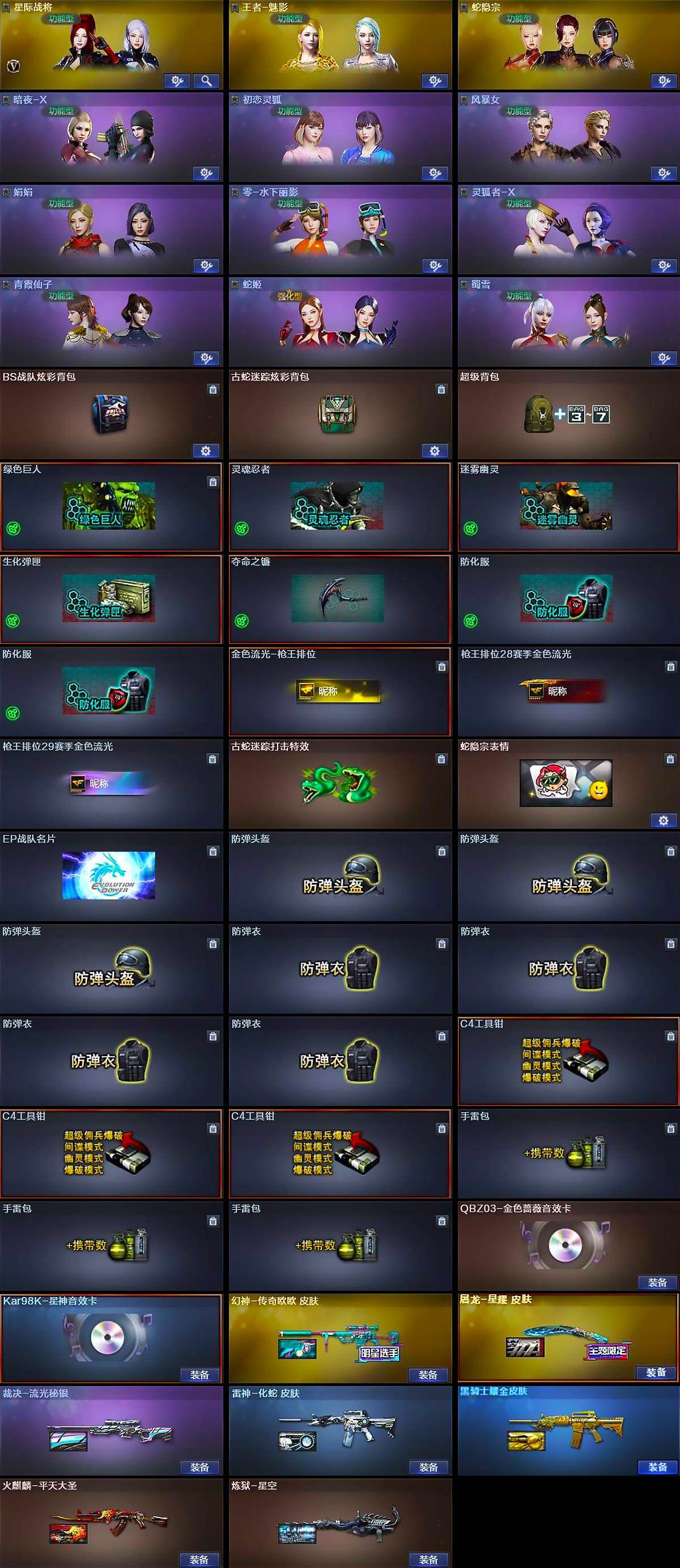 【道具】:BS战队炫彩背包,古蛇迷踪炫彩背包,超级背包,绿色巨人,灵魂忍者,迷雾幽灵,生化弹匣,夺命之镰,防化服*2,金色流光-枪王排位,枪王排位28赛季金色流光,枪王排位29赛季金色流光,古蛇迷踪打击特效,蛇隐宗表情,EP战队名片,防弹头盔*3,防弹衣*4,C4工具钳*3,手雷包*3