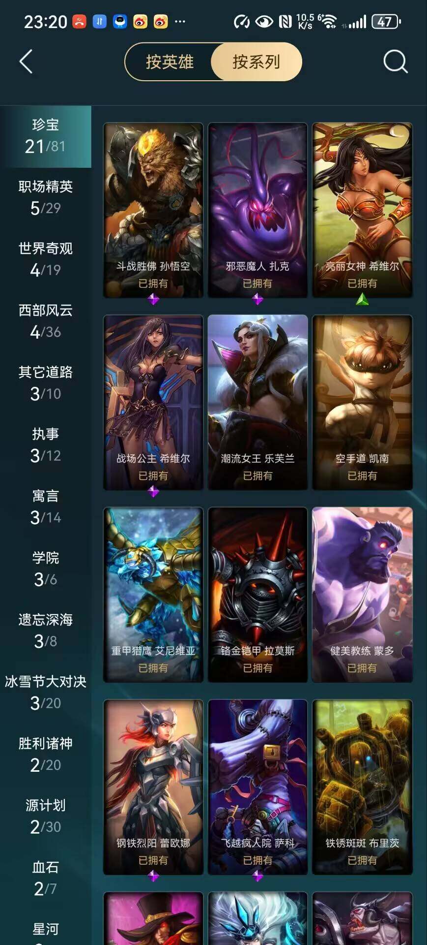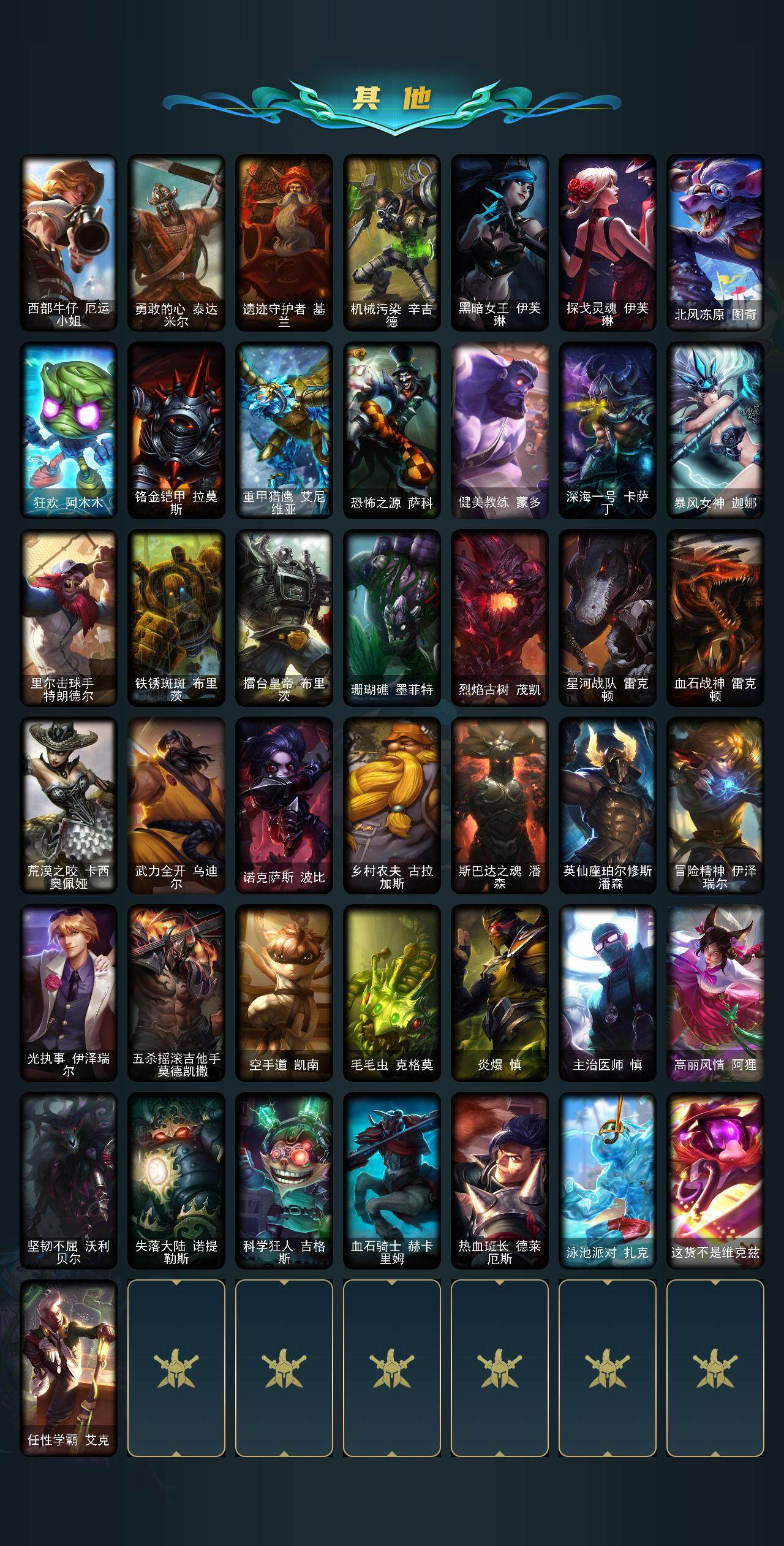 【其他皮肤1】:幽蓝梦魇加里奥,风执事加里奥,逆转裁判崔斯特,皇家守卫赵信,潮流女王乐芙兰,末世天使凯尔,玉剑传说无极,荒野镖客阿利斯塔,黑暗骑士阿利斯塔,宗师级法师训练师瑞兹,原野伐木工赛恩,森林女神索拉卡,约德尔海贼团崔丝塔娜,荒野巨兽努努和威朗普,西部牛仔厄运小姐,勇敢的心泰达米尔,遗迹守护者基兰,机械污染辛吉德,黑暗女王伊芙琳,探戈灵魂伊芙琳,北风冻原图奇,狂欢阿木木,铬金铠甲拉莫斯,重甲猎鹰艾尼维亚,恐怖之源萨科,健美教练蒙多,深海一号卡萨丁,暴风女神迦娜,里尔击球手特朗德尔,铁锈斑斑布里茨,擂台皇帝布里茨,珊瑚礁墨菲特,烈焰古树茂凯,星河战队雷克顿,血石战神雷克顿,荒漠之咬卡西奥佩娅,武力全开乌迪尔,诺克萨斯波比,乡村农夫古拉加斯,斯巴达之魂潘森,英仙座珀尔修斯潘森,冒险精神伊泽瑞尔,光执事伊泽瑞尔,五杀摇滚吉他手莫德凯撒,空手道凯南,毛毛虫克格莫,炎爆慎,主治医师慎,高丽风情阿狸,坚韧不屈沃利贝尔,失落大陆诺提勒斯,科学狂人吉格斯,血石骑士赫卡里姆,热血班长德莱厄斯
