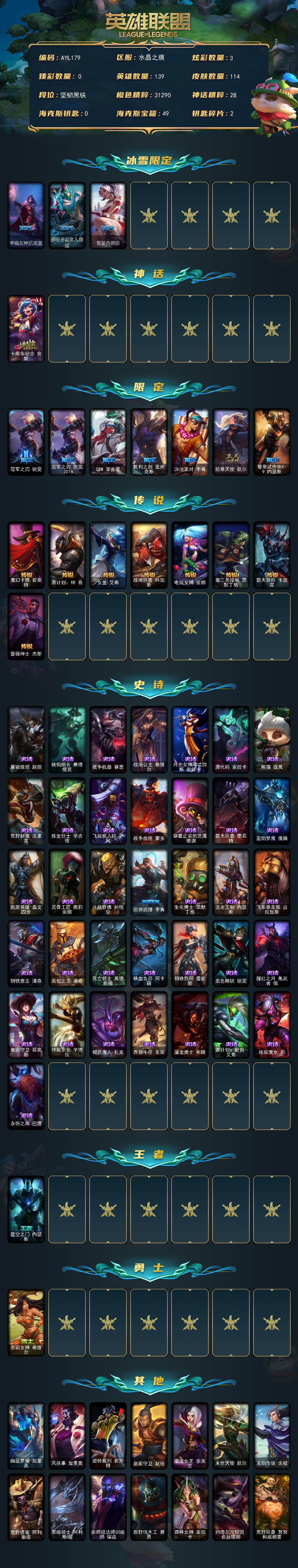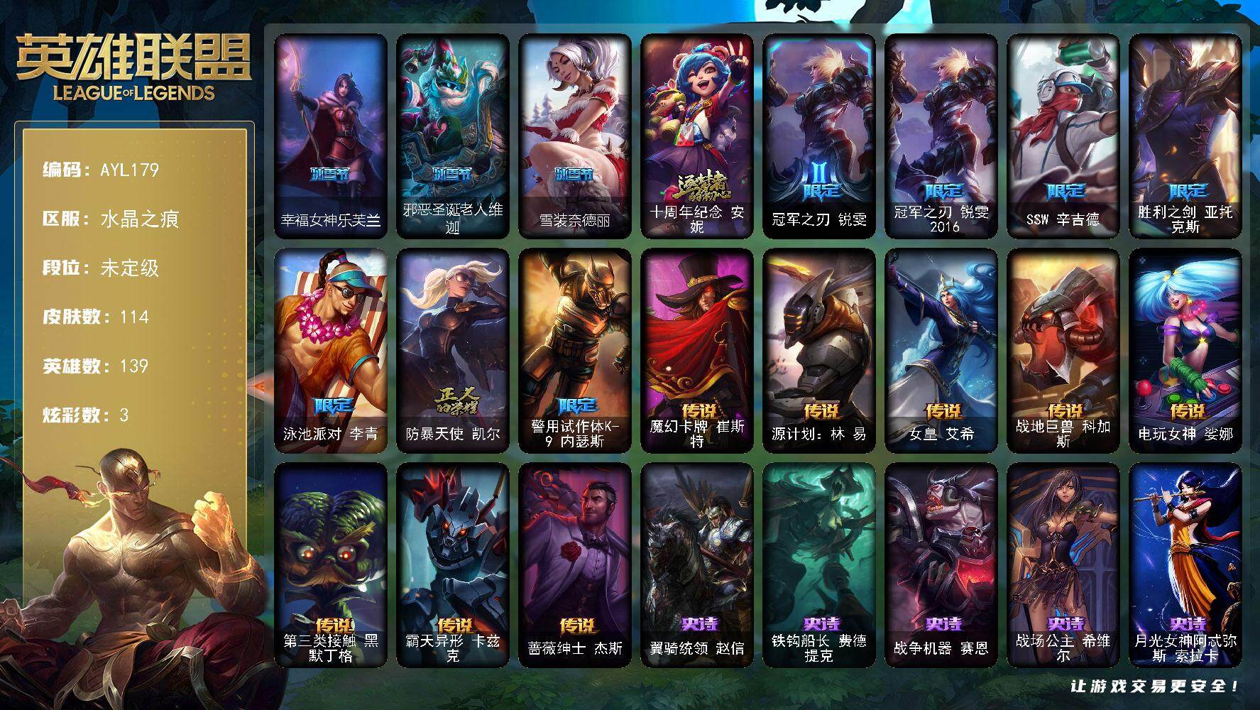[15643614]【特价出售/店主推荐】未定级段位-139英雄-114皮肤-3炫彩-0终极-1神话-10限定-8传说-36史诗 【冰雪限定】:幸福女神乐芙兰,邪恶圣诞老人维迦,雪装奈德丽 【神话皮肤】:十周年纪念安妮 【限定皮肤】:冠军之刃锐雯,冠军之刃锐雯2016,SSW辛吉德,胜利之剑亚托克斯,泳池派对李青,防暴天使凯尔,警用试作体K9内瑟斯 【传说皮肤】:魔幻卡牌崔斯特,源计划林易,女皇艾希,战地巨兽科加斯,电玩女神娑娜,第三类接触黑默丁格,霸天异形卡兹克,蔷薇绅士杰斯 【史诗皮肤】:翼骑统领赵信,铁钩船长费德提克,战争机器赛恩,战场公主希维尔,月光女神阿忒弥斯索拉卡,源代码索拉卡,熊猫提莫,荒野豺狼沃里克,炼金狂士辛吉德,飞越疯人院萨科,战争血统蒙多,穿着正装的恶魔维迦,霸天巨兽墨菲特,蓝焰梦魔魔腾,凯旋英雄嘉文四世,灵骨工匠奥莉安娜,斗战胜佛孙悟空,防弹武僧李青,生化博士黑默丁格,法老王朝内瑟斯,飞车暴走族古拉加斯,钢铁意志潘森,面包之王潘森,死亡领主莫德凯撒,铁血女忍阿卡丽,钢铁烈阳蕾欧娜,血色精锐锐雯,腥红之月鬼武者慎,皇家守卫菲奥娜,仲裁圣女辛德拉,邪恶魔人扎克,西部牛仔亚索,屠龙勇士布隆,源计划自由艾克,炼狱魔女蔚,永恒之森巴德 【王者皮肤】:星空之门内瑟斯 【勇士皮肤】:亮丽女神希维尔 【其他皮肤1】:幽蓝梦魇加里奥,风执事加里奥,逆转裁判崔斯特,皇家守卫赵信,潮流女王乐芙兰,末世天使凯尔,玉剑传说无极,荒野镖客阿利斯塔,黑暗骑士阿利斯塔,宗师级法师训练师瑞兹,原野伐木工赛恩,森林女神索拉卡,约德尔海贼团崔丝塔娜,荒野巨兽努努和威朗普,西部牛仔厄运小姐,勇敢的心泰达米尔,遗迹守护者基兰,机械污染辛吉德,黑暗女王伊芙琳,探戈灵魂伊芙琳,北风冻原图奇,狂欢阿木木,铬金铠甲拉莫斯,重甲猎鹰艾尼维亚,恐怖之源萨科,健美教练蒙多,深海一号卡萨丁,暴风女神迦娜,里尔击球手特朗德尔,铁锈斑斑布里茨,擂台皇帝布里茨,珊瑚礁墨菲特,烈焰古树茂凯,星河战队雷克顿,血石战神雷克顿,荒漠之咬卡西奥佩娅,武力全开乌迪尔,诺克萨斯波比,乡村农夫古拉加斯,斯巴达之魂潘森,英仙座珀尔修斯潘森,冒险精神伊泽瑞尔,光执事伊泽瑞尔,五杀摇滚吉他手莫德凯撒,空手道凯南,毛毛虫克格莫,炎爆慎,主治医师慎,高丽风情阿狸,坚韧不屈沃利贝尔,失落大陆诺提勒斯,科学狂人吉格斯,血石骑士赫卡里姆,热血班长德莱厄斯