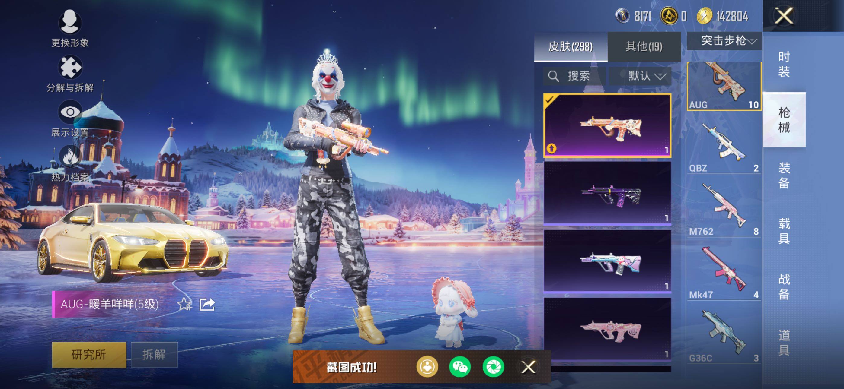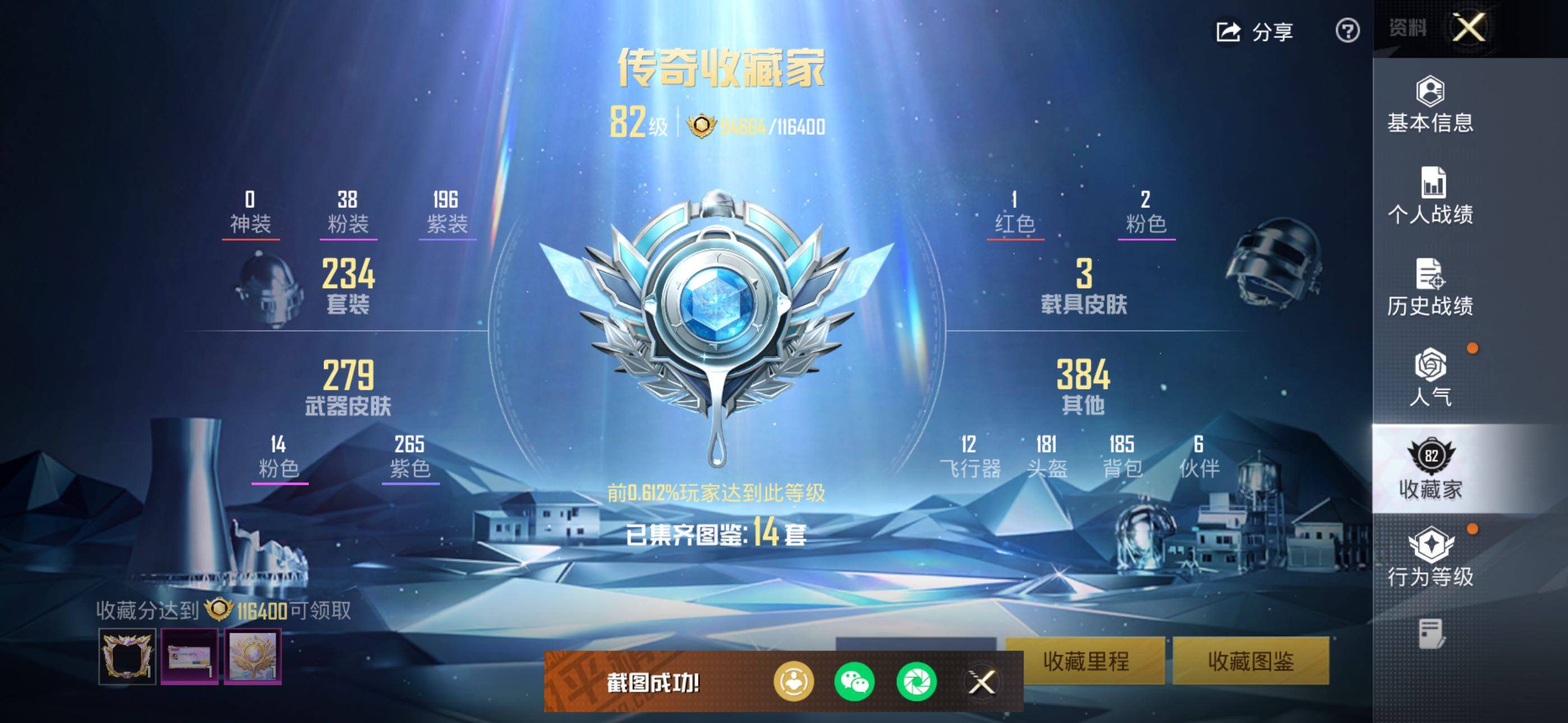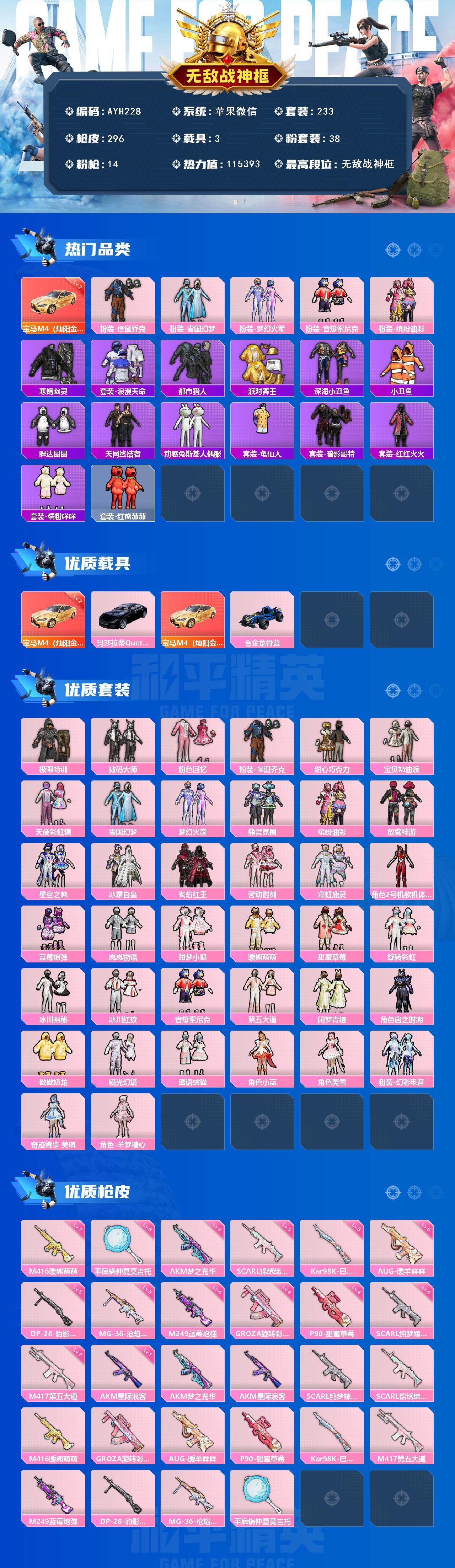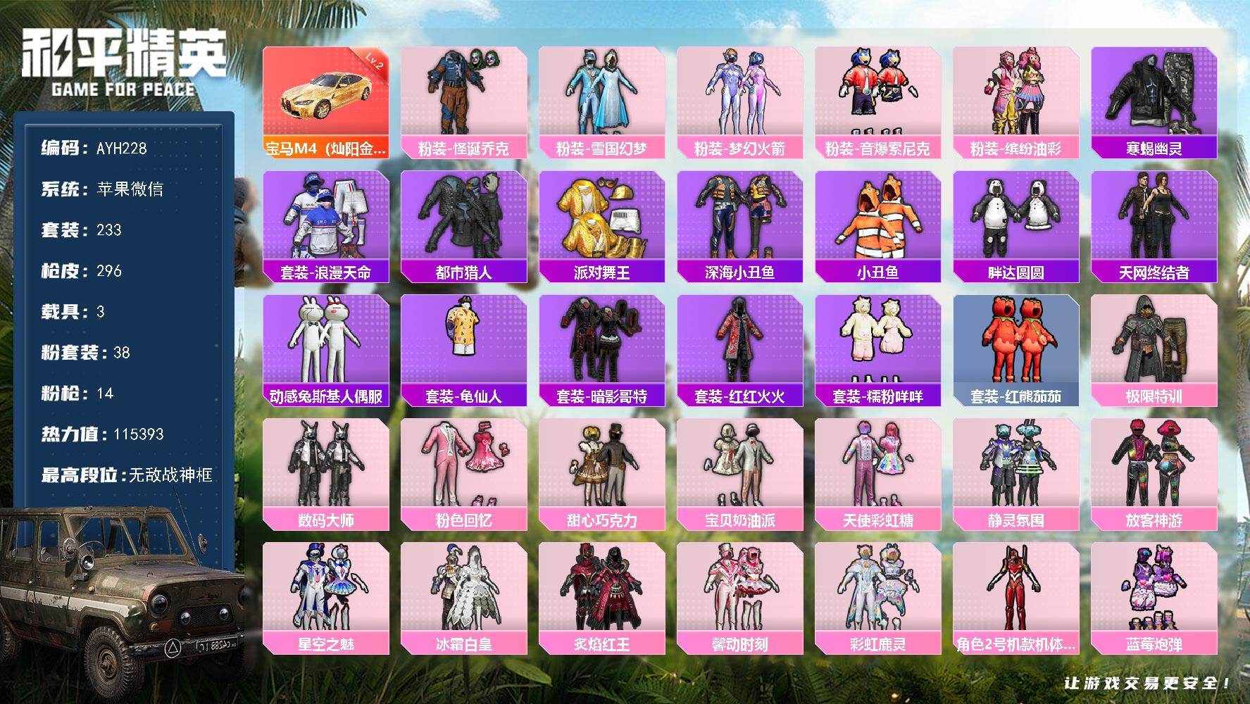 苹果 微信-无敌战神框-38粉装-14特效枪-3载具-5粉色飞行器-115393热力值-16王牌印记-233套装-296枪皮