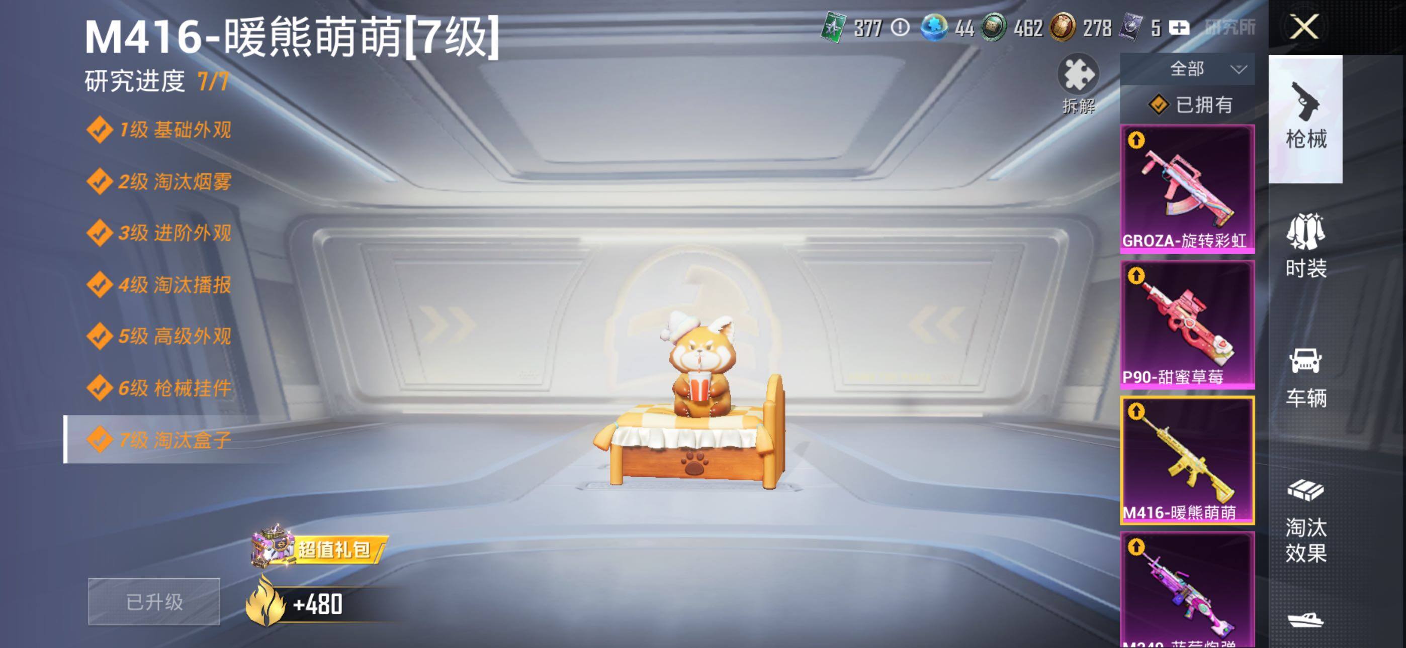 【粉色枪皮等级】:AKM-梦之光华(五级),AKM-星际浪客(一级),SCAR-L-纯梦嫁纱(四级),SCAR-L-锦绣绵绵(五级),M416-暖熊萌萌(七级),GROZA-旋转彩虹(四级),AUG-暖羊咩咩(五级),P90-甜蜜草莓(四级),Kar98K-巳巳如意(五级),M417-第五大道(二级),M249-蓝莓炮弹(四级),DP-28-豹影疾电(五级),MG-36-沧焰双生(五级),平底锅-仲夏莫吉托(六级)