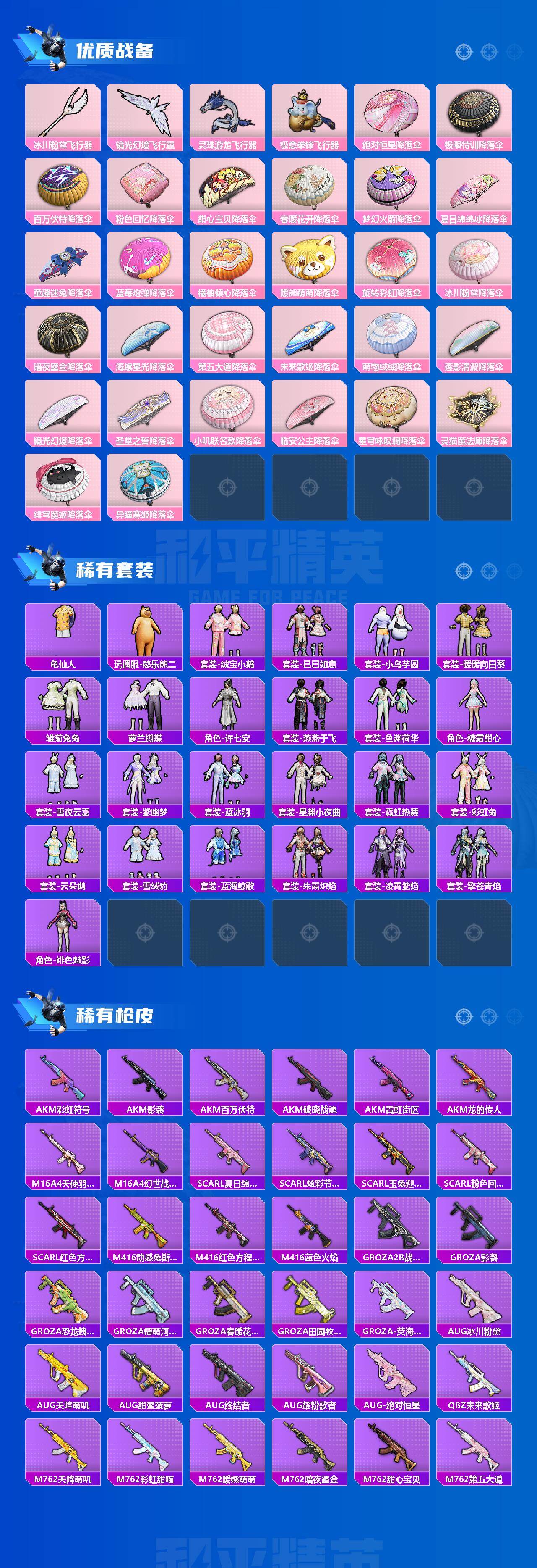 - [12587831]【966】安卓 手Q-8粉装-4特效枪-1载具-1粉色飞行器-73110热力值-8王牌印记-145套装-212枪皮 【热门品类】:套装-浪漫天命,套装-动感兔斯基人偶服,角色-2B战斗服款,套装-龟仙人 【粉色载具】:鬼马风驰 【粉色套装】:粉装-草莓生巧,粉装-蜜桃特工,粉装-蝶舞蔷薇,粉装-碧影闪光,粉装-旋转彩虹,粉装-飒粉甜心,粉装-炎氏战神,角色-猩猩队长 【粉色枪皮等级】:AKM-炫紫旋律(七级),SCAR-L-童趣迷兔(七级),DP-28-枪炮玫瑰(七级),DP-28-暗夜鎏金(六级) 【粉色枪皮】:AKM-炫紫旋律,SCAR-L-童趣迷兔,DP-28-枪炮玫瑰,DP-28-暗夜鎏金 【粉色飞行器】:终极赛罗飞行器 【粉色降落伞】:深海曼妙降落伞,快乐主宰降落伞,潮汐统领降落伞,夏日绵绵冰降落伞,银刃赛罗降落伞,童趣迷兔降落伞,烈焰拳霸降落伞,枪炮玫瑰降落伞,林间仙鹿降落伞,蓝莓炮弹降落伞,妙趣可丽降落伞,旋转彩虹降落伞,音爆索尼克降落伞,未来歌姬降落伞,拂晓神骑降落伞 【稀有套装】:套装-龟仙人 【稀有枪皮】:AKM-夜灯,AKM-彩虹符号,AKM-恐龙拽拽,AKM-灼热熔岩,AKM-环太平洋,AKM-百万伏特,AKM-萌趣颜团子,AKM-虎虎生威,AKM-霓虹街区,AKM-龙的传人,M16A4-夜灯,M16A4-幻世战舞者,M16A4-机械英豪,M16A4-甜心亚梦,SCAR-L-夜灯,SCAR-L-炫彩节奏,SCAR-L-玉兔迎春,SCAR-L-甜蜜旋律,SCAR-L-青丘仙客,SCAR-L-龙宫之主,M416-夜灯,M416-神秘黑猫,M416-糯团青竹,GROZA-2B战斗服款,GROZA-异彩先驱,GROZA-彩虹符号,GROZA-懵萌河马,GROZA-治愈之星,GROZA-生命誓言,GROZA-田园牧歌,GROZA-马卡龙,AUG-流星咚咚,AUG-青春冒险家,QBZ-原初圣火,QBZ-妙趣可丽,QBZ-彩虹符号,QBZ-未来歌姬,QBZ-洛神天依,QBZ-电玩视界,QBZ-神秘黑猫,QBZ-赛罗,QBZ-飞驰魅影,M762-天降萌叽,M762-暗夜鎏金,M762-烈焰拳霸,M762-牛气冲天,M762-瑞龙福将,M762-镭射皇者,Mk47-妙红点点,Mk47-百万伏特,Mk47-青春冒险家,G36C-不夜海上花,G36C-懵萌河马,