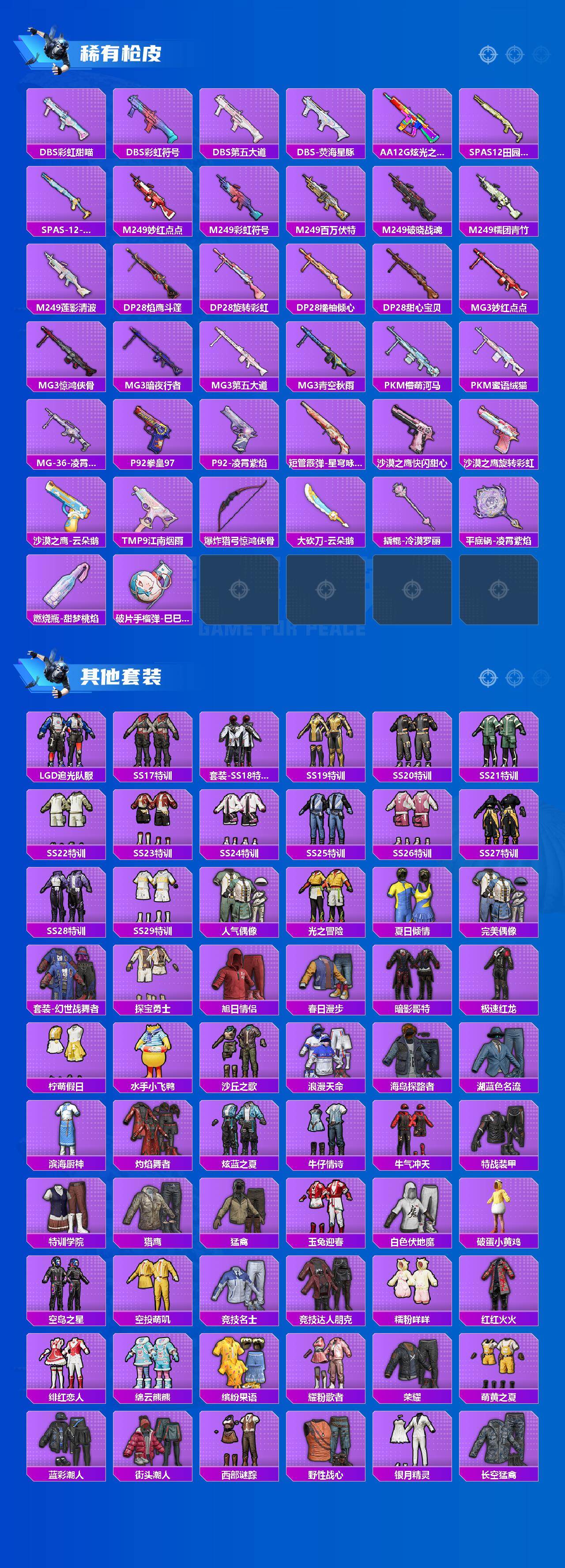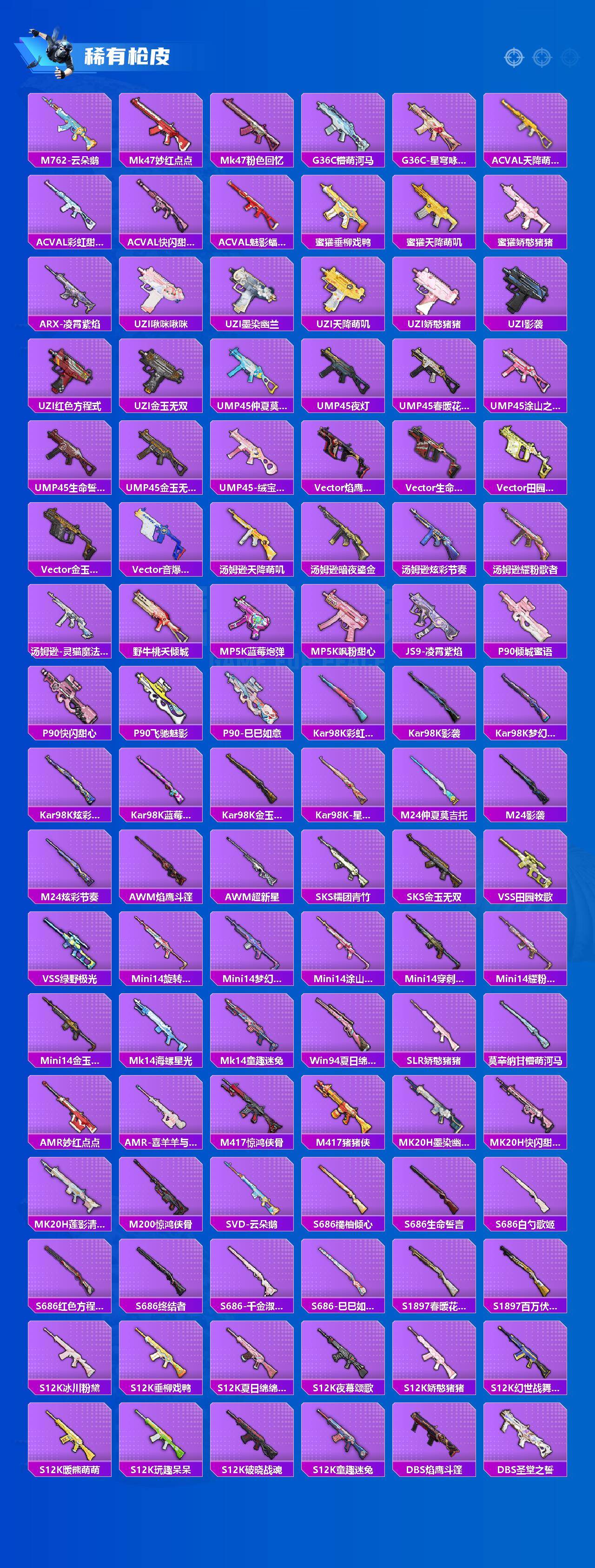 【粉色枪皮】:AKM-梦之光华,AKM-星际浪客,SCAR-L-纯梦嫁纱,SCAR-L-锦绣绵绵,M416-暖熊萌萌,GROZA-旋转彩虹,AUG-暖羊咩咩,P90-甜蜜草莓,Kar98K-巳巳如意,M417-第五大道,M249-蓝莓炮弹,DP-28-豹影疾电,MG-36-沧焰双生,平底锅-仲夏莫吉托