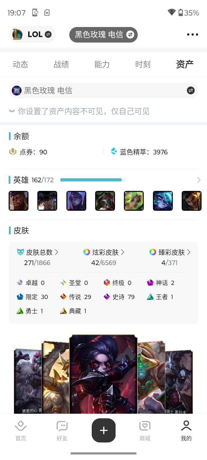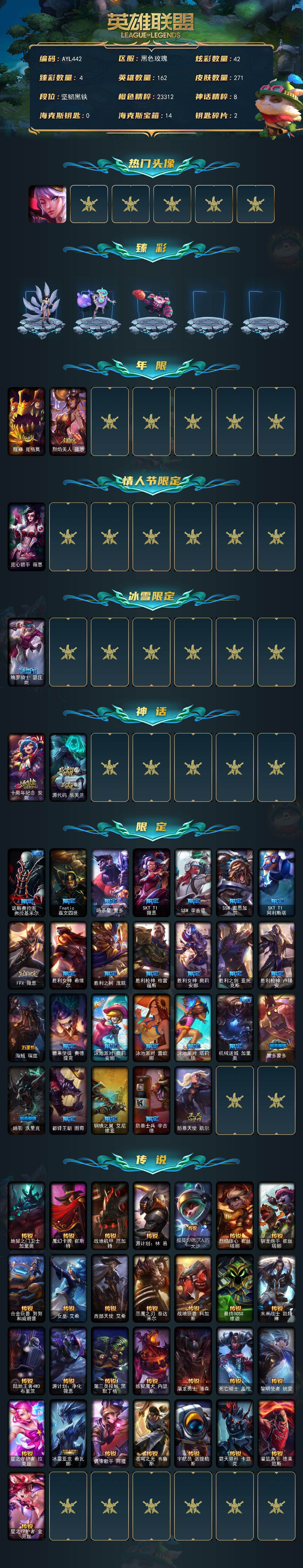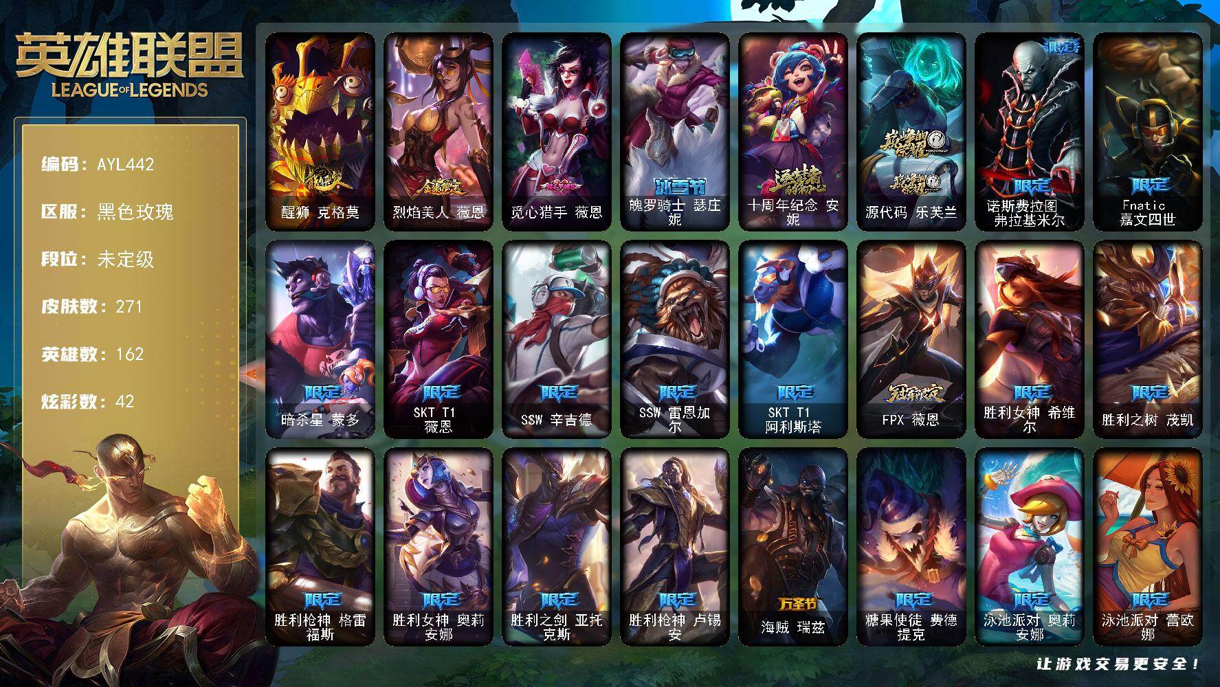 [15645909]【店主推荐捡漏号】(打十把匹配可排位)未定级段位-162英雄-271皮肤-42炫彩-0终极-2神话-30限定-29传说-79史诗