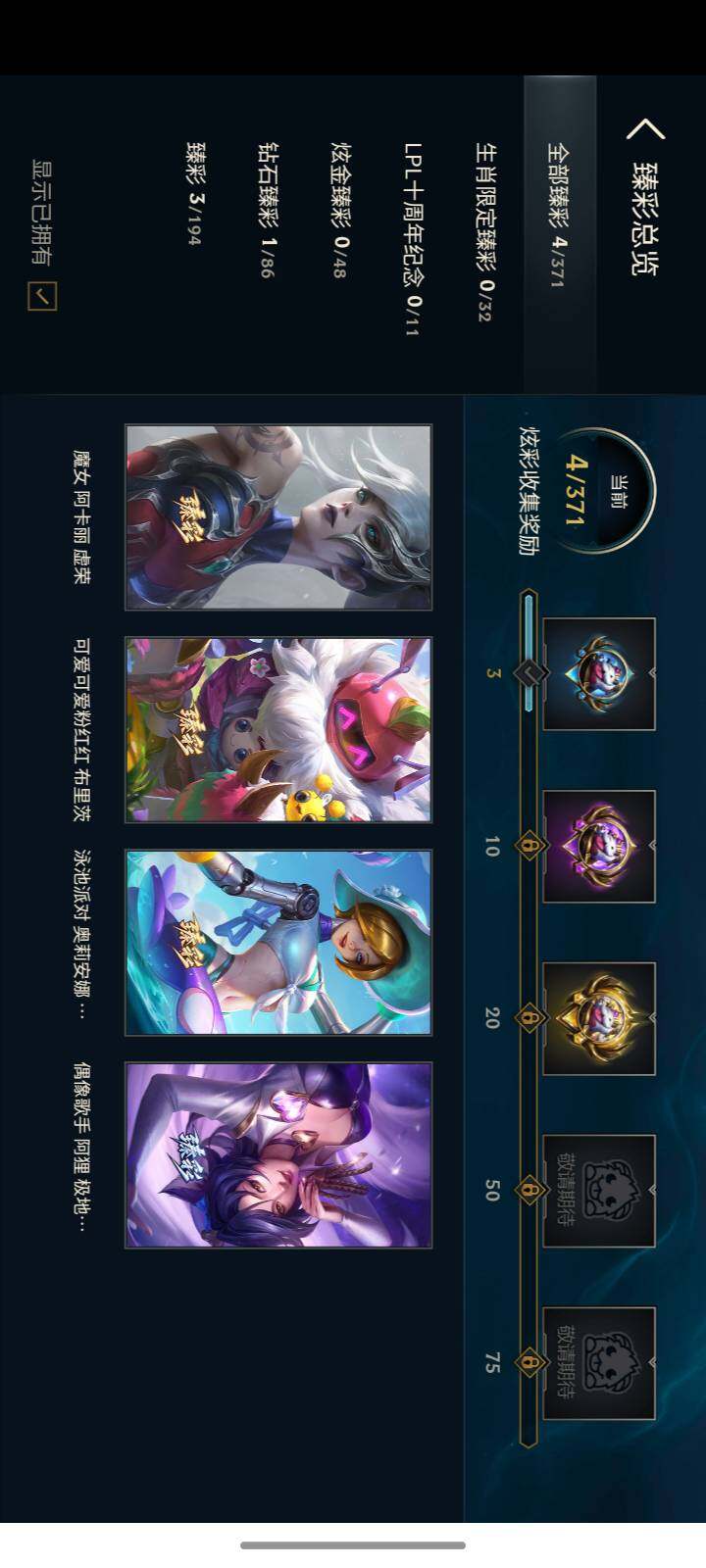 【臻彩皮肤】:偶像歌手阿狸极地雪莲,泳池派对奥莉安娜优雅珠光鲸,可爱可爱粉红红布里茨,魔女阿卡丽虚荣