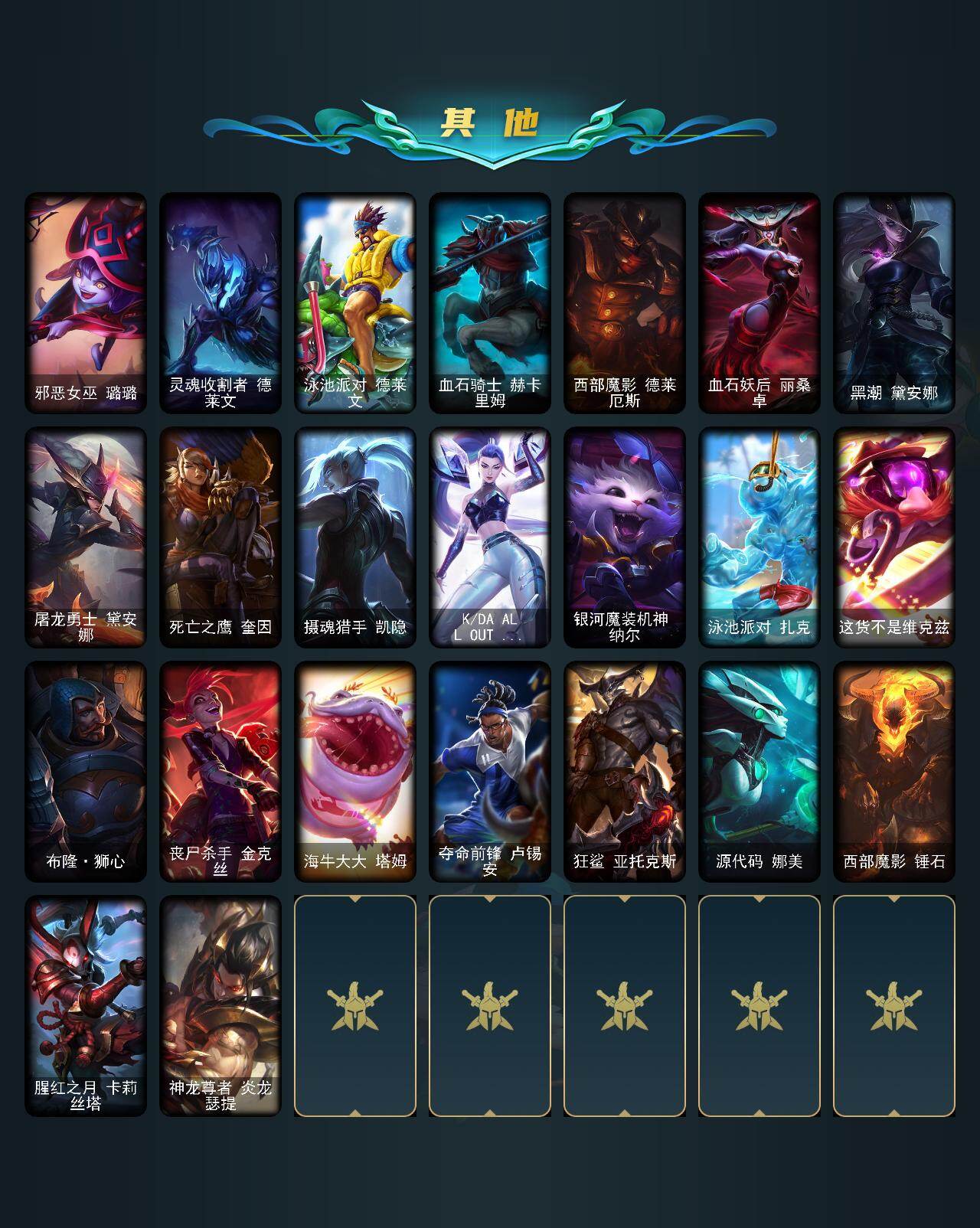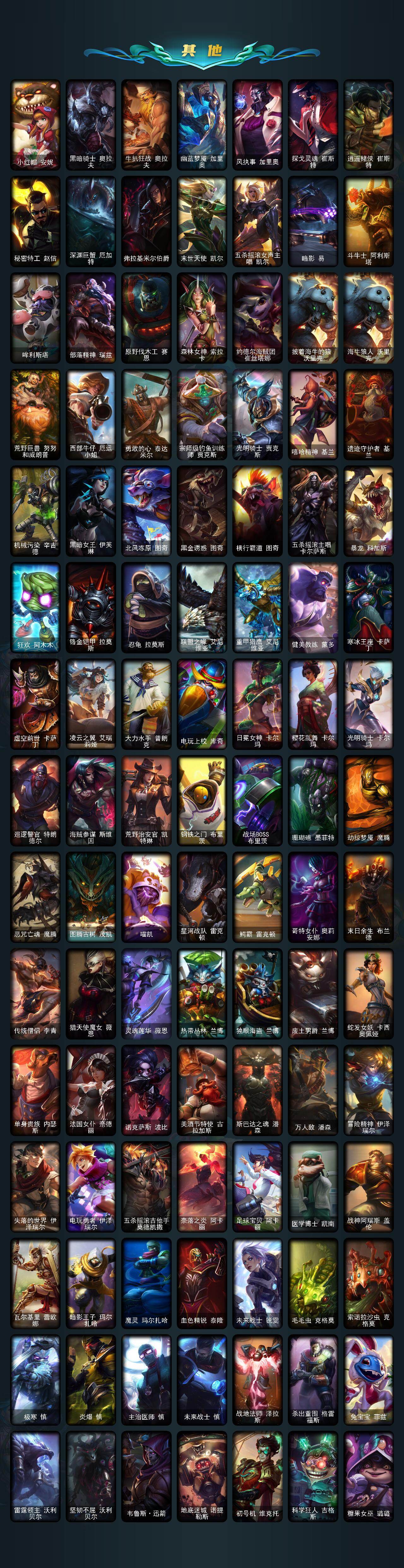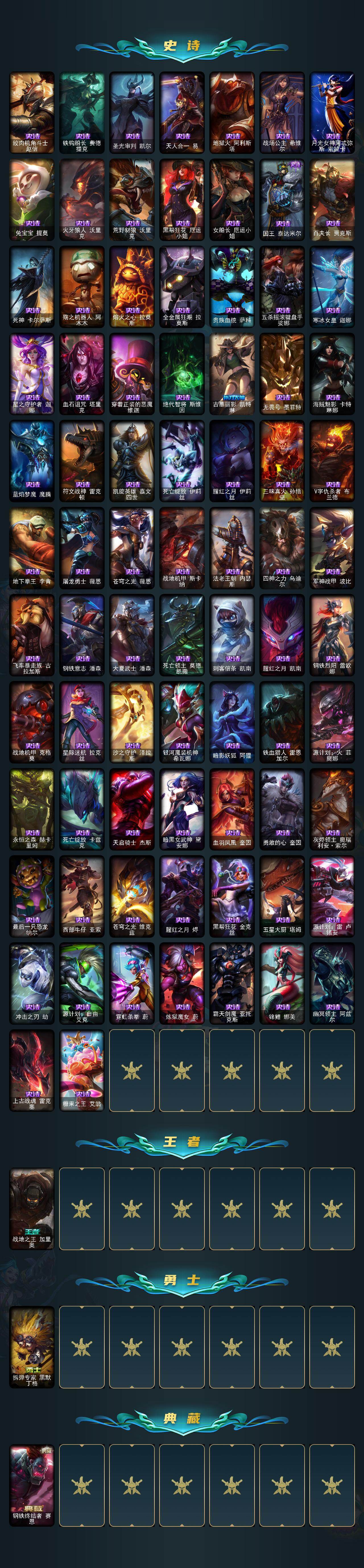 【史诗皮肤】:绞肉机角斗士赵信,铁钩船长费德提克,圣光审判凯尔,天人合一易,地狱火阿利斯塔,战场公主希维尔,月光女神阿忒弥斯索拉卡,兔宝宝提莫,火牙狼人沃里克,荒野豺狼沃里克,黑帮狂花厄运小姐,女船长厄运小姐,国王泰达米尔,百夫长贾克斯,死神卡尔萨斯,殇之机器人阿木木,熔火之心拉莫斯,全金属狂潮拉莫斯,贵族血统萨科,五杀摇滚键盘手娑娜,寒冰女皇迦娜,星之守护者迦娜,血石诅咒塔里克,穿着正装的恶魔维迦,绝代智将斯维因,古墓丽影凯特琳,无畏号墨菲特,海贼魅影卡特琳娜,蓝焰梦魔魔腾,符文战神雷克顿,凯旋英雄嘉文四世,死亡绽放伊莉丝,腥红之月伊莉丝,三昧真火孙悟空,V字仇杀者布兰德,地下拳王李青,屠龙勇士薇恩,苍穹之光薇恩,战地机甲斯卡纳,法老王朝内瑟斯,四神之力乌