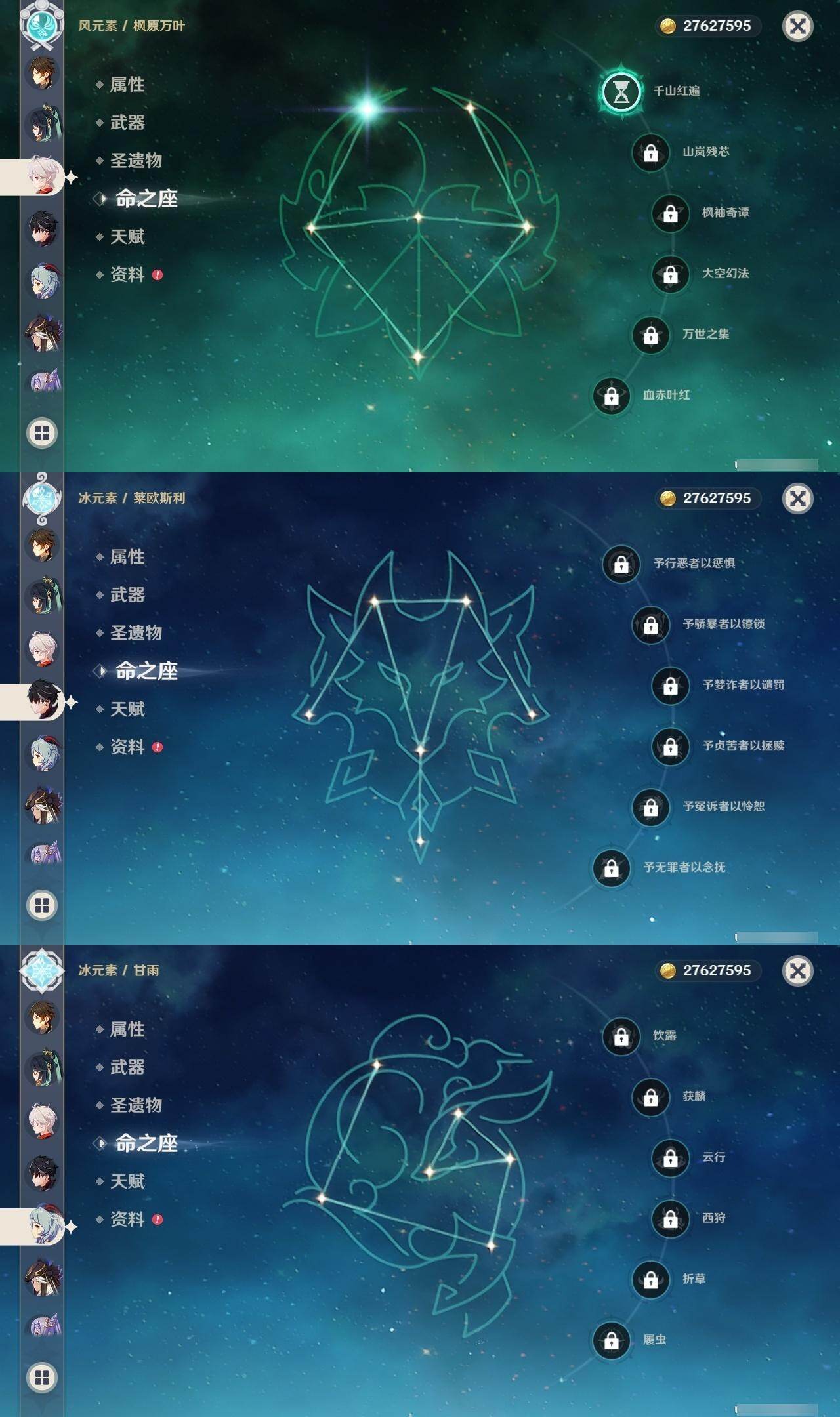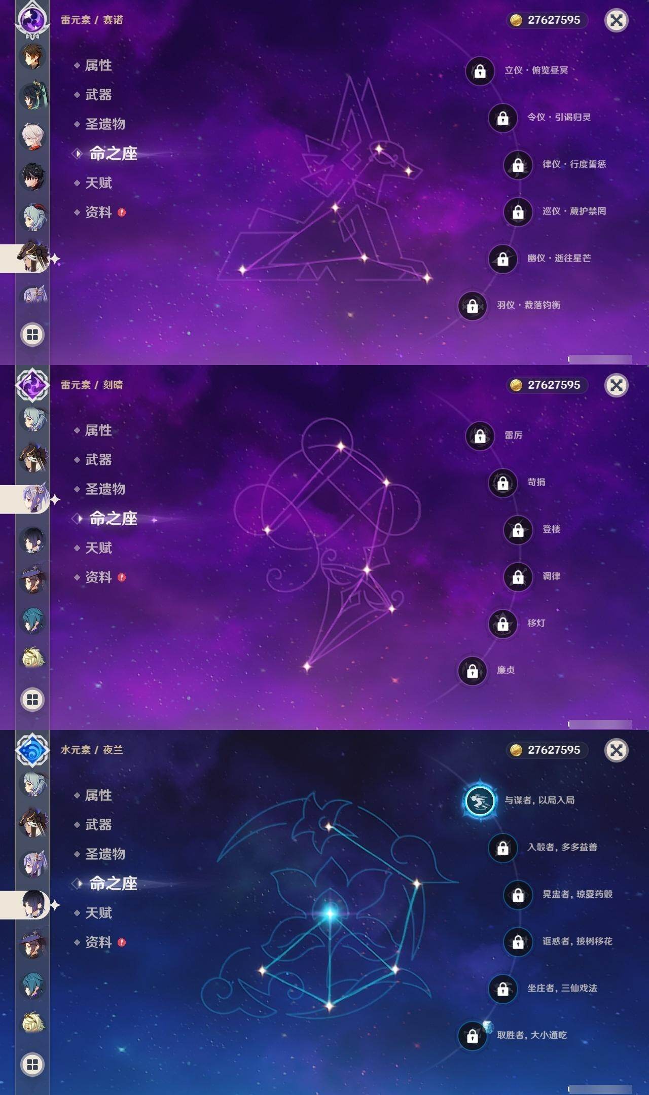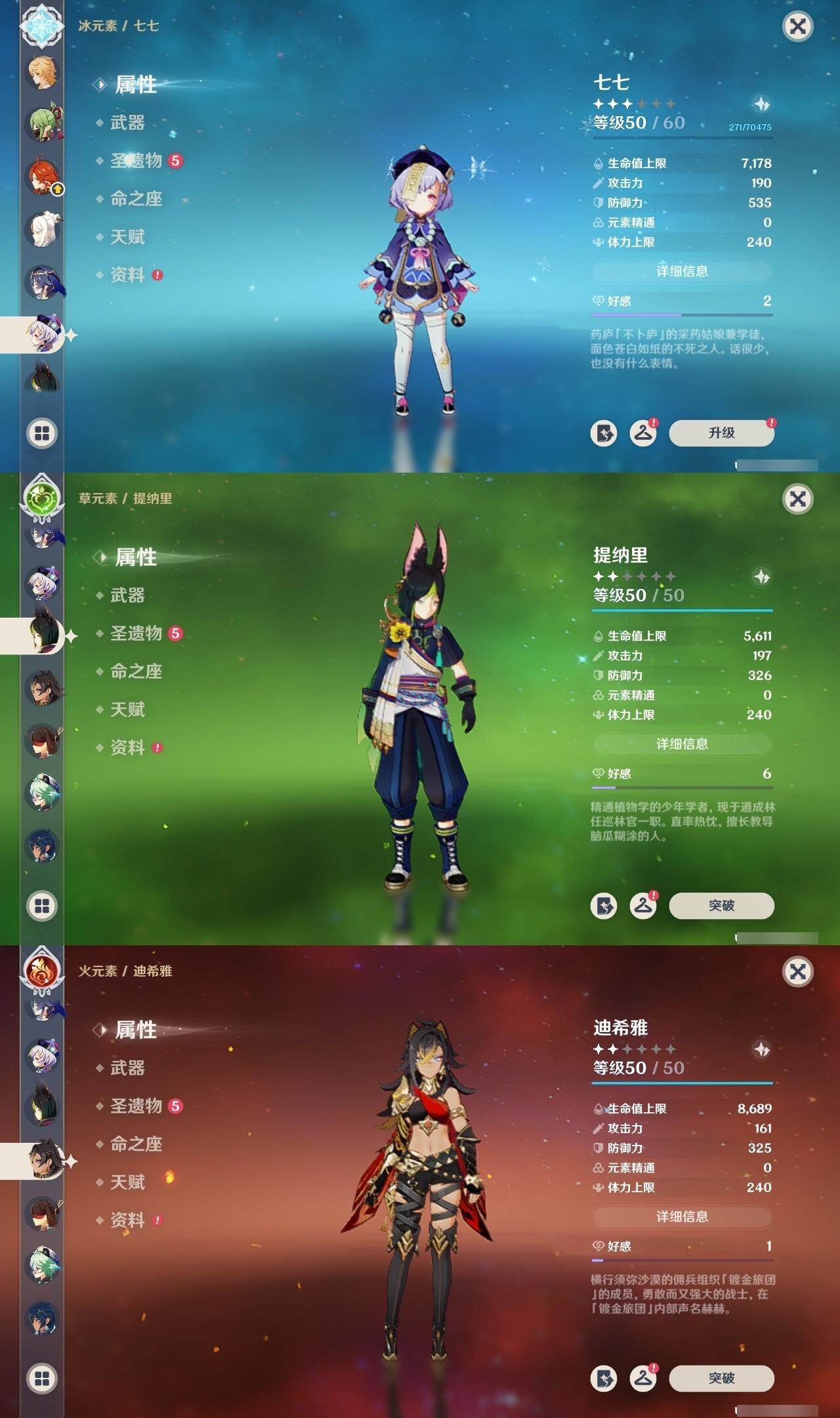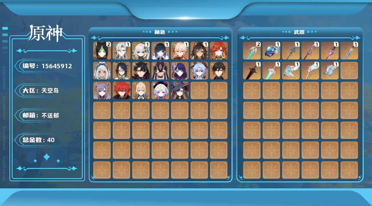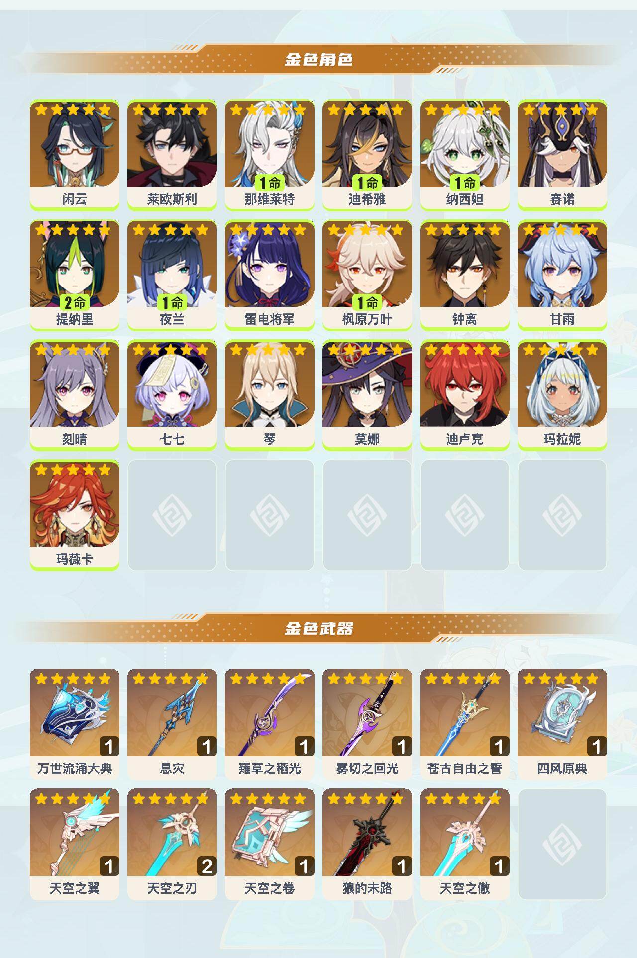 0命闲云,0命莱欧斯利,1命那维莱特,1命迪希雅,1命纳西妲,0命赛诺,2命提纳里,1命夜兰,0命雷电将军,1命枫原万叶,0命钟离,0命甘雨,0命刻晴,0命七七,0命琴,0命莫娜,0命迪卢克,0命玛拉妮,0命玛薇卡,精1万世流涌大典,精1息灾,精1薙草之稻光,精1雾切之回光,精1苍古自由之誓,精1四风原典,精1天空之翼,精2天空之刃,精1天空之卷,精1狼的末路,精1天空之傲