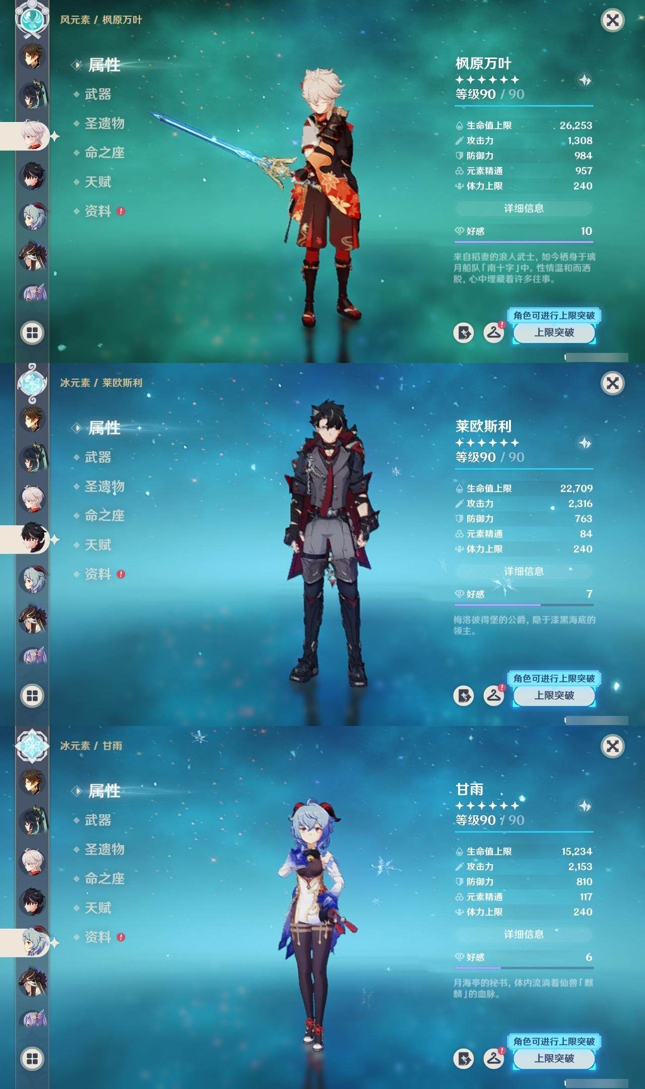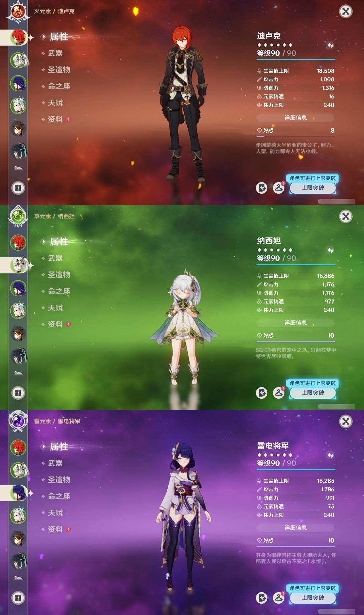 迪卢克,雷电将军,钟离,枫原万叶,甘雨,刻晴,莫娜,七七,琴