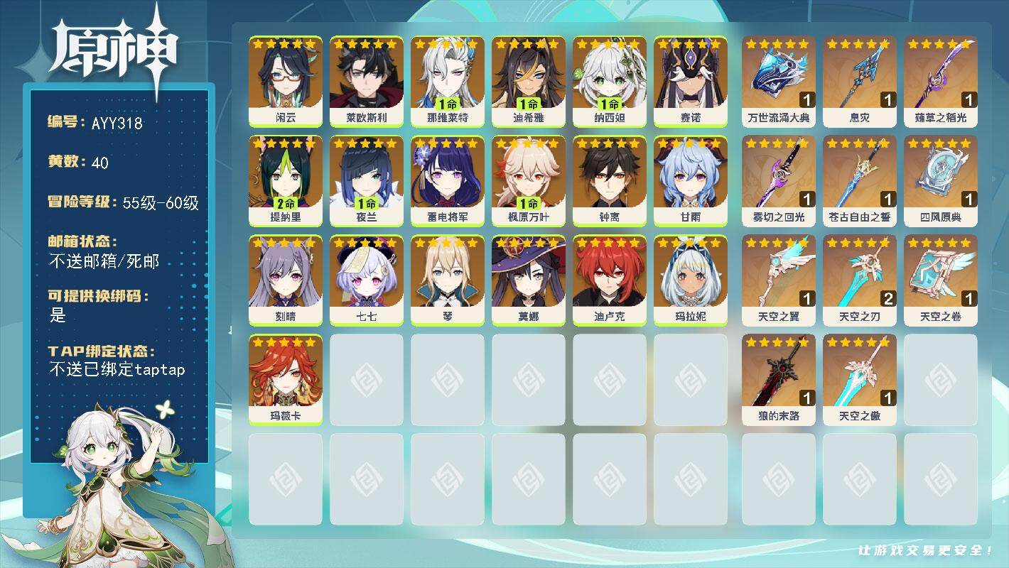 [15645912]【店主推荐捡漏号】59级/40黄/男主/19个五星角色/13个五星武器 0命闲云,0命莱欧斯利,1命那维莱特,1命迪希雅,1命纳西妲,0命赛诺,2命提纳里,1命夜兰,0命雷电将军,1命枫原万叶,0命钟离,0命甘雨,0命刻晴,0命七七,0命琴,0命莫娜,0命迪卢克,0命玛拉妮,0命玛薇卡,精1万世流涌大典,精1息灾,精1薙草之稻光,精1雾切之回光,精1苍古自由之誓,精1四风原典,精1天空之翼,精2天空之刃,精1天空之卷,精1狼的末路,精1天空之傲