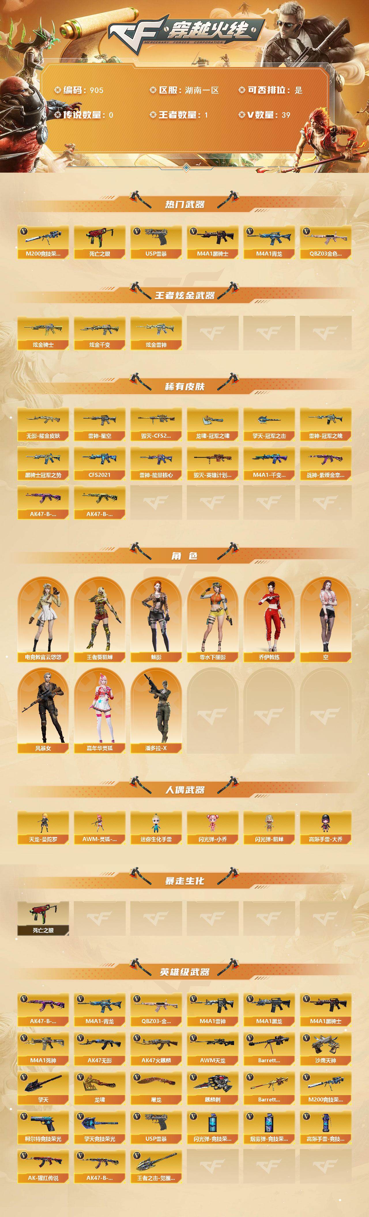 [15646180]湖南一区-39V-1王者-3炫金 【热门武器】:QBZ03-金色蔷薇,M4A1-青龙,M200-竞技荣光,死亡之眼,M4A1-黑骑士,USP-雷暴 【王者炫金武器】:炫金骑士,炫金千变,炫金雷神 【皮肤】:雷神-能量核心,雷神-星空,雷神-冠军之魄,毁灭-CFS2020,毁灭-英雄计划 皮肤,M4A1-千变-孔明皮肤,黑骑士-冠军之势,黑骑士-CFS2021,无影耀金皮肤,战神-紫绶金章皮肤,AK47-B-常胜将军-曹操*2,AK47-B-常胜将军-孙权,龙啸-冠军之啸,擎天-冠军之击 【角色】:魅影,电竞教官-云悠悠,王者-葵-貂蝉,乔伊教练,空,风暴女,嘉年华灵狐,零-水下丽影,潘多拉-X 【人偶武器】:天龙-曼陀罗,AWM-灵狐-15周年嘉年华,迷你生化手雷,闪光弹-小乔,闪光弹-貂蝉,高爆手雷-大乔 【暴走生化】:死亡之眼 【英雄级武器】:AK47-火麒麟,M4A1-黑龙,M4A1-雷神,M4A1-黑骑士,AK47-无影*2,M4A1-死神,M4A1-青龙,QBZ03-金色蔷薇,AK-47-猩红传说,AK47-B-战神,AK47-B-常胜将军,AWM-天龙,Barrett-毁灭,Barrett-朱雀,M200-竞技荣光,沙鹰-天神,USP-雷暴,柯尔特-竞技荣光,屠龙,龙啸,擎天,麒麟刺,擎天-竞技荣光,王者之击-觉醒版,高爆手雷-竞技荣光*2,闪光弹-竞技荣光*4,烟雾弹-竞技荣光*2 【道具】:BS战队炫彩背包,女皇终结者-背包,超级背包,女皇终结者-魔龙之吻,绿色巨人,灵魂忍者*2,变异宝贝,迷雾幽灵*2,夺命之镰,防化服*3,金色流光-枪王排位*2,星辰流光-枪王排位,流光-鎏金之域,枪王排位28赛季金色流光,C4-黑曜,C4-沙漠,防弹头盔*3,防弹衣*3,C4工具钳*3,手雷包*3 【特殊枪械】:1黑骑士