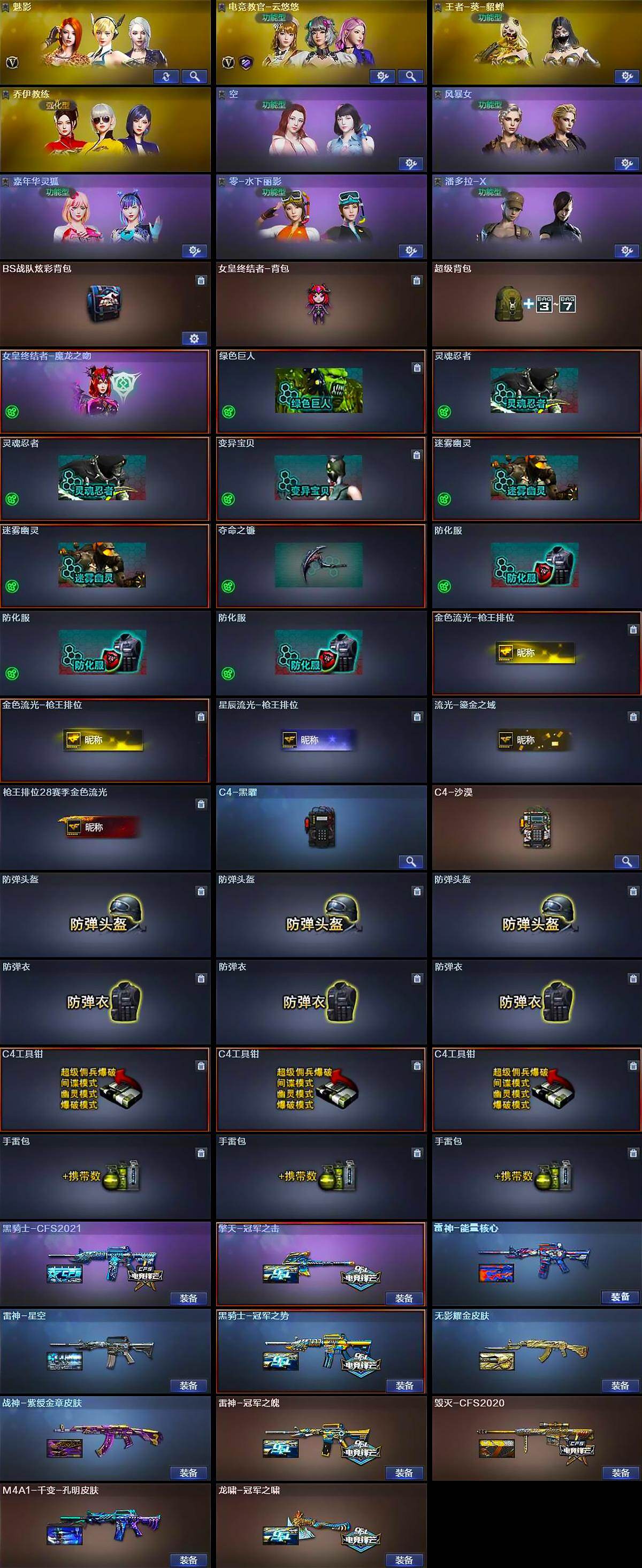 【皮肤】:雷神-能量核心,雷神-星空,雷神-冠军之魄,毁灭-CFS2020,毁灭-英雄计划 皮肤,M4A1-千变-孔明皮肤,黑骑士-冠军之势,黑骑士-CFS2021,无影耀金皮肤,战神-紫绶金章皮肤,AK47-B-常胜将军-曹操*2,AK47-B-常胜将军-孙权,龙啸-冠军之啸,擎天-冠军之击